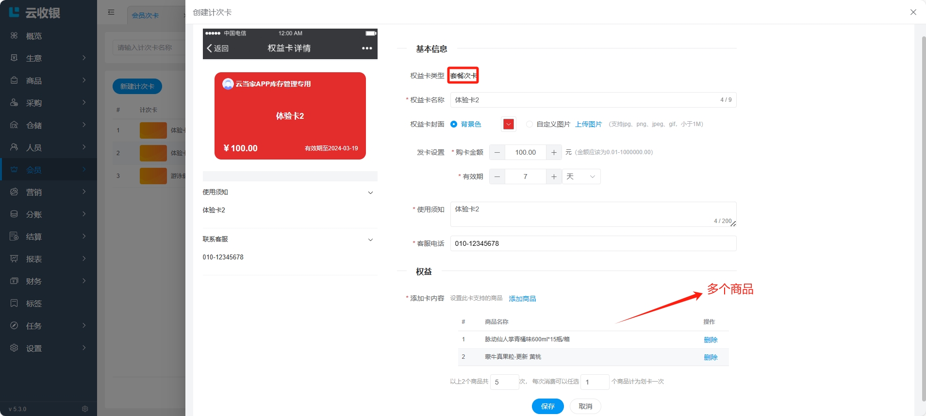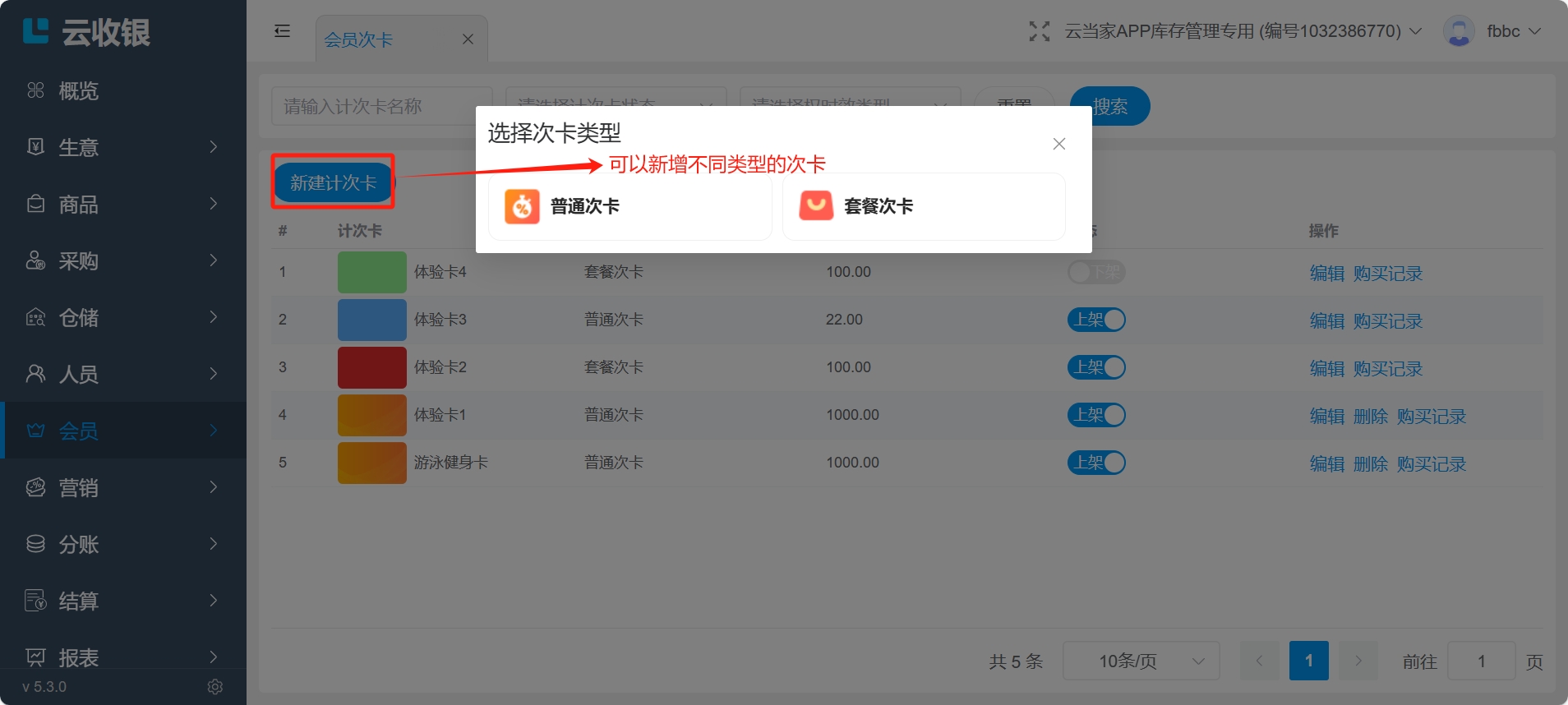 可以新增两种类型的次卡(普通次卡/套餐次卡)。