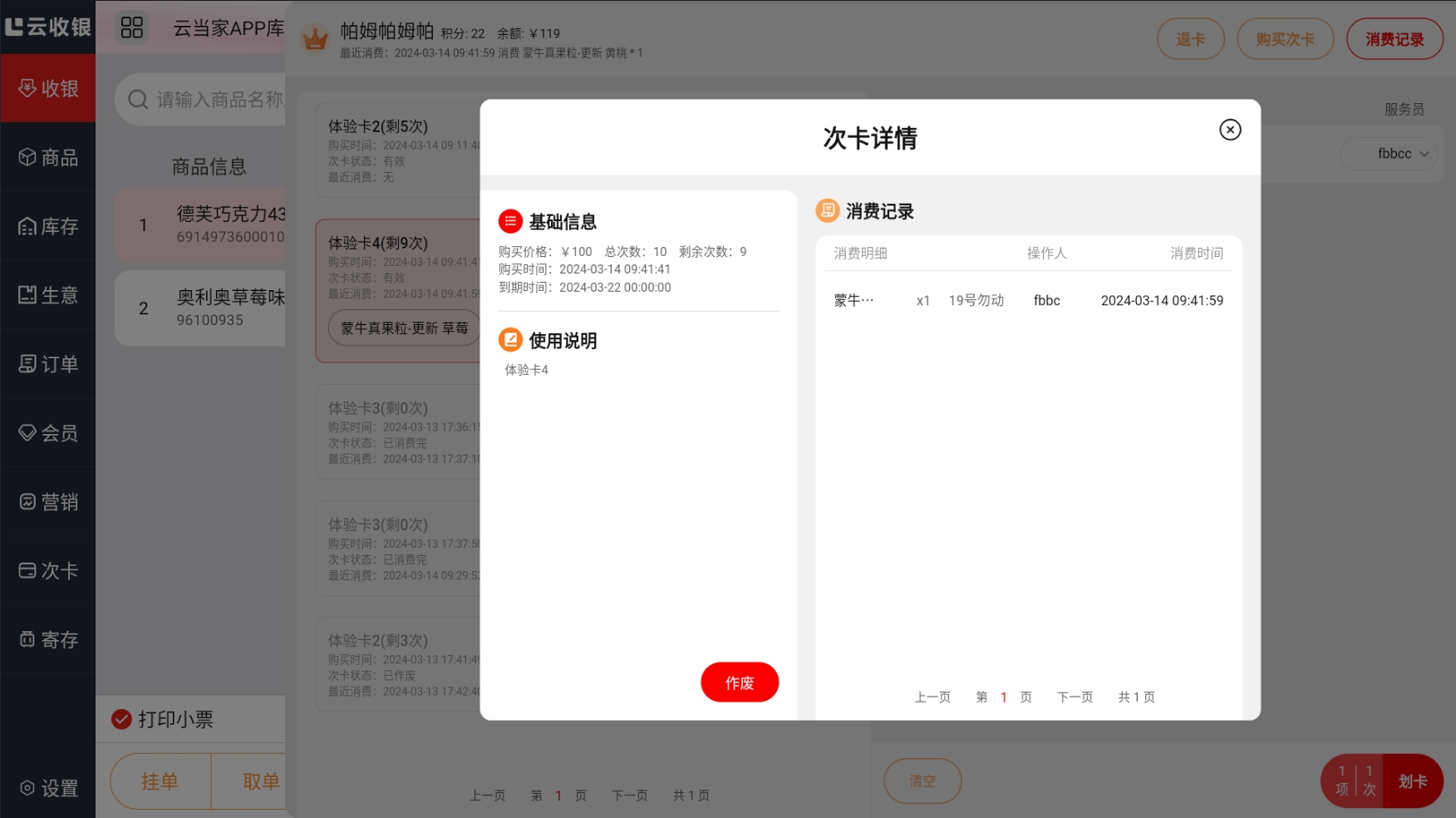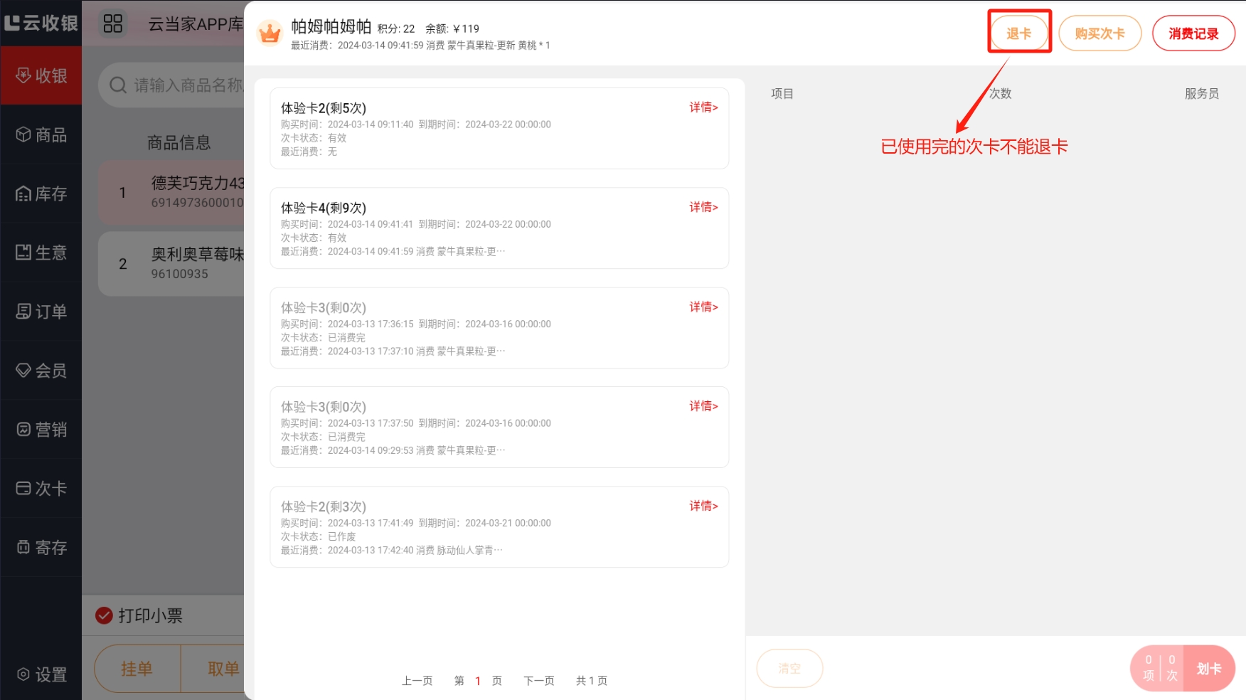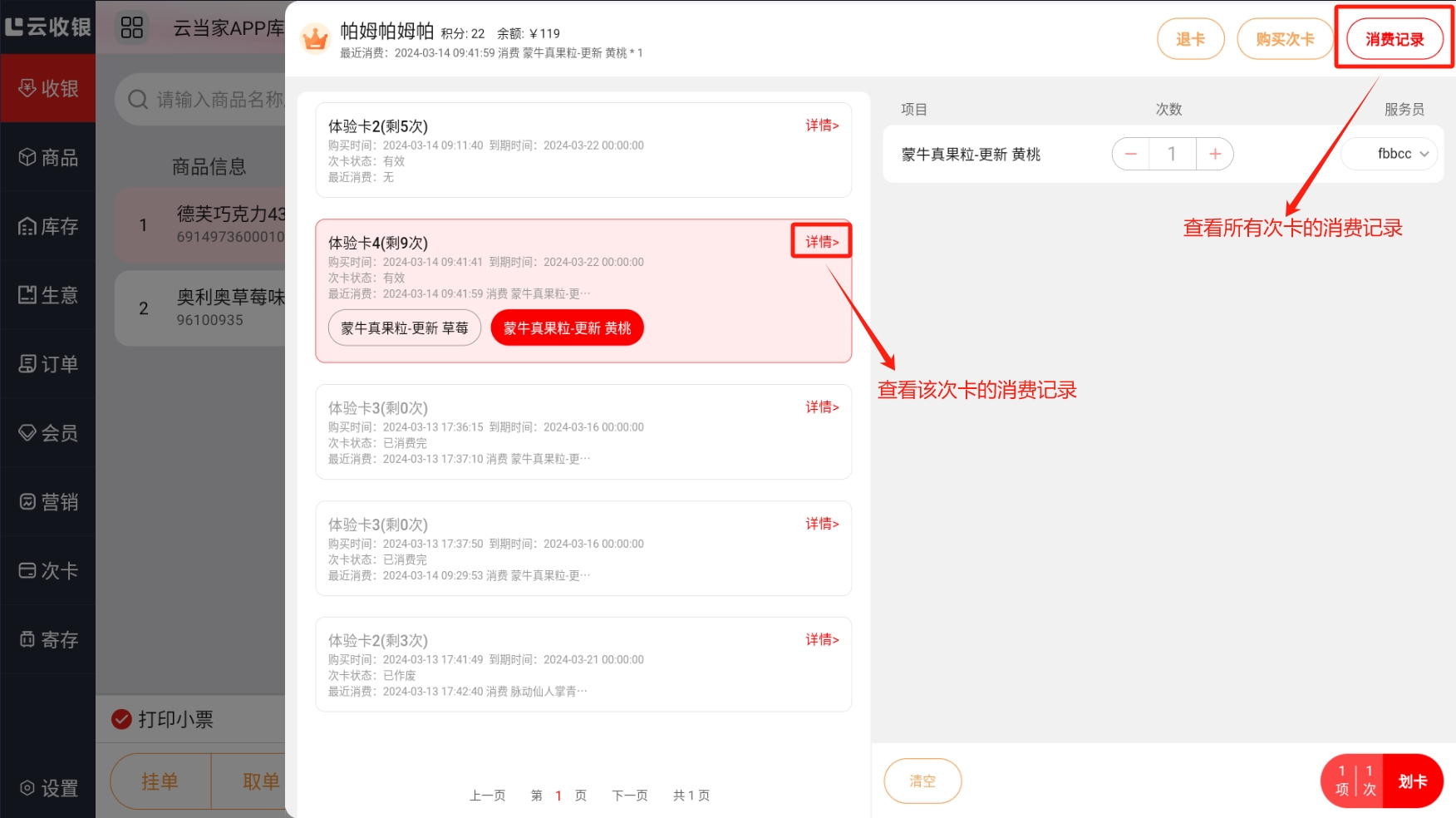 收银端可以查看次卡的消费记录、消费明细等信息。
