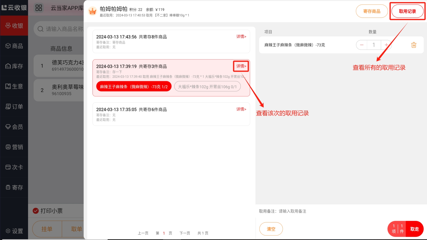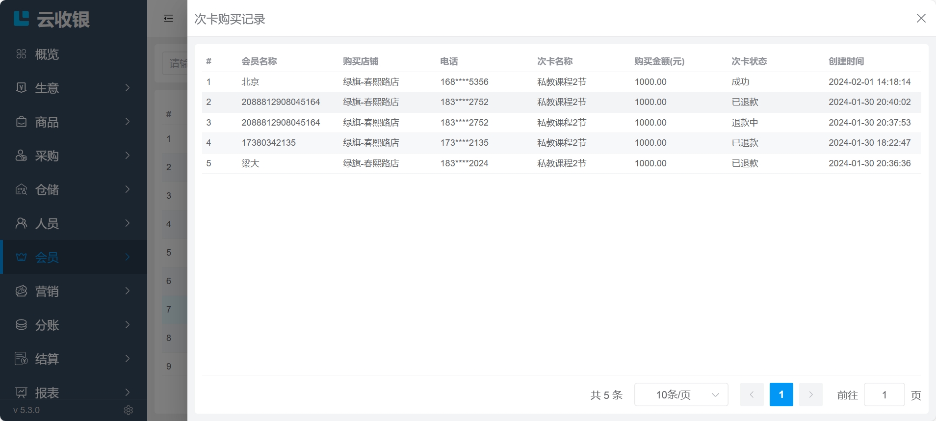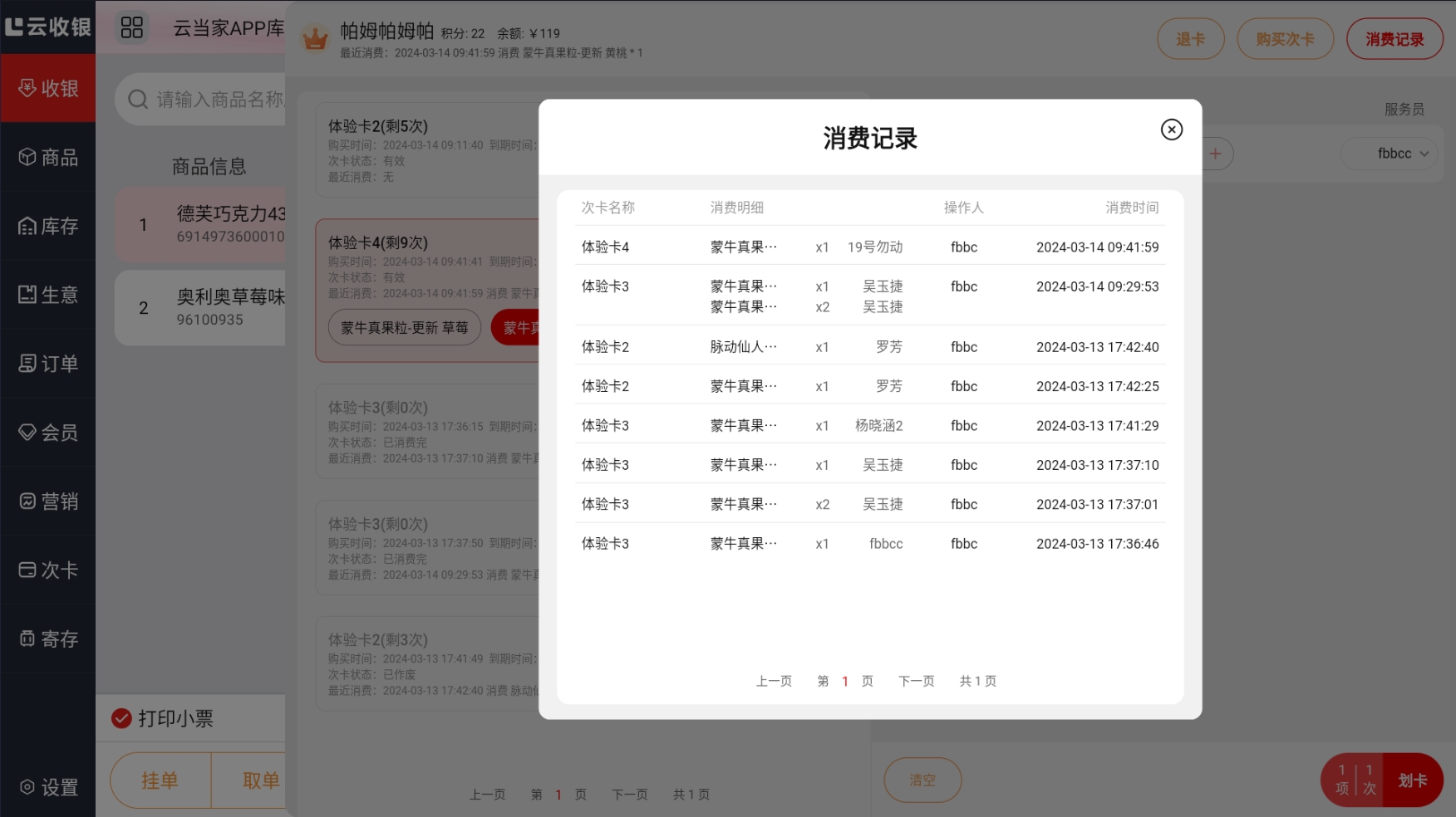 收银端可以查看次卡的消费记录、消费明细等信息。