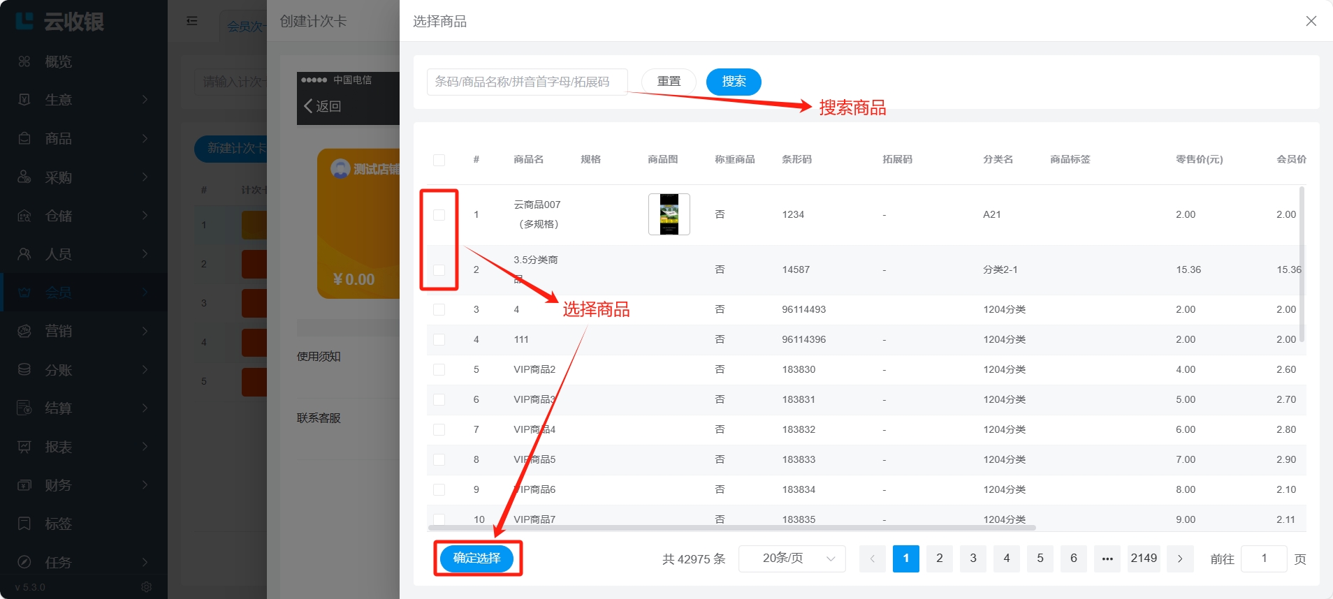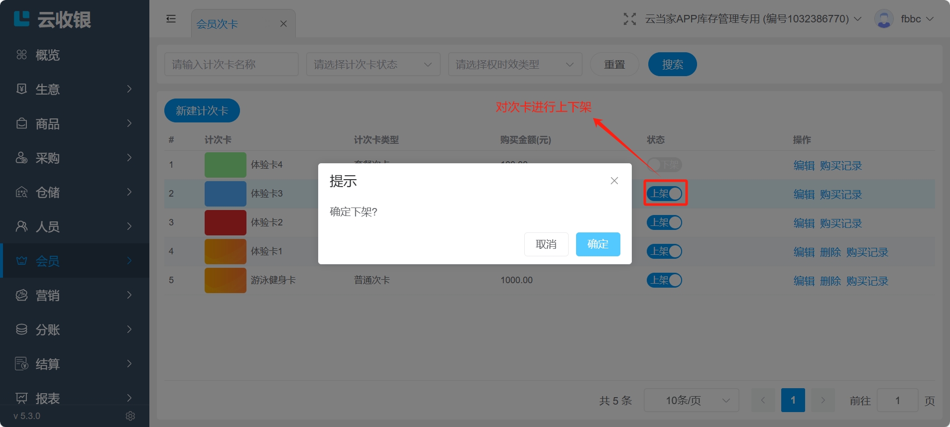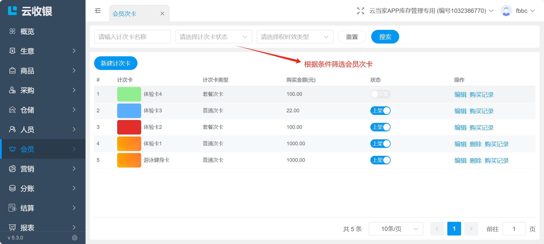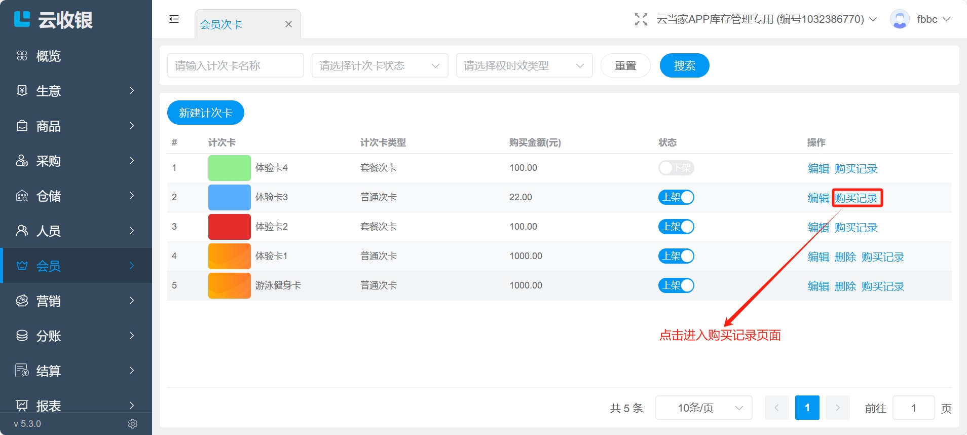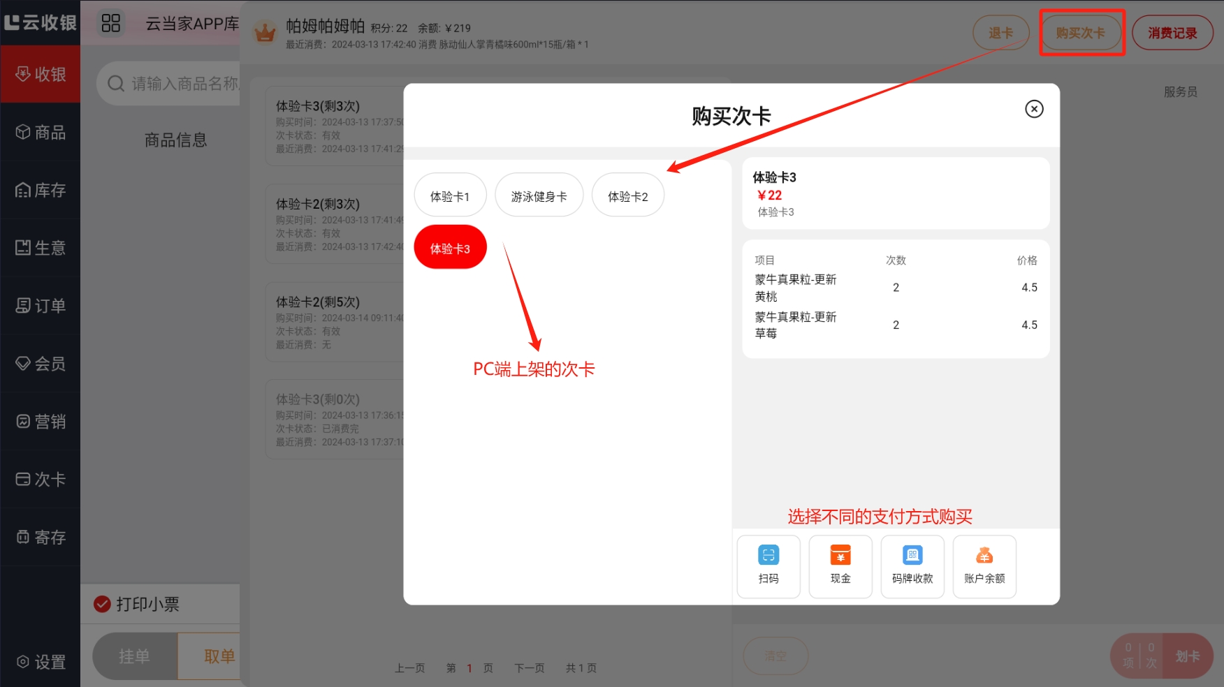 PC端新增的次卡设置为上架状态后,收银端就可以购买PC端已上架的次卡。