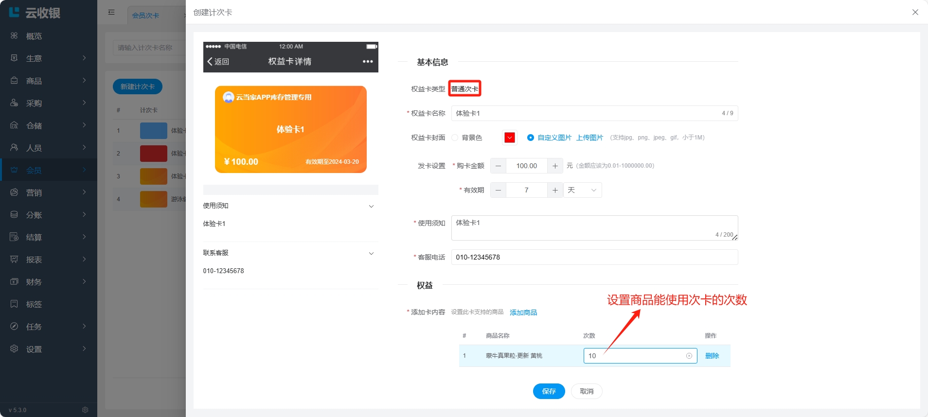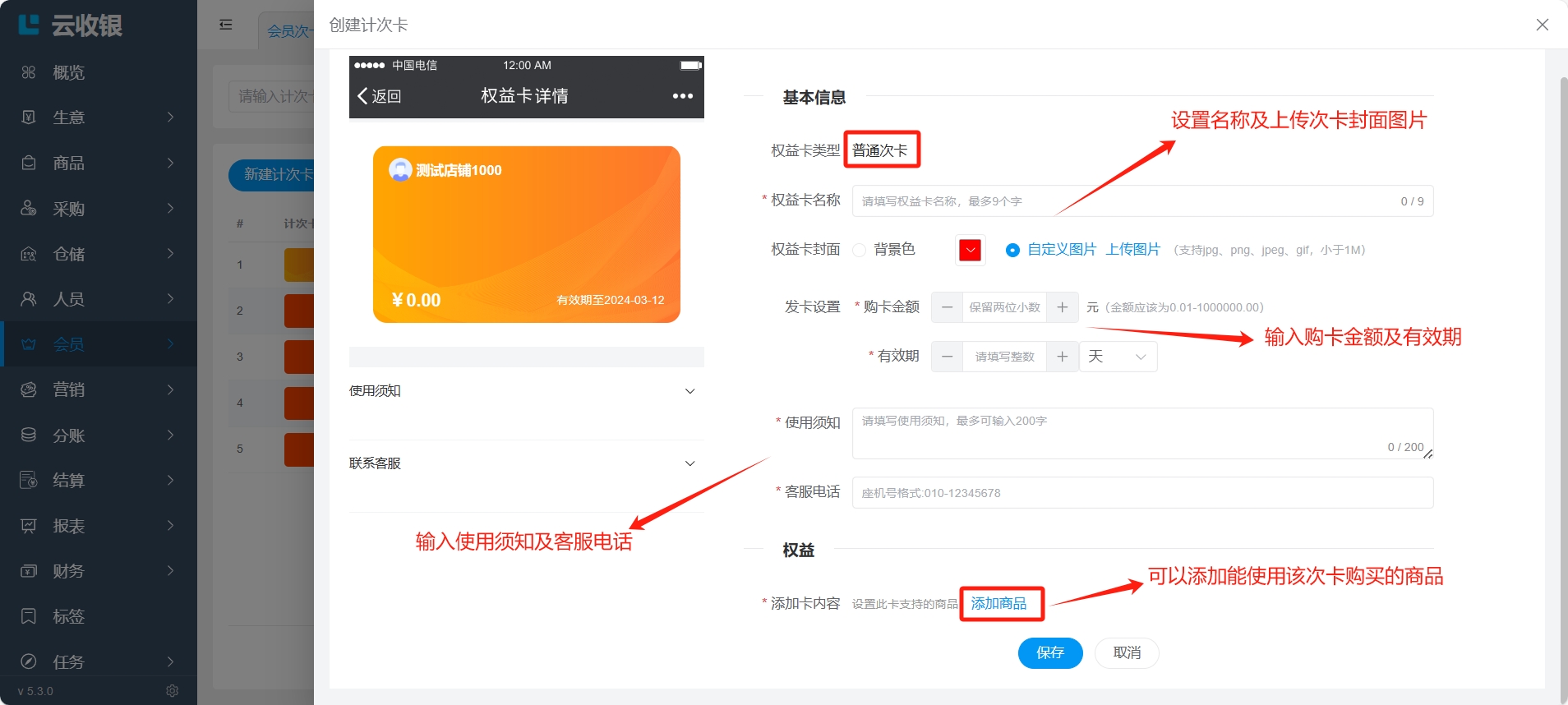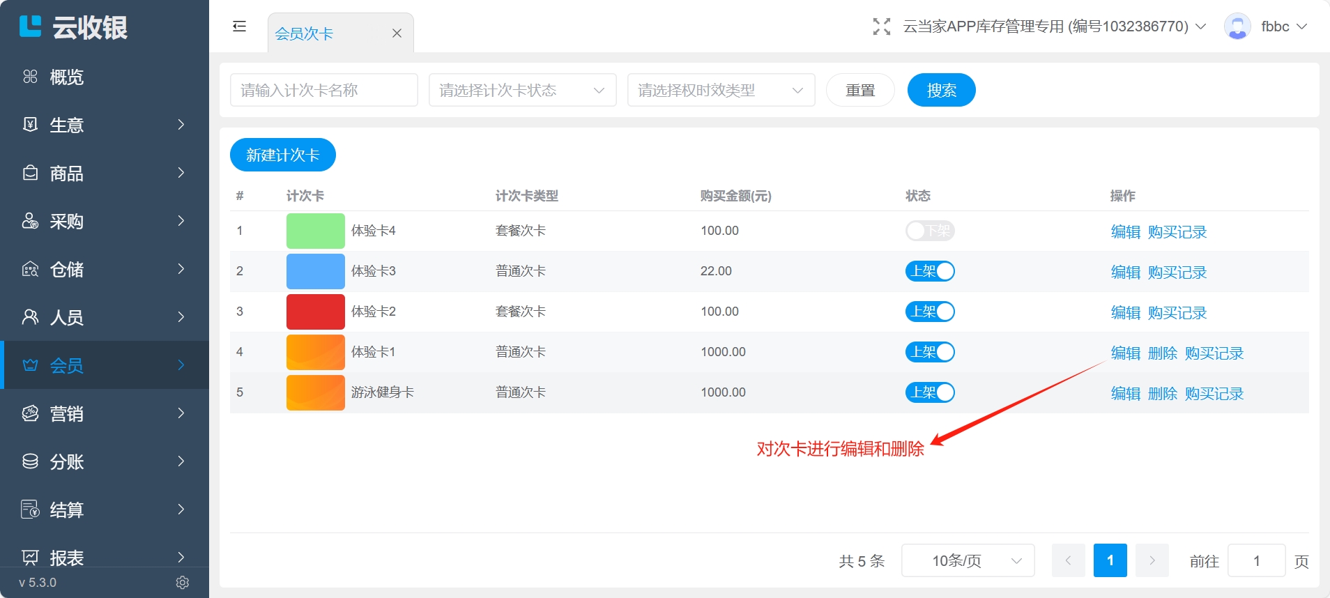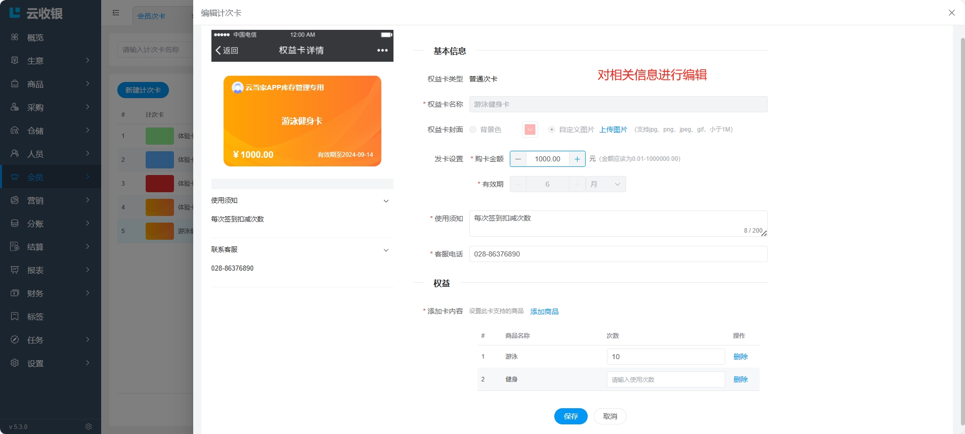 在PC端的会员次卡页面可以对次卡进行新增和编辑等操作。