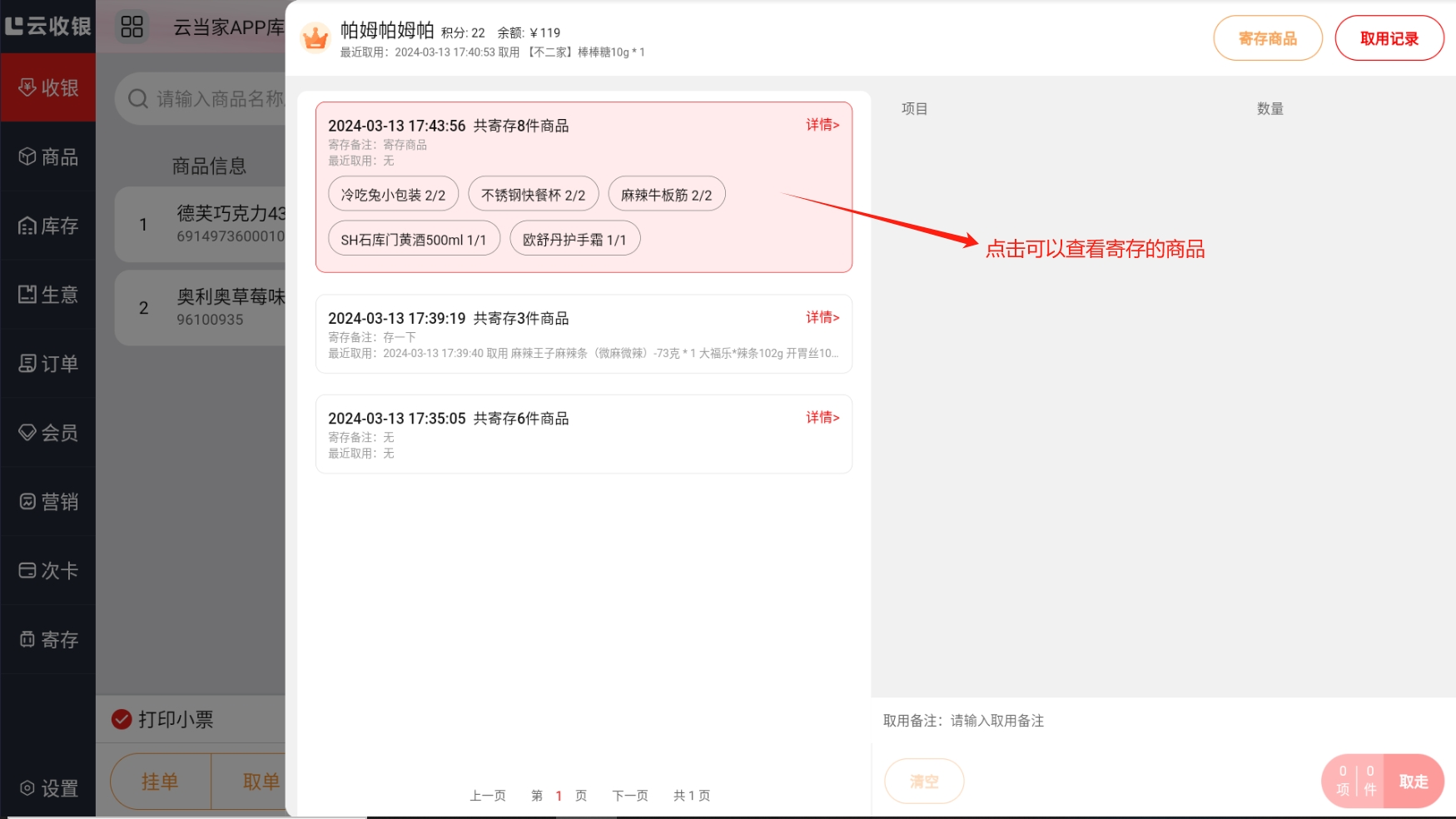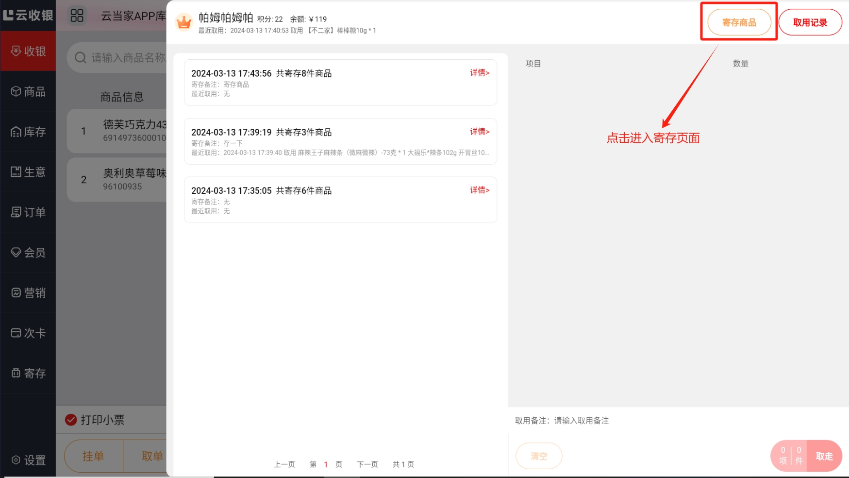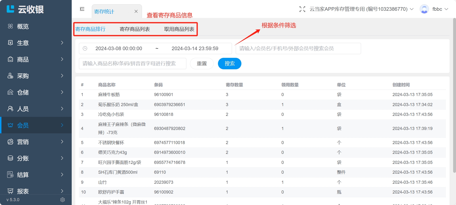 寄存统计页面可以对会员寄存的商品信息进行查看。