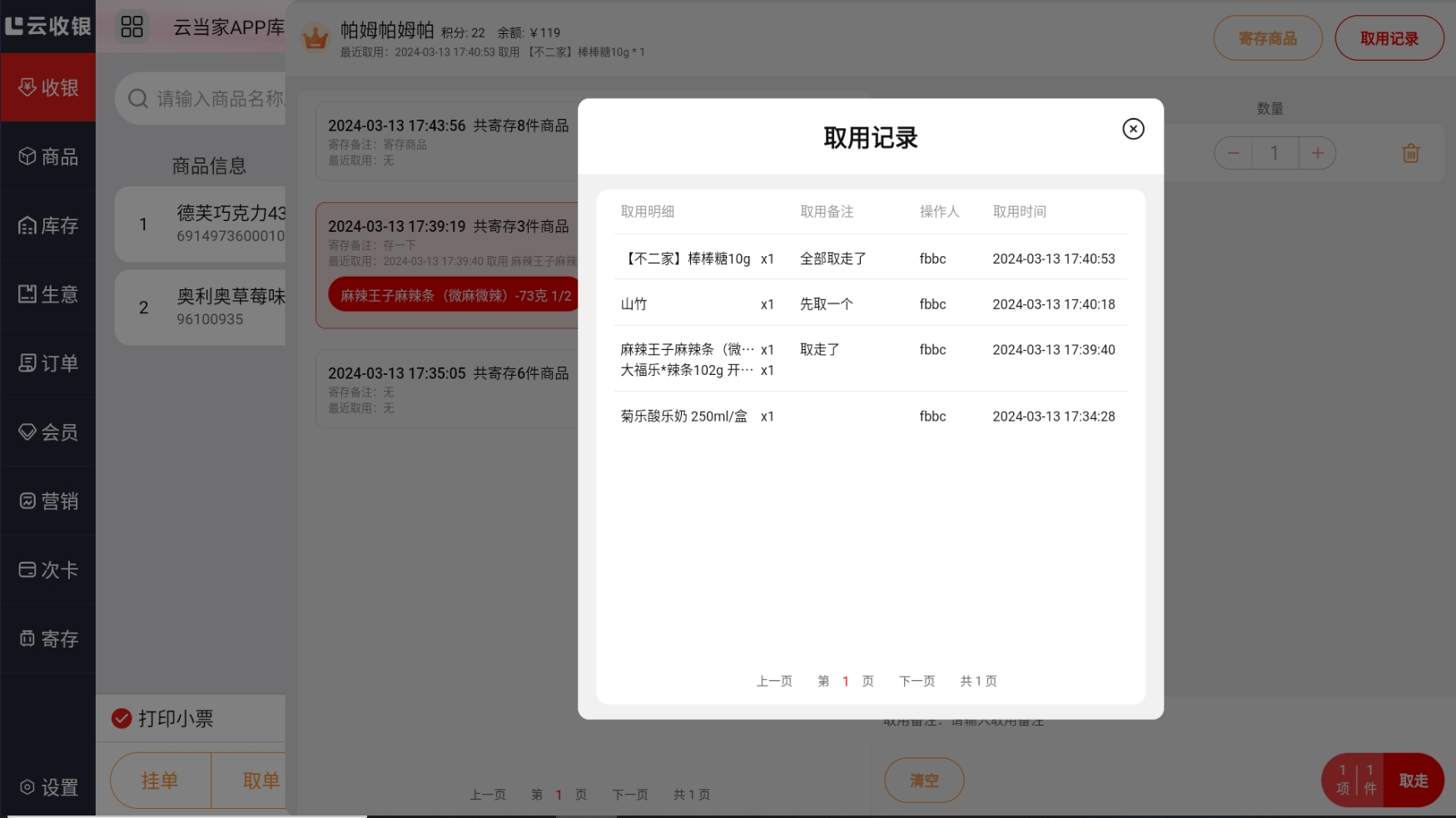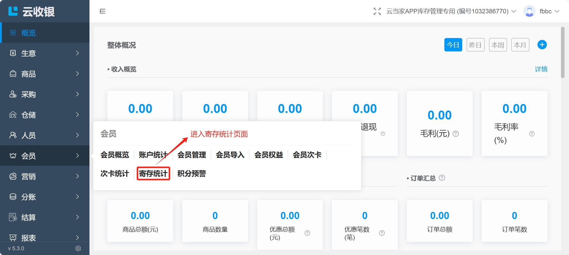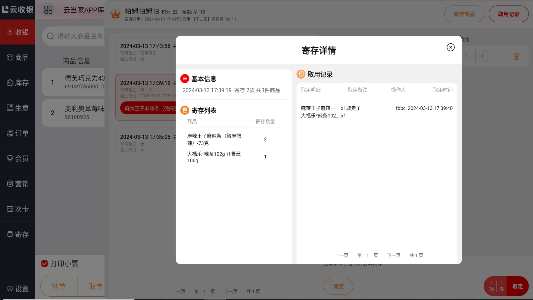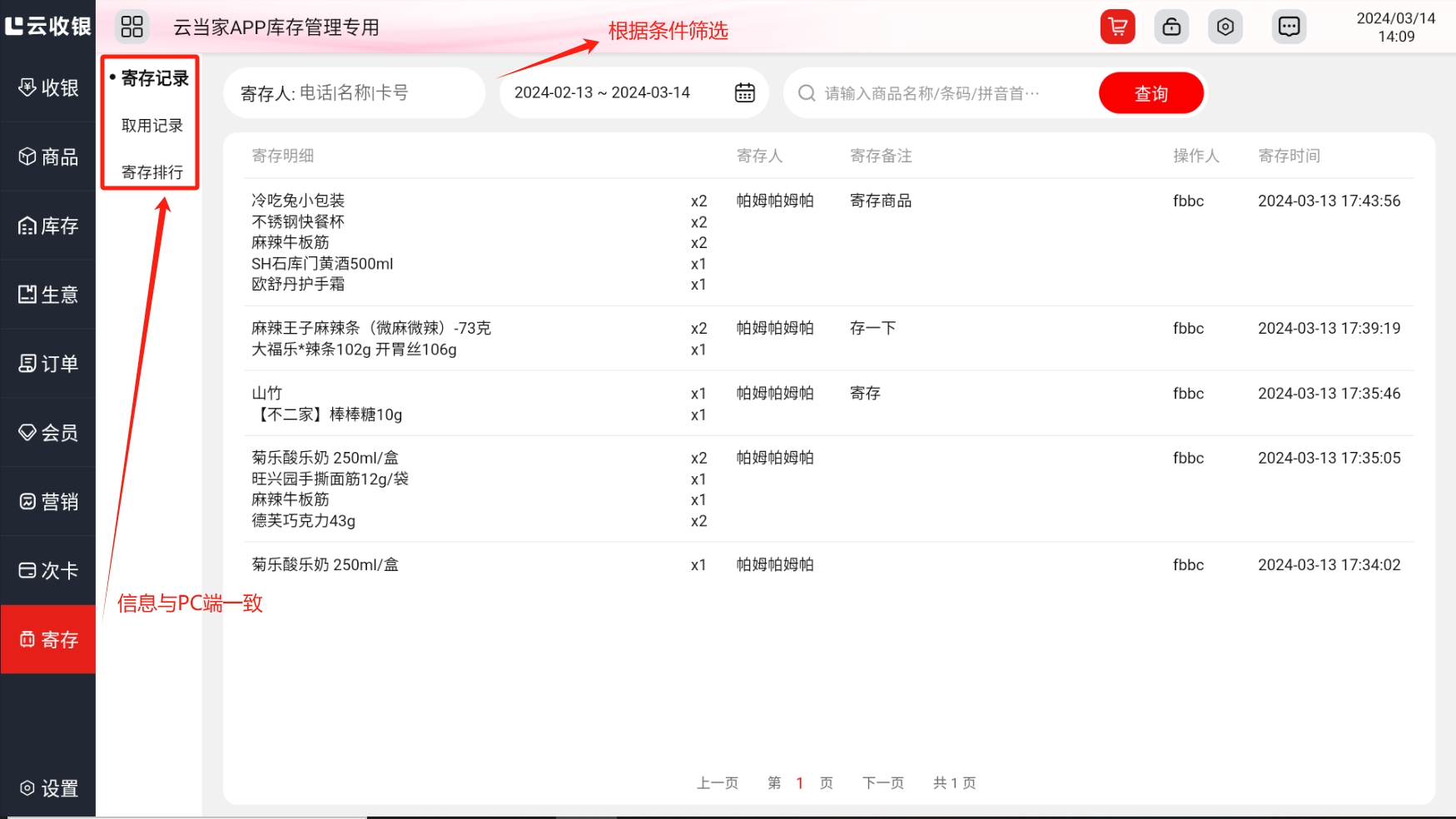 寄存统计页面可以对会员寄存的商品信息进行查看。