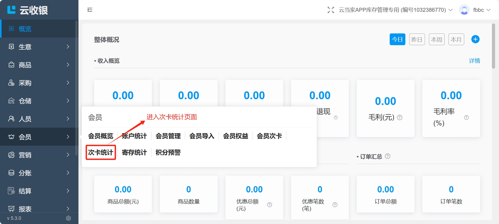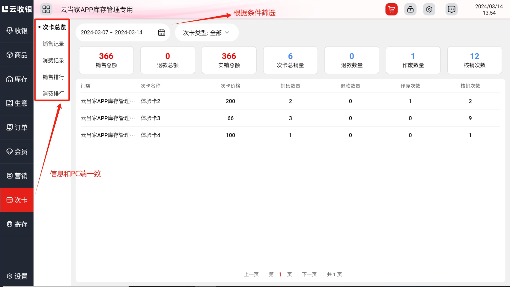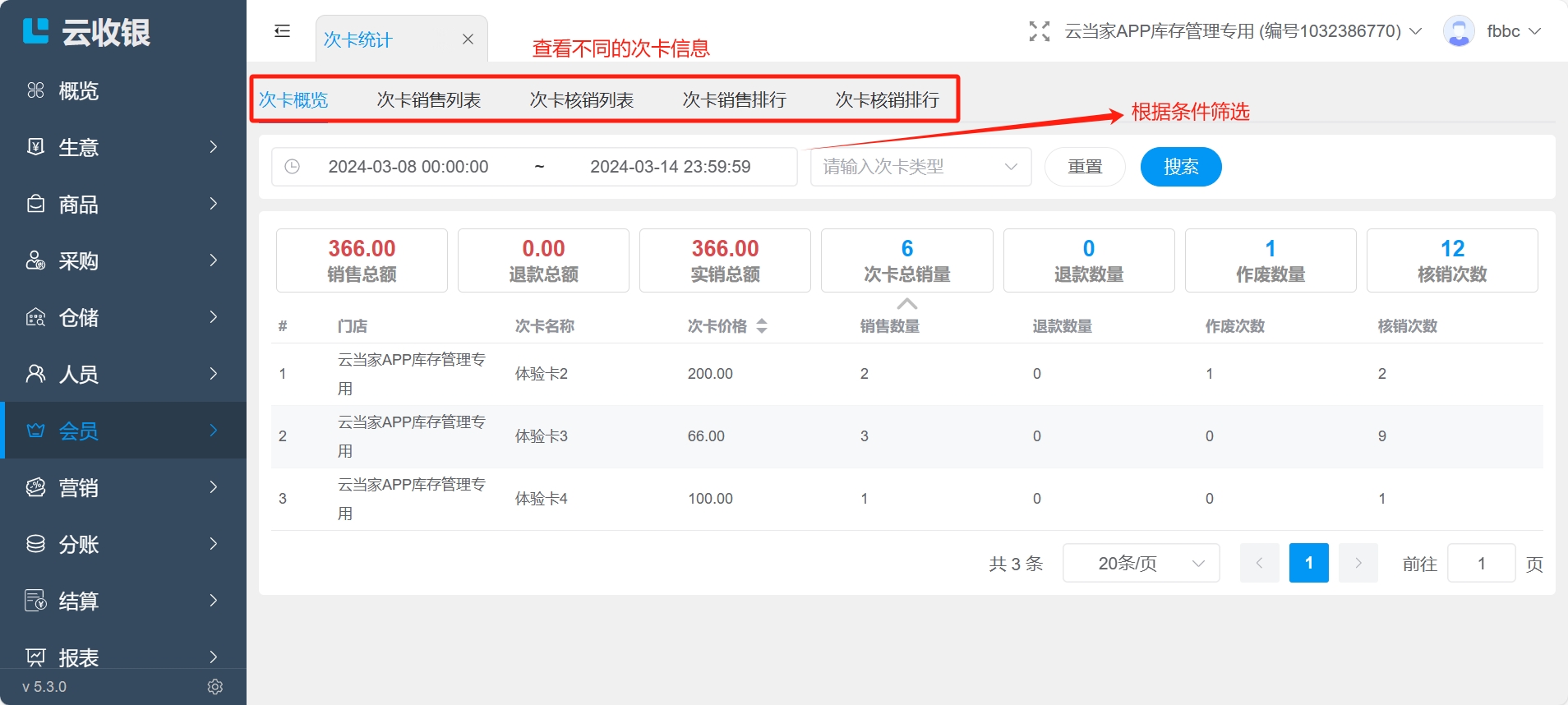 次卡统计页面可以对次卡的销售等信息进行查看。