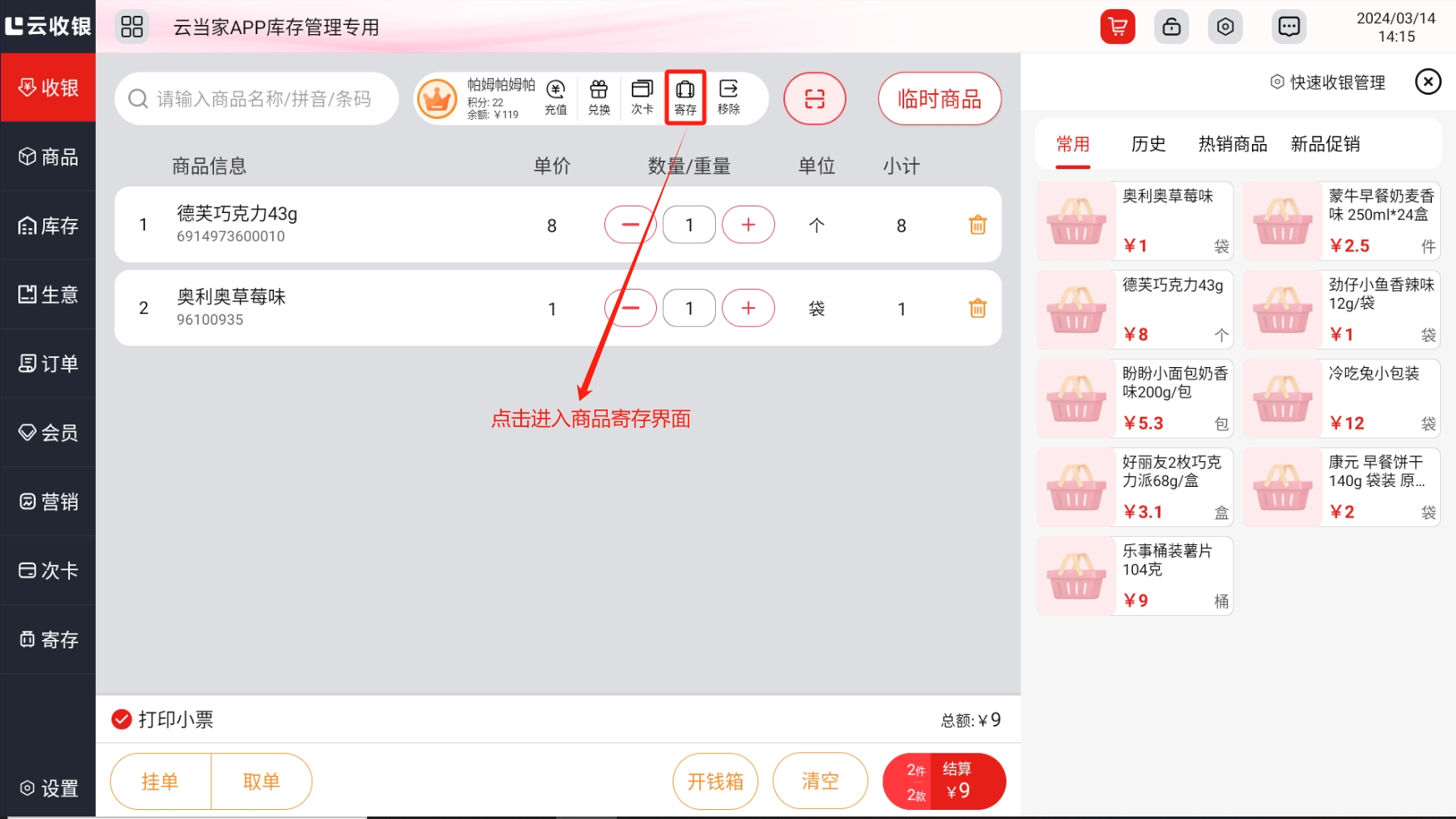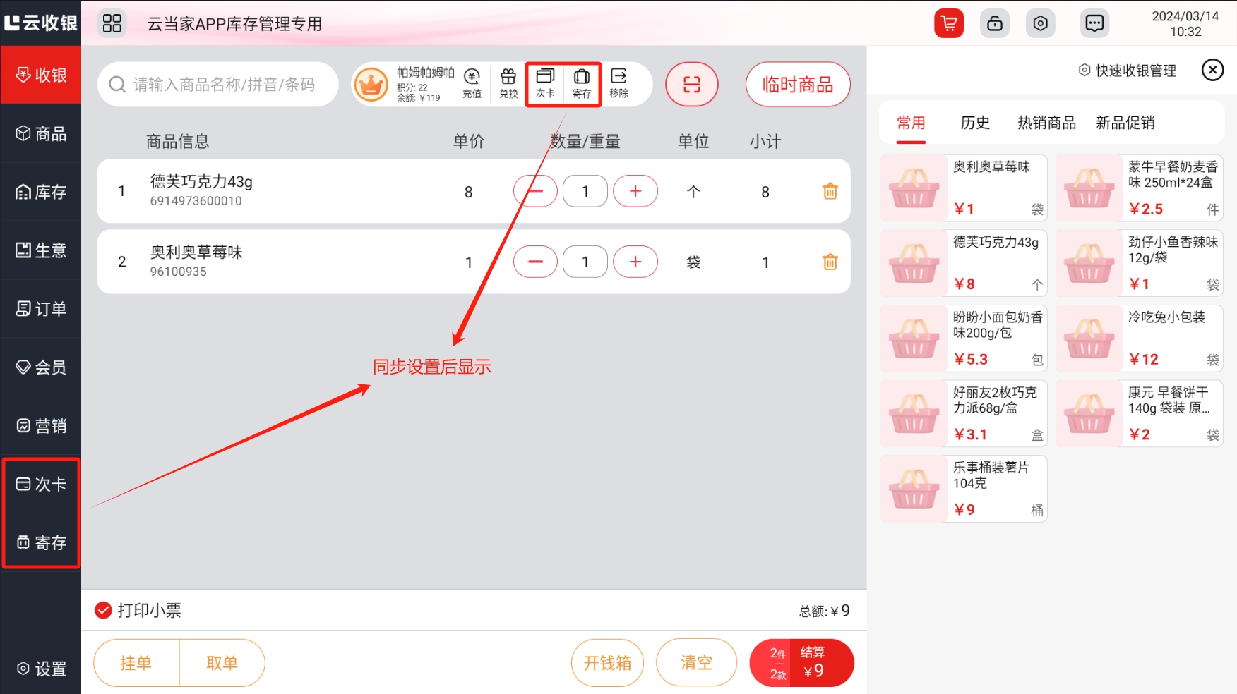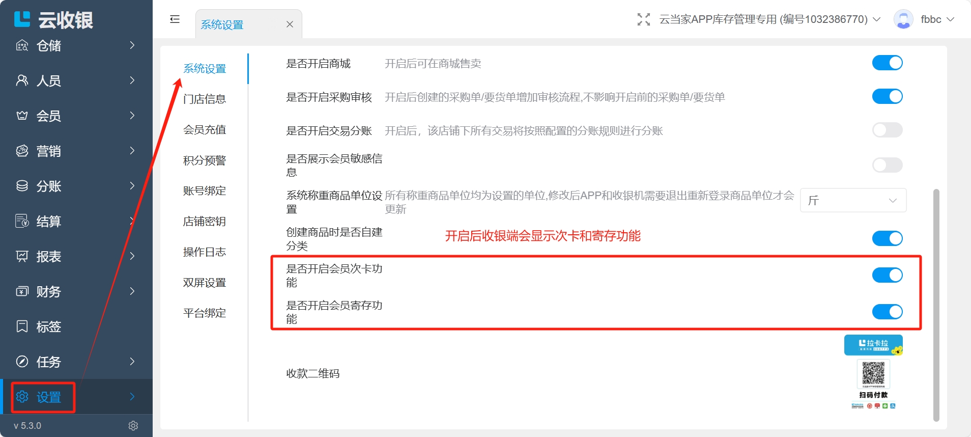 在PC端的系统设置中可以开启会员次卡和会员寄存功能。
