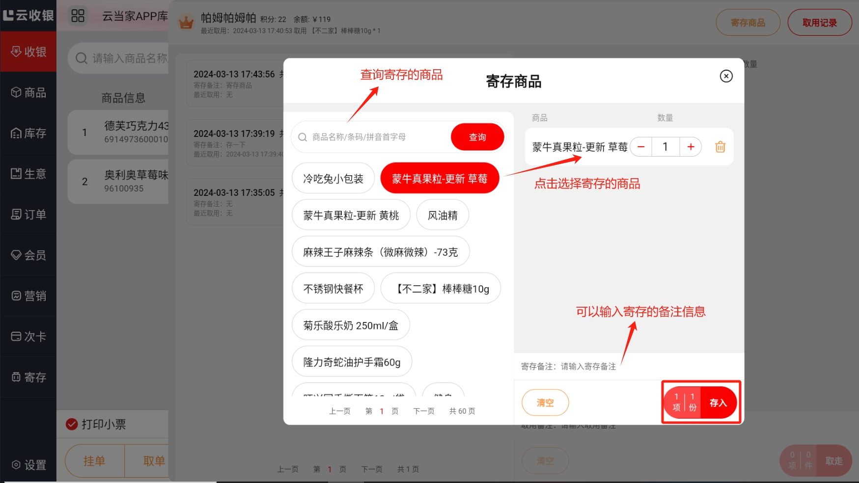 选择要寄存的商品,要寄存的数量,可以输入备注信息。
