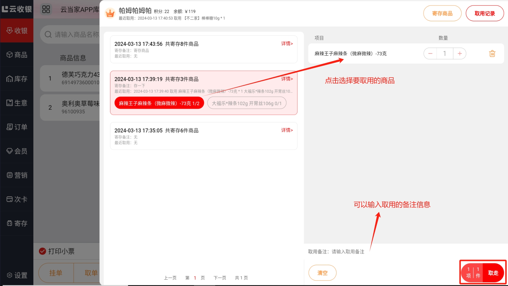 选择要取用的商品,要取用的数量,可以输入备注信息。
