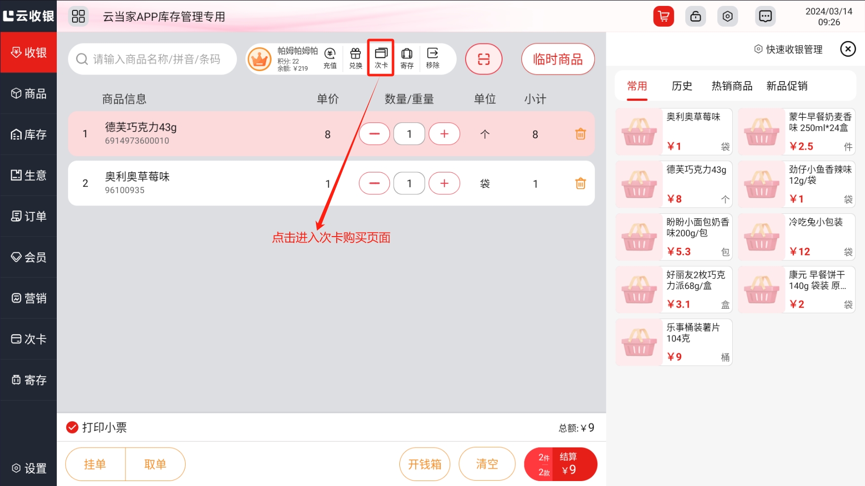 会员可以购买次卡,并使用次卡来划卡购买相关的商品,
