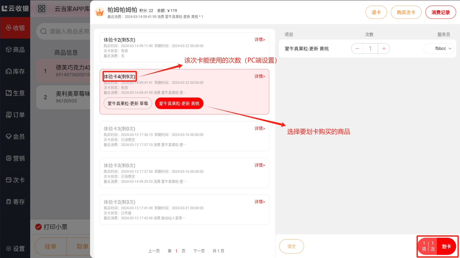 购买次卡后,会员可以通过划次卡来购买次卡所包含的商品。
