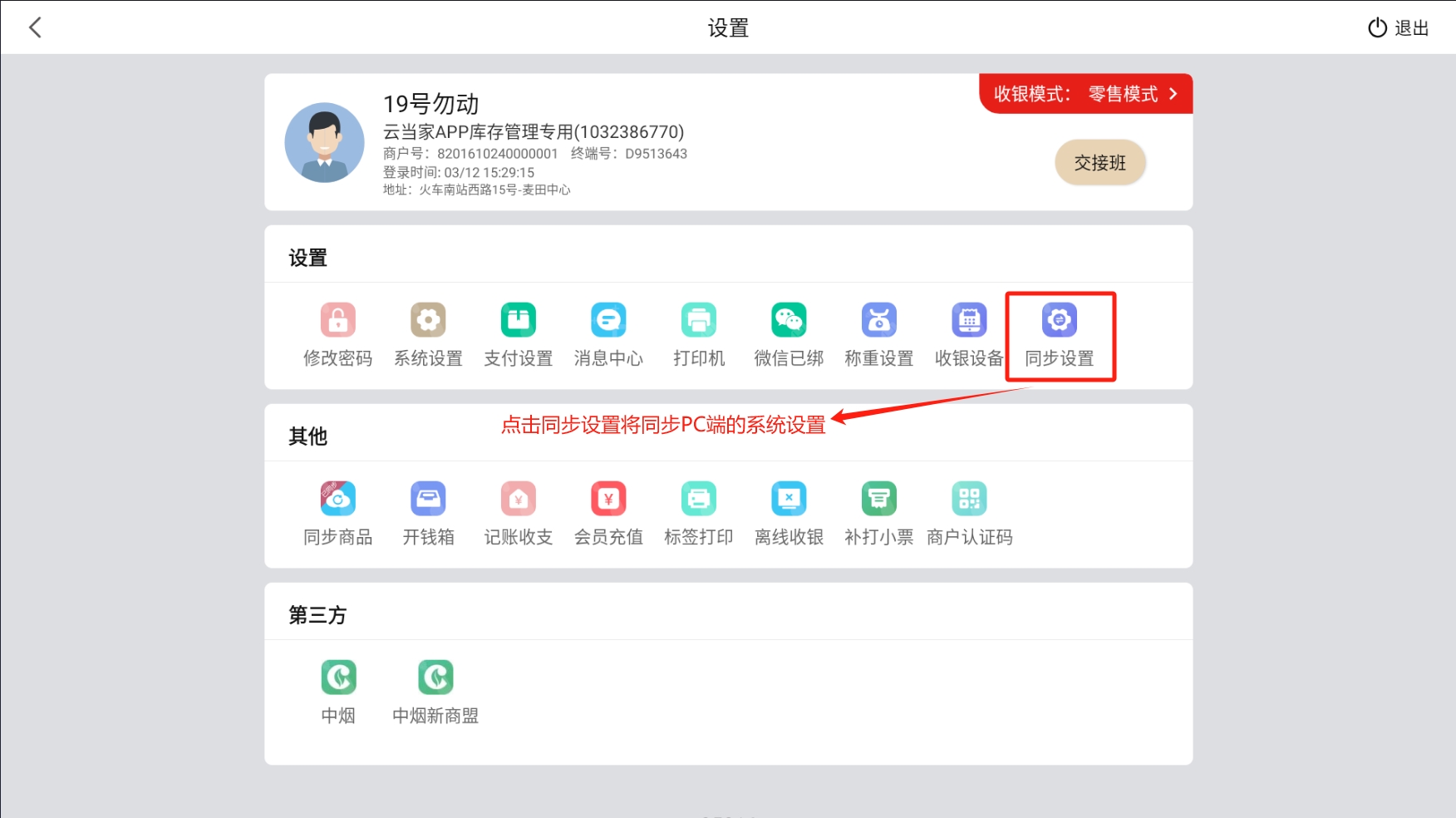 PC端设置完成后需要在收银端的设置中对PC端的设置进行同步。