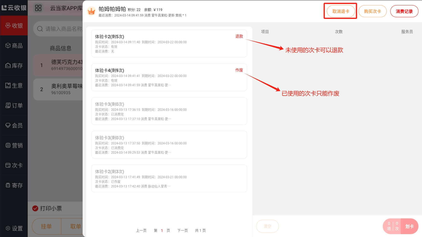 - 作废:购买次卡后,若已经使用过次卡,只能对该次卡进行作废。