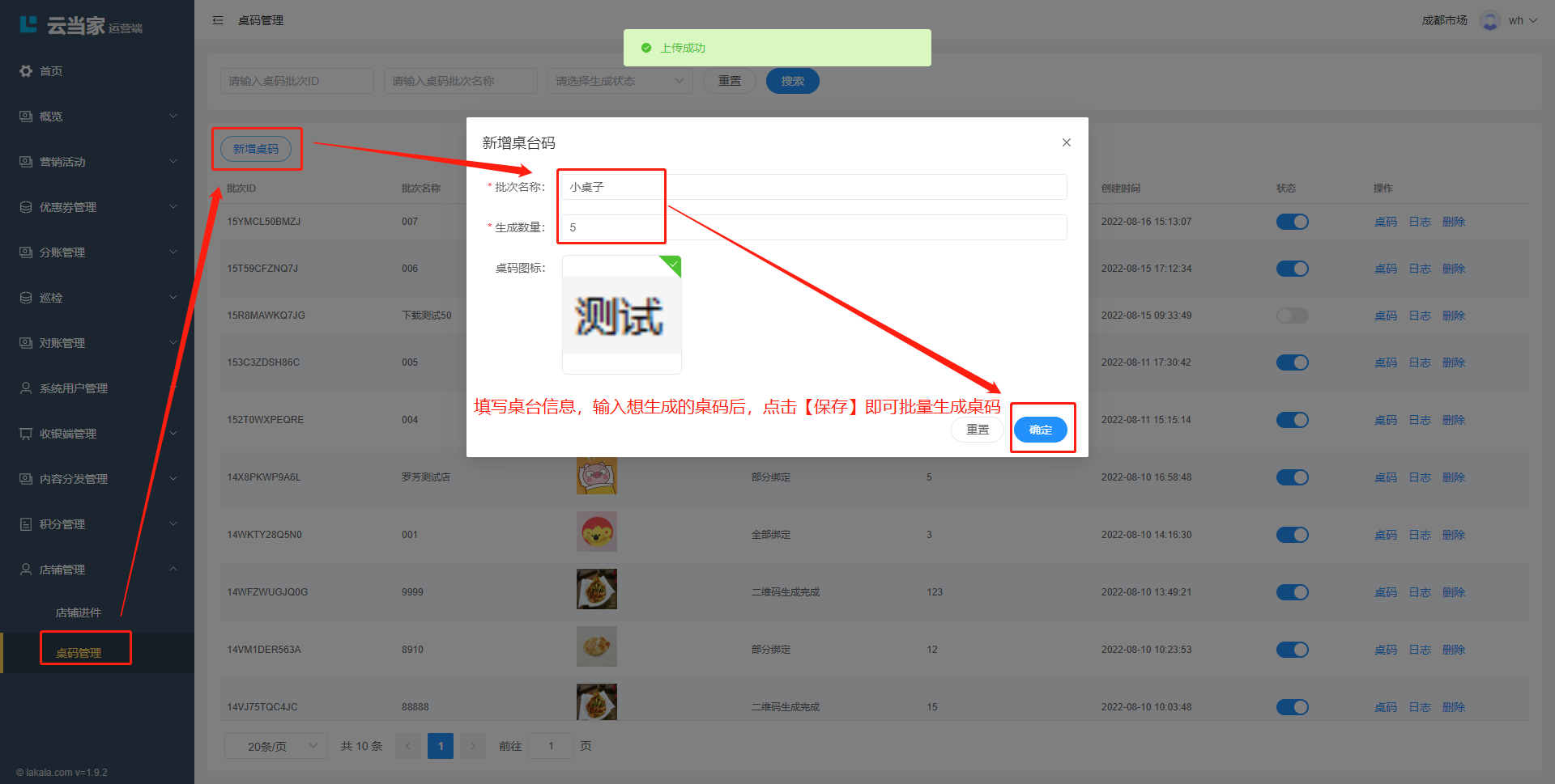 创建后,系统自动生成固定样式的桌码,可批量下载打印使用;