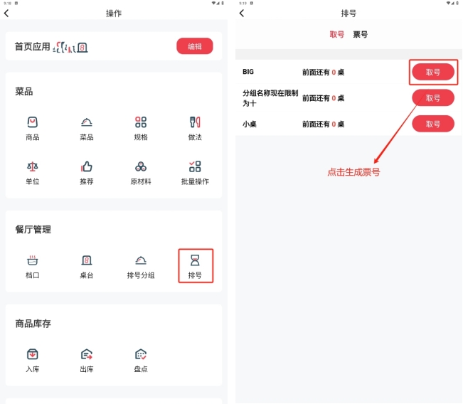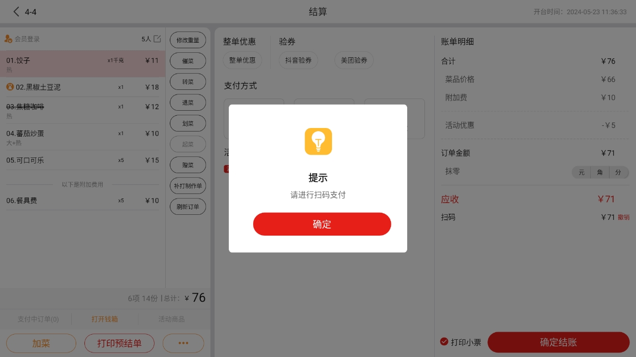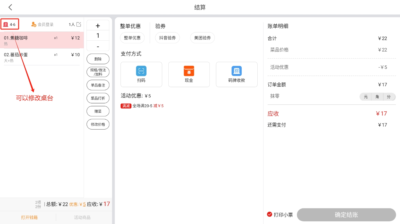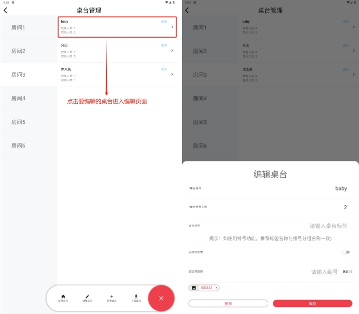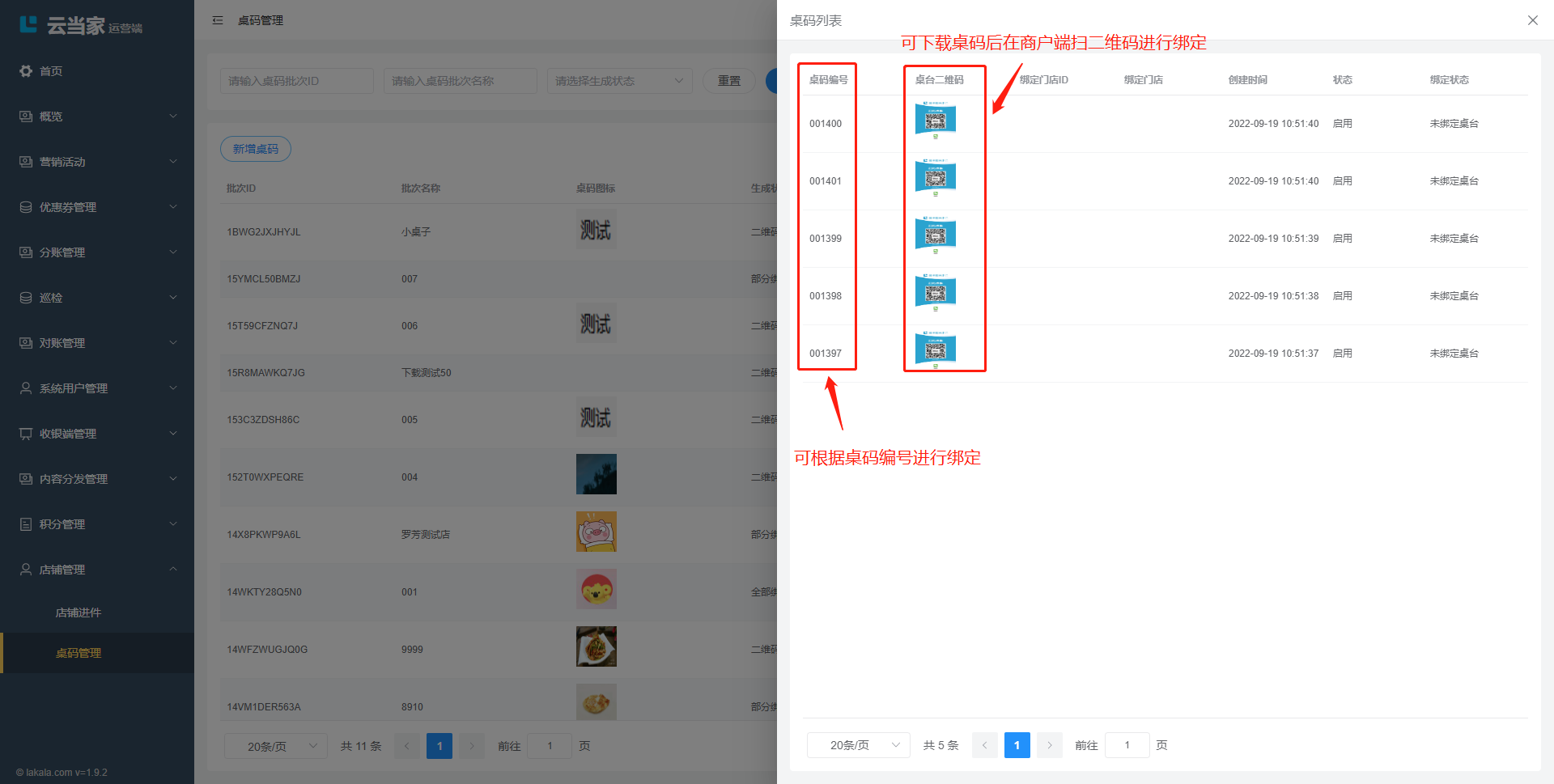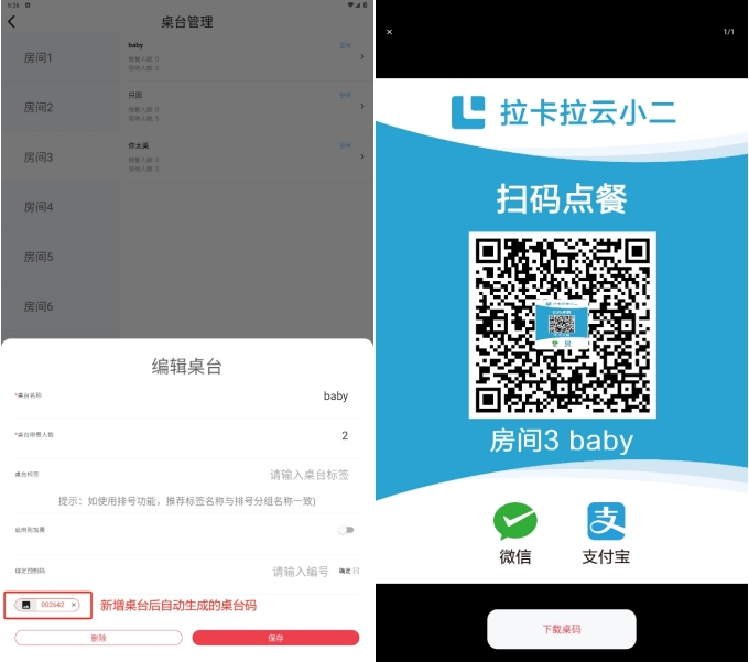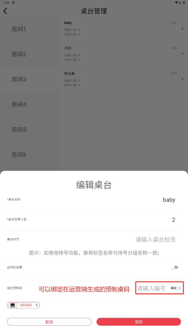 也可以根据输入桌码编号和扫描二维码,绑定在运营端生成的预制桌码;