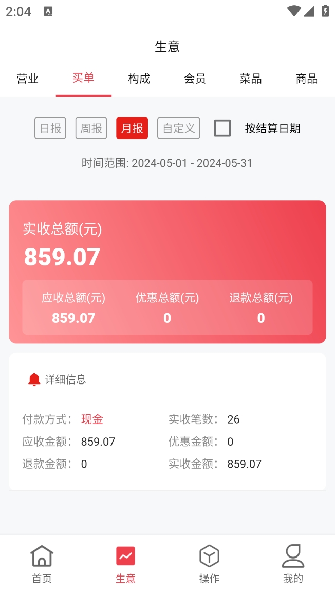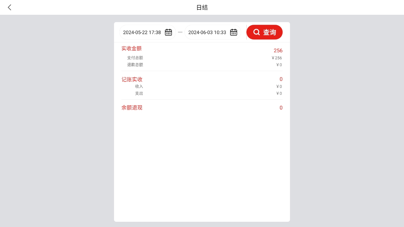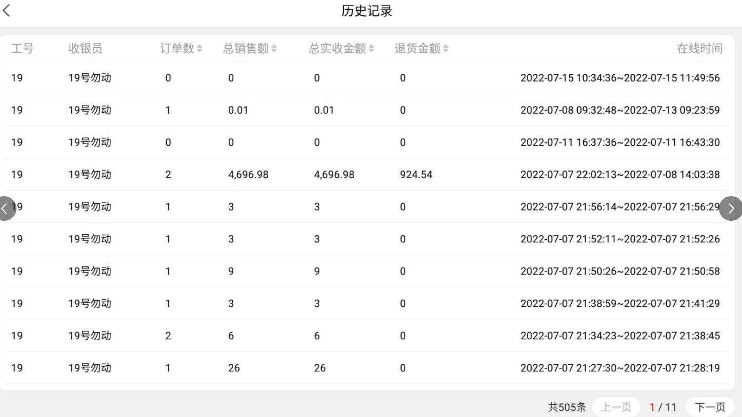 记录每一次交接班的必要信息,详细收银数据请按在线时间进入日结界面搜索查看: