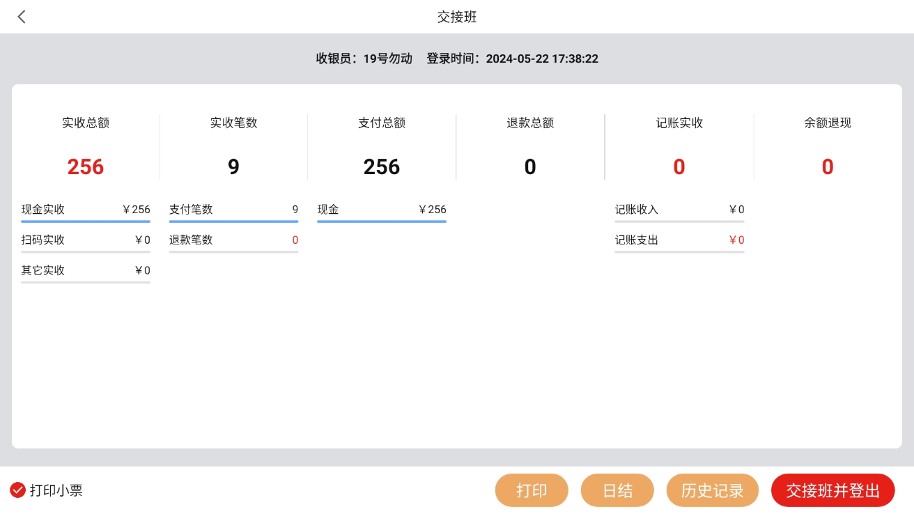 交接班可查看当前收银员从登录开始到现在的销售数据,并且也记录了之前交接班的记录,交接班并退出后可打印交接班小票。