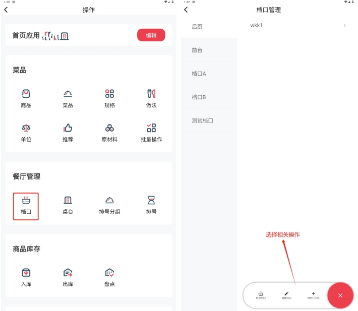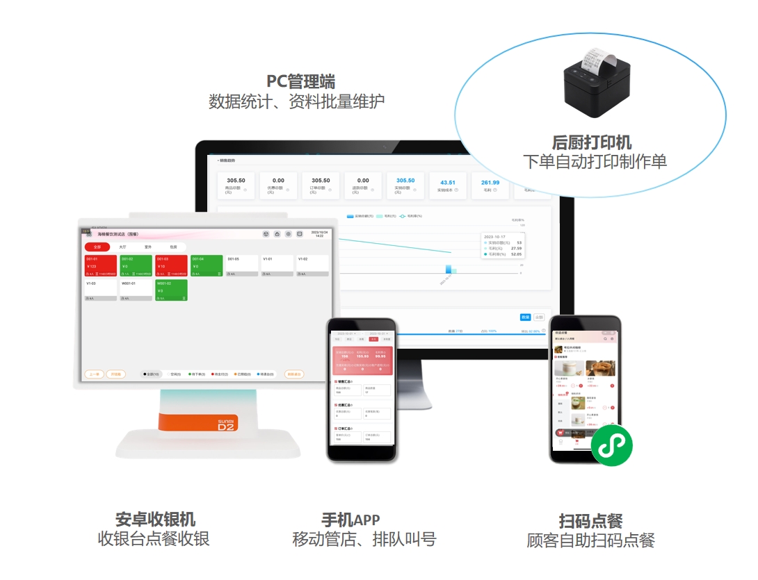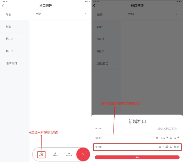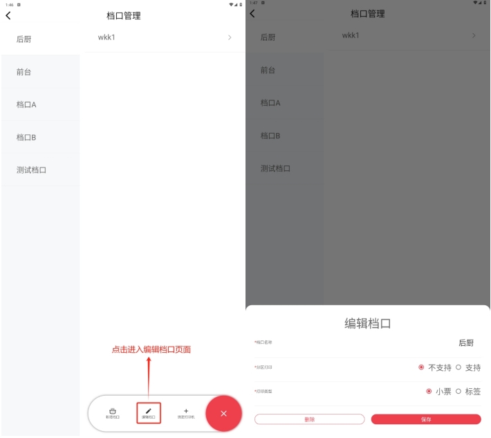 门店不同的菜品制作区通过创建不同档口进行区分,例如后厨分为炒菜区和面点区,每个档口绑定不同的后厨打印机,顾客下单后炒菜和面点分别在不同打印机打印制作单;
