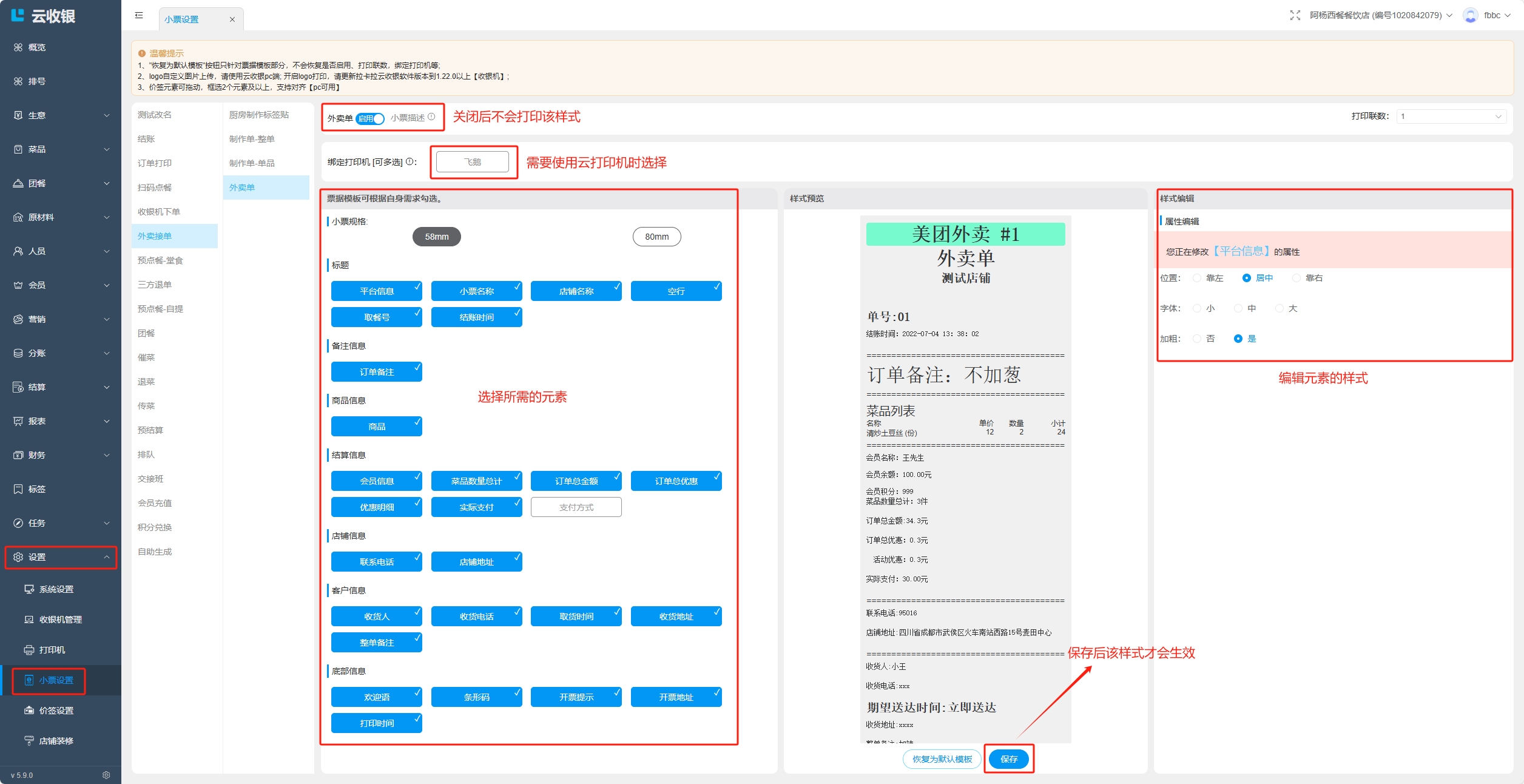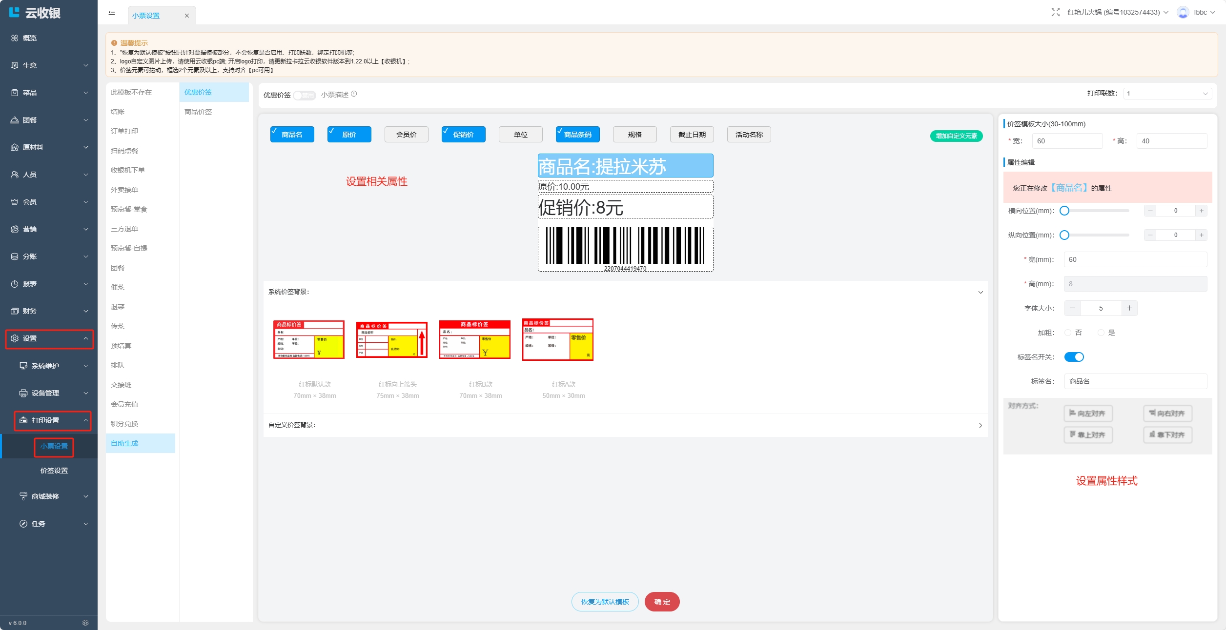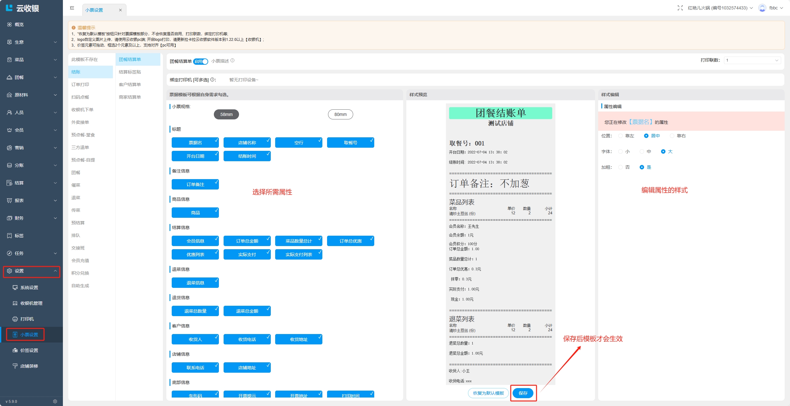 设置小票模板;