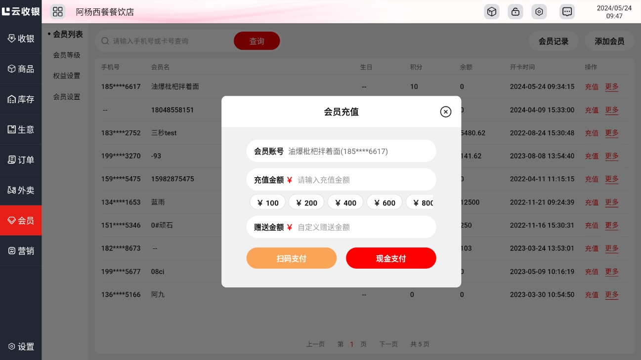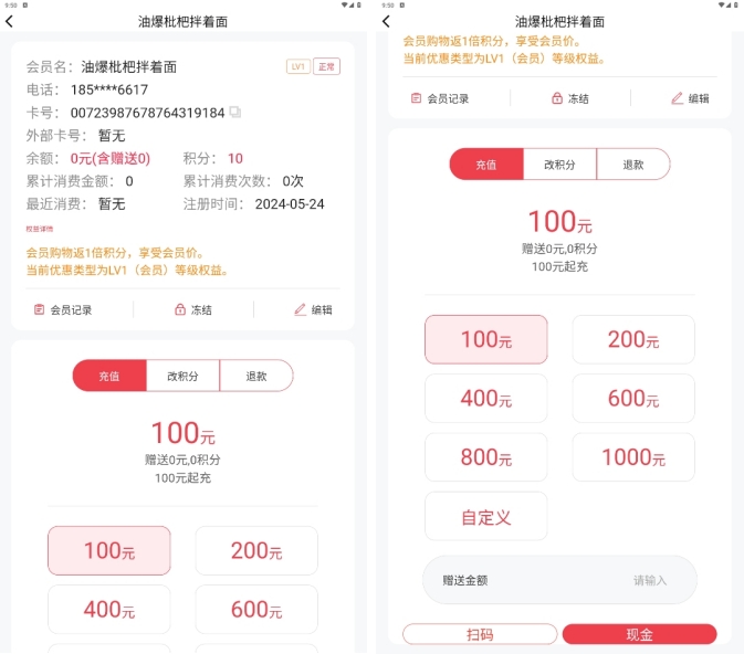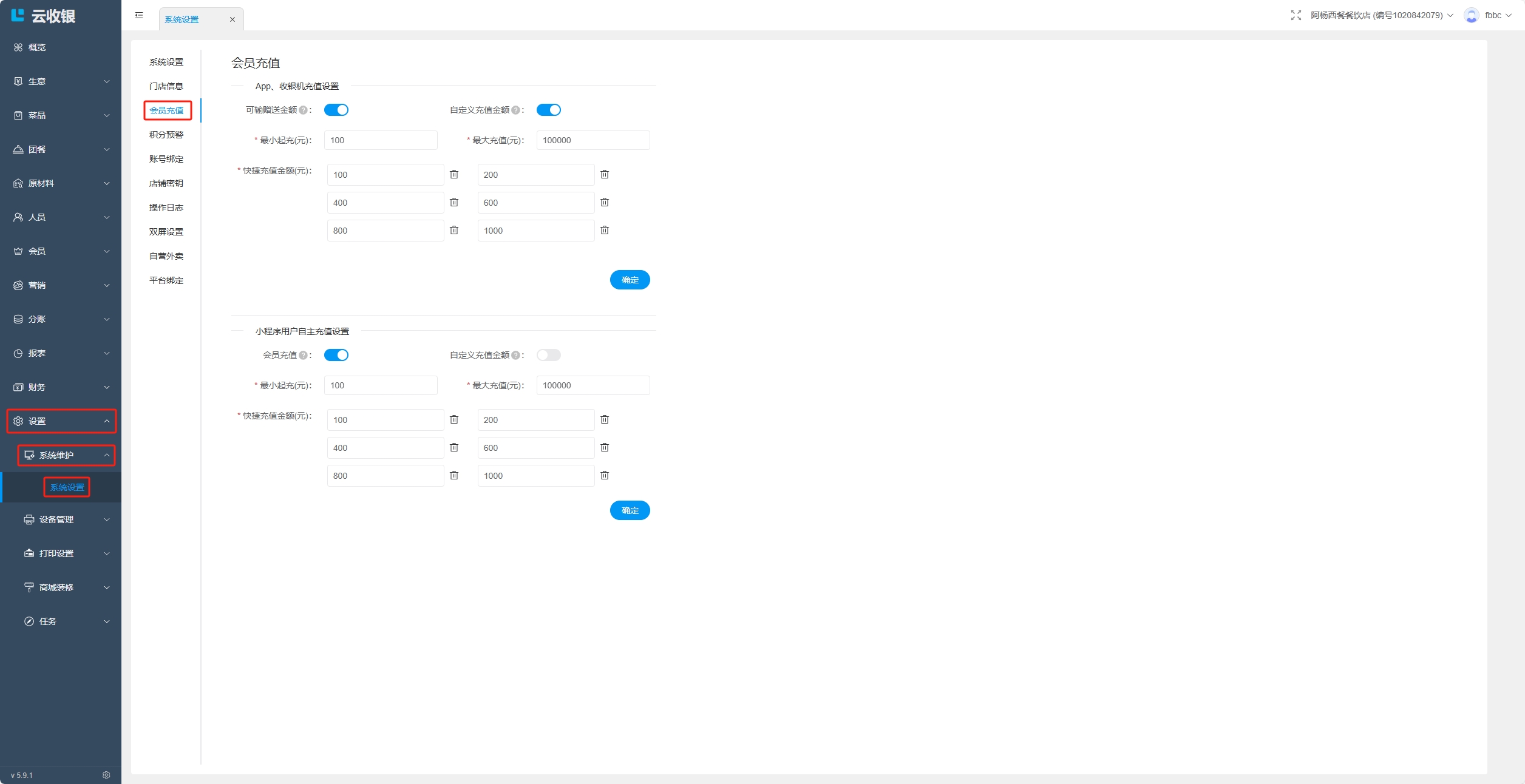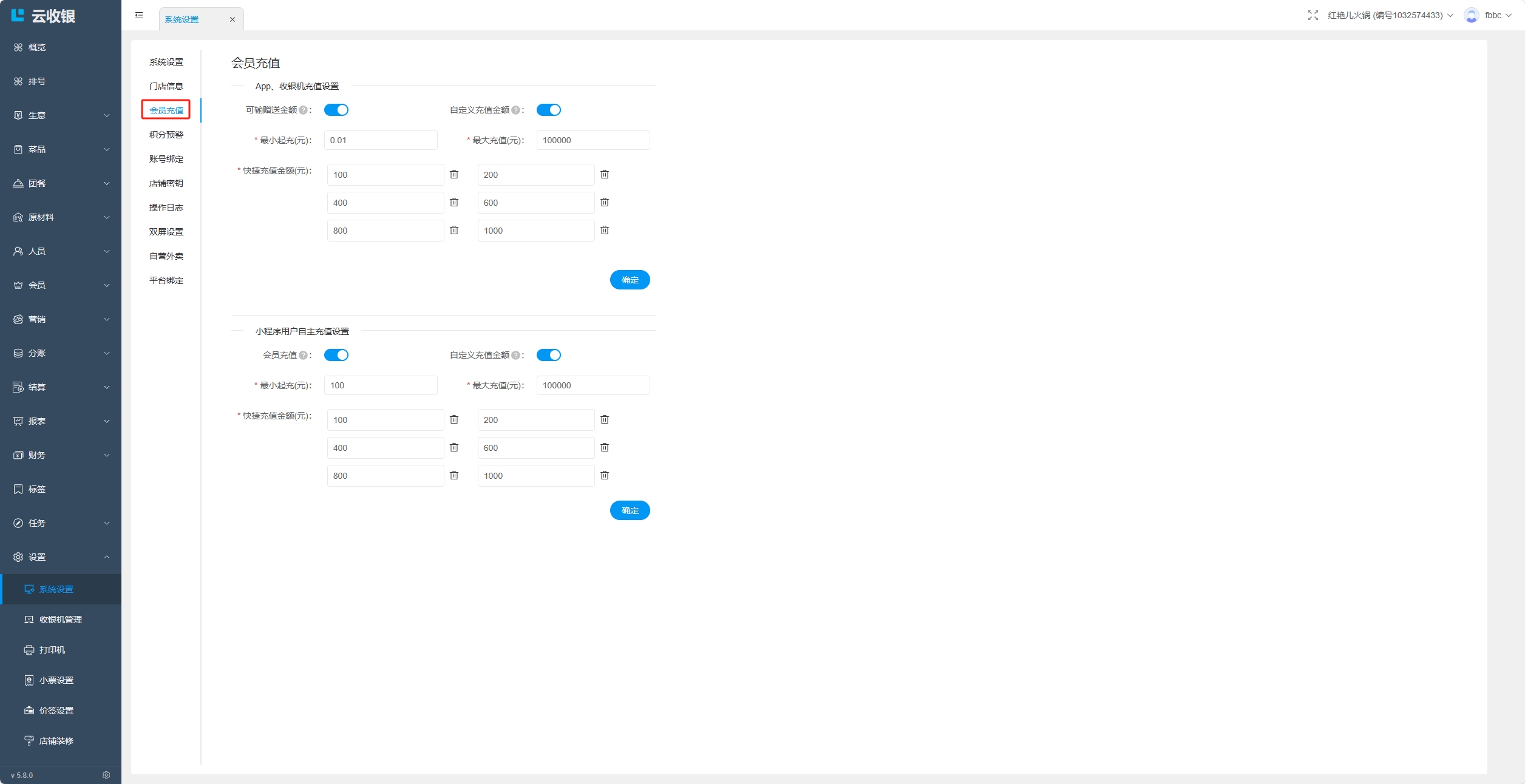 设置APP、收银机、小程序的会员起充金额、最大充值金额和快捷充值金额;
