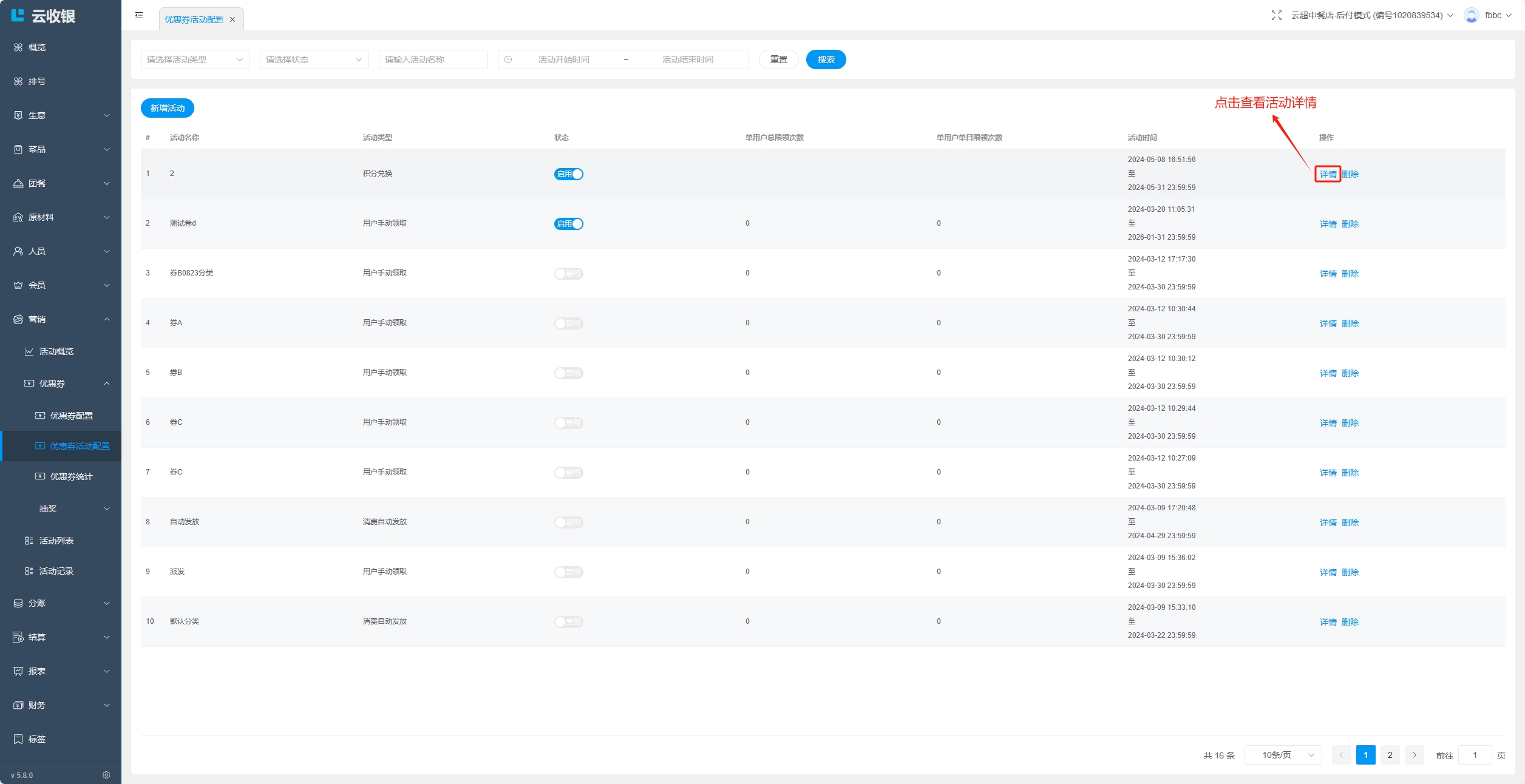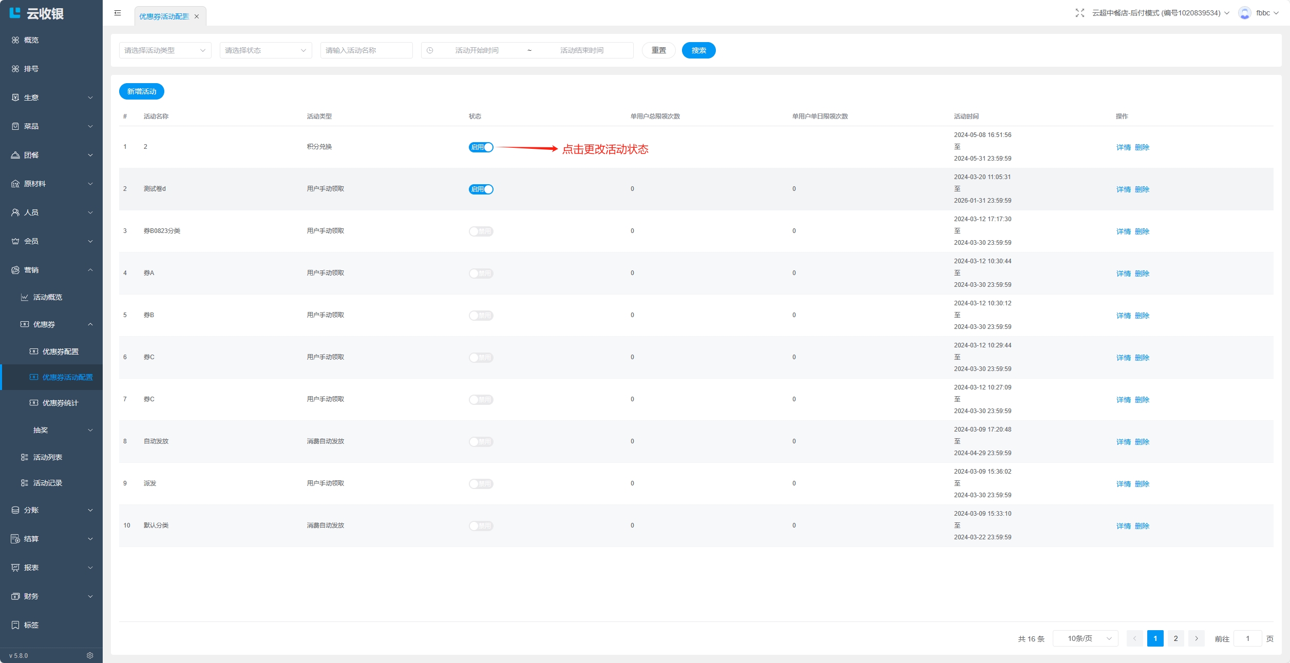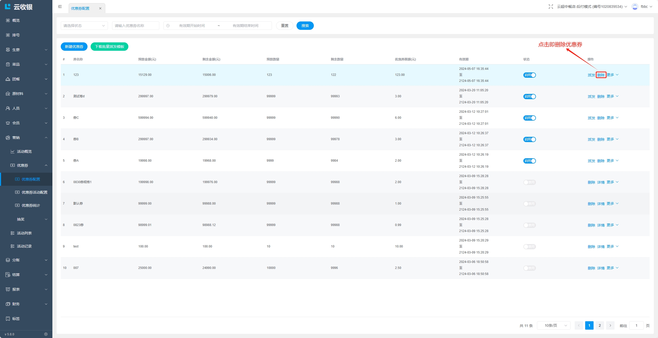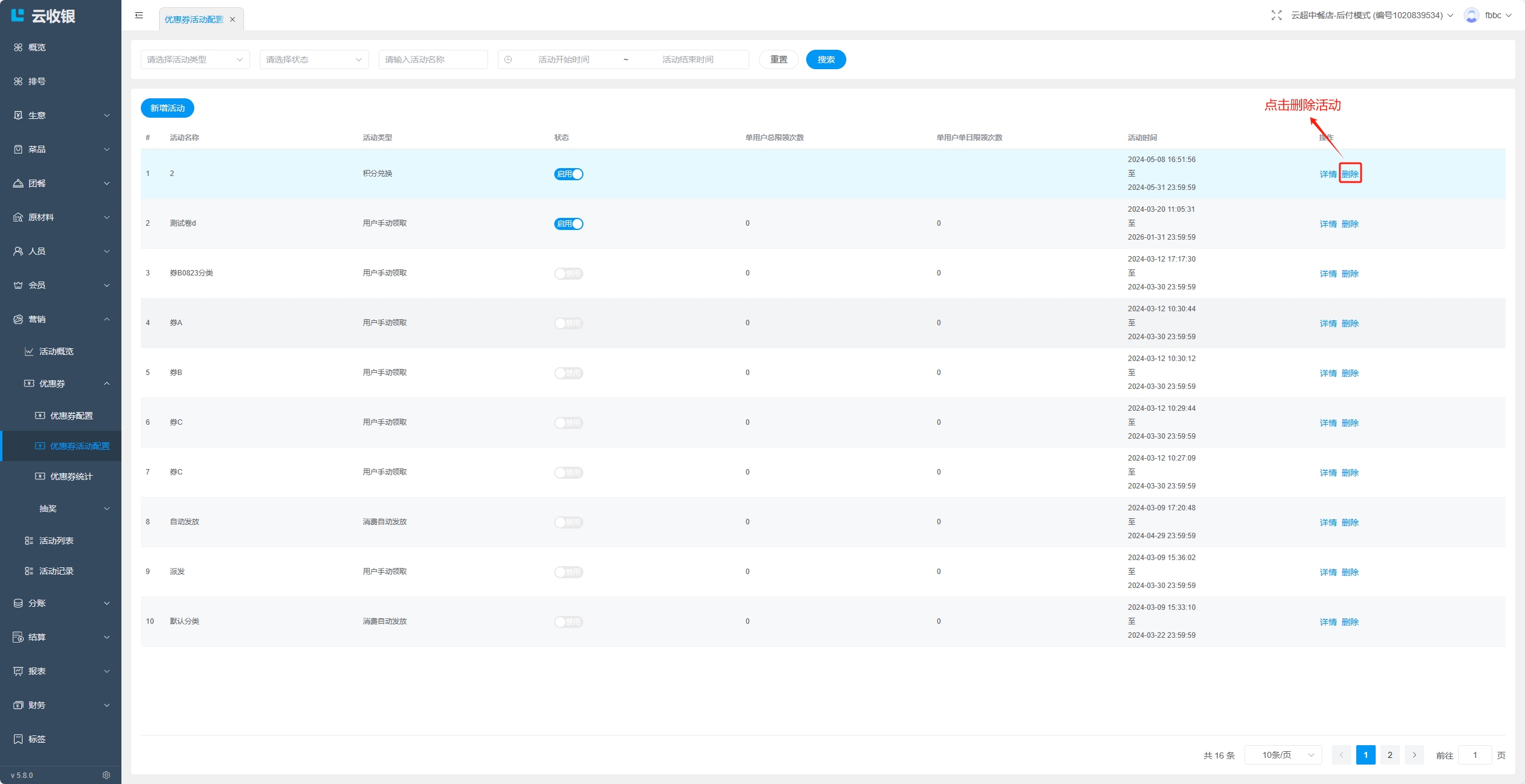 点击删除该优惠券活动;
