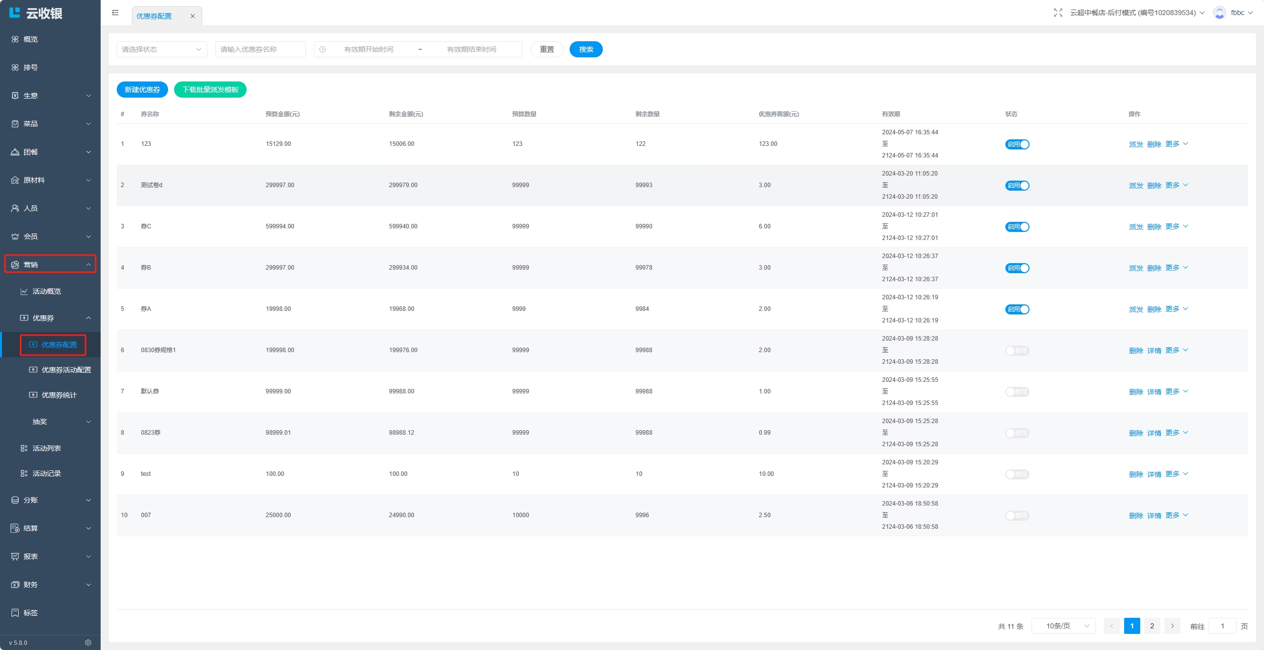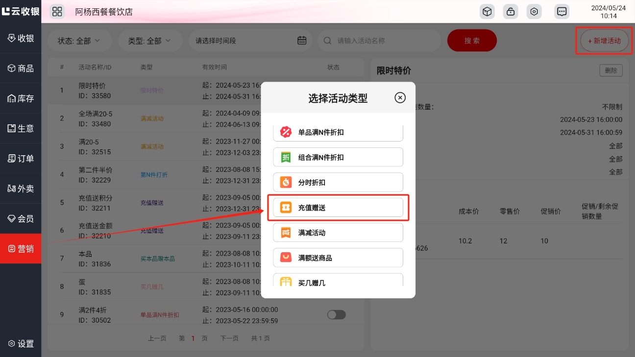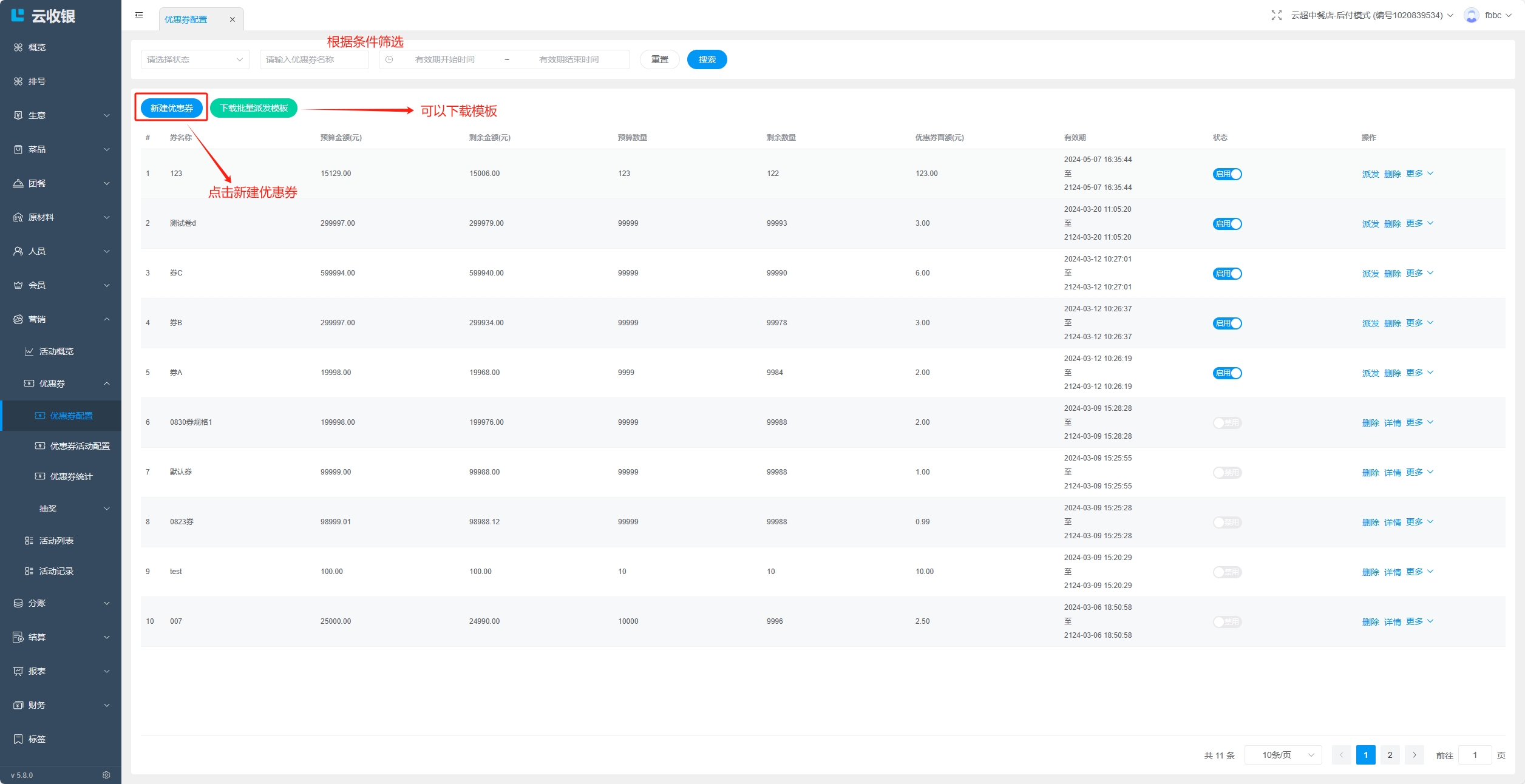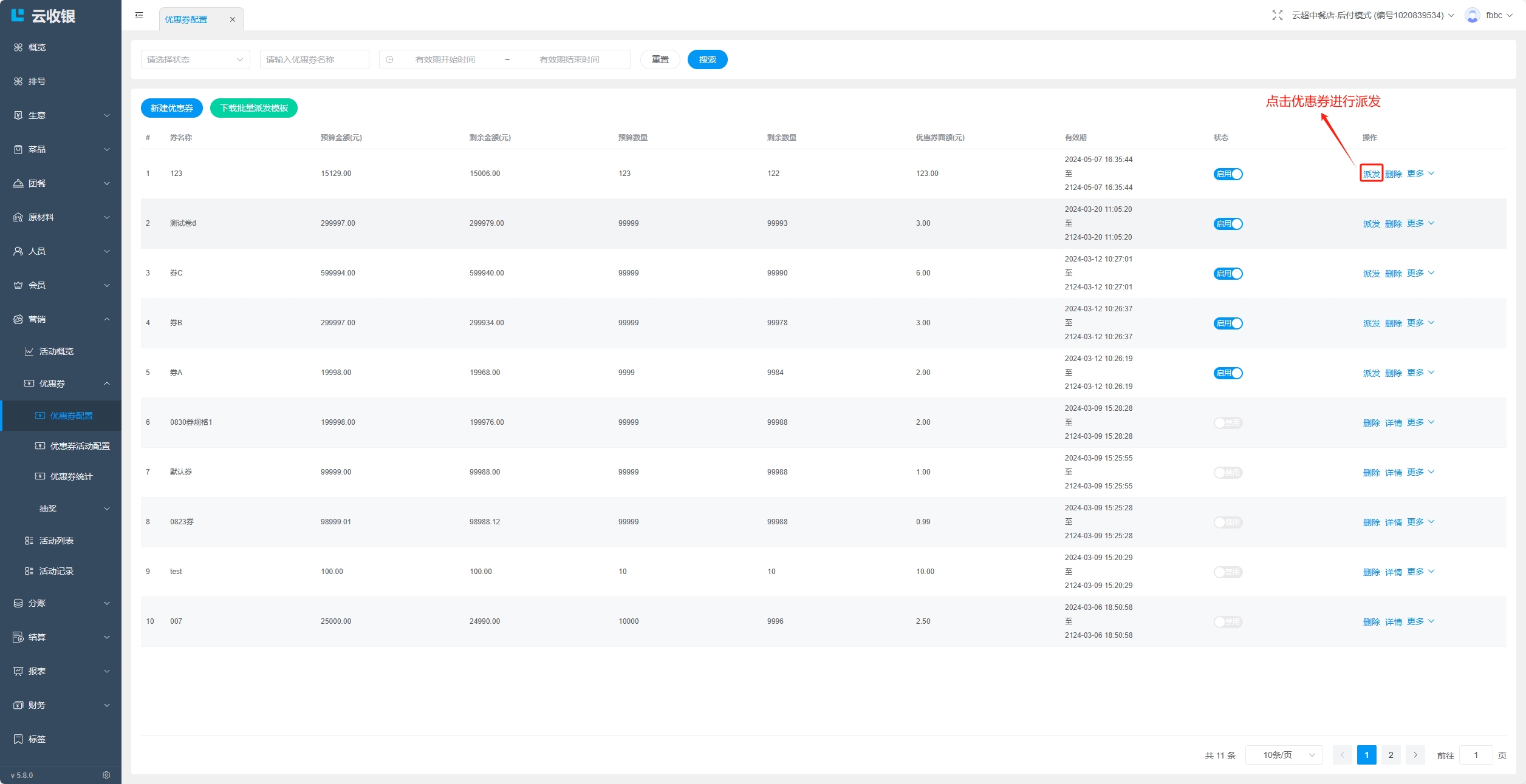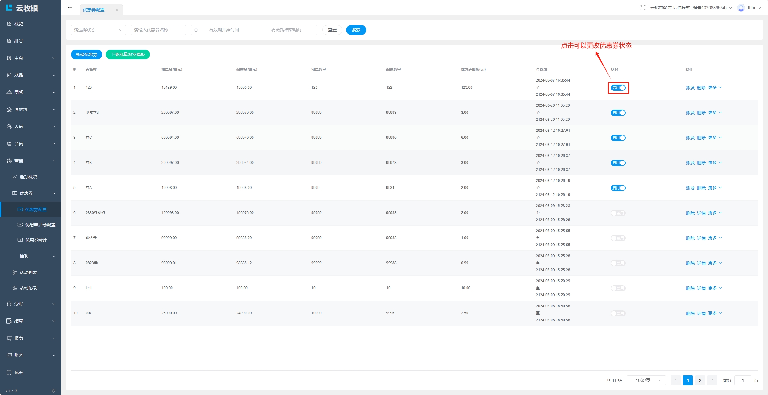 点击删除该优惠券活动;