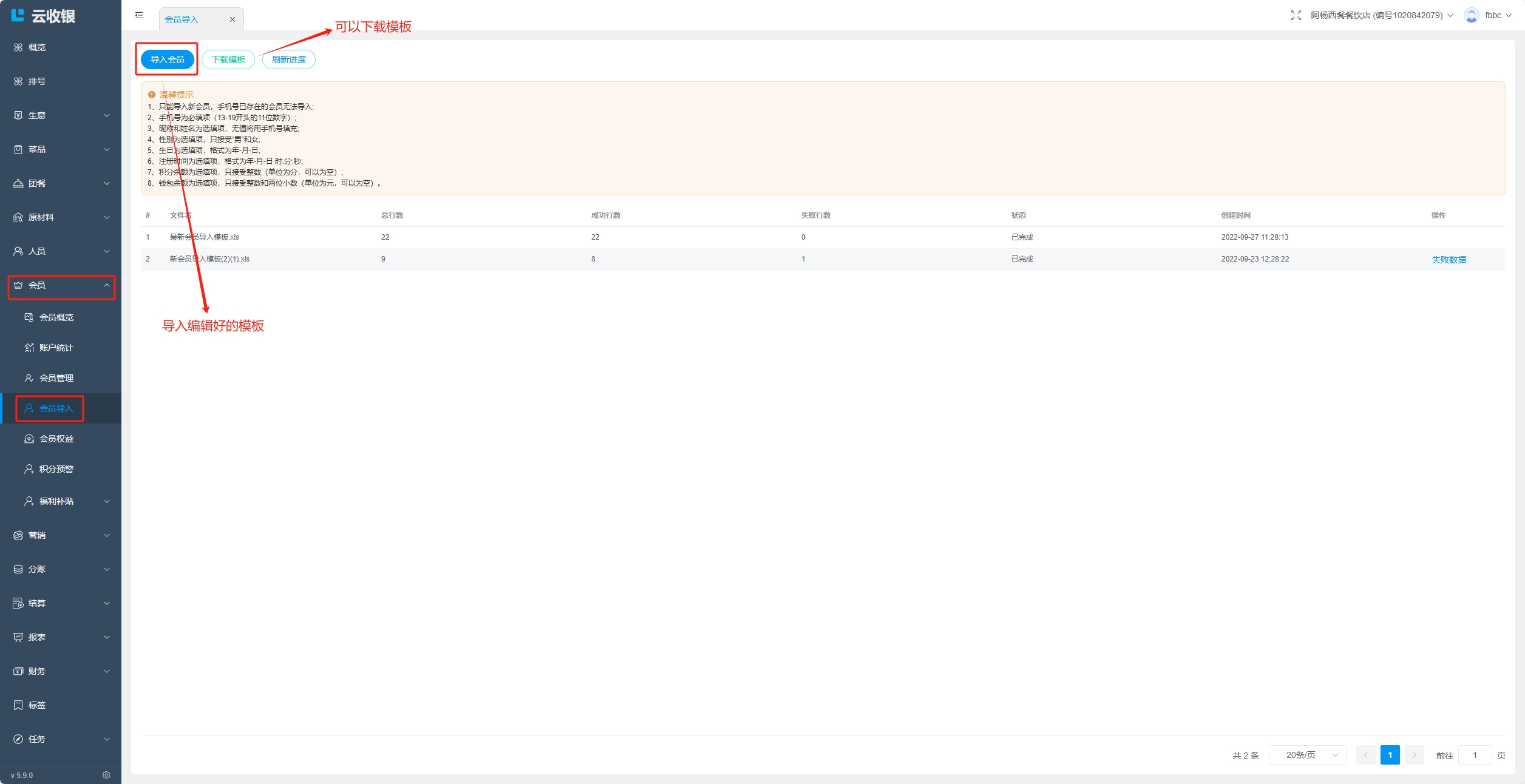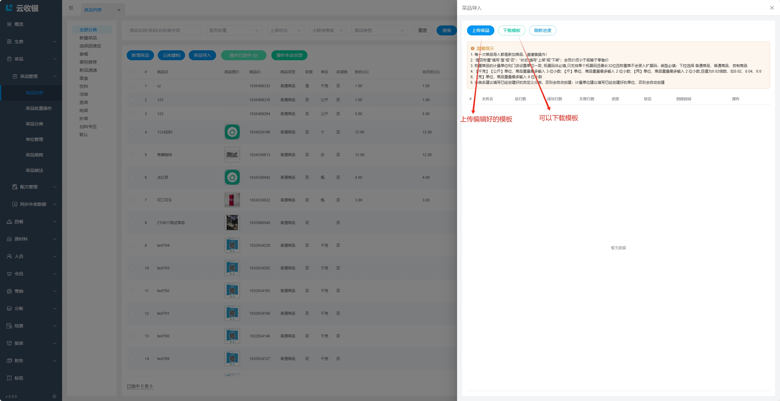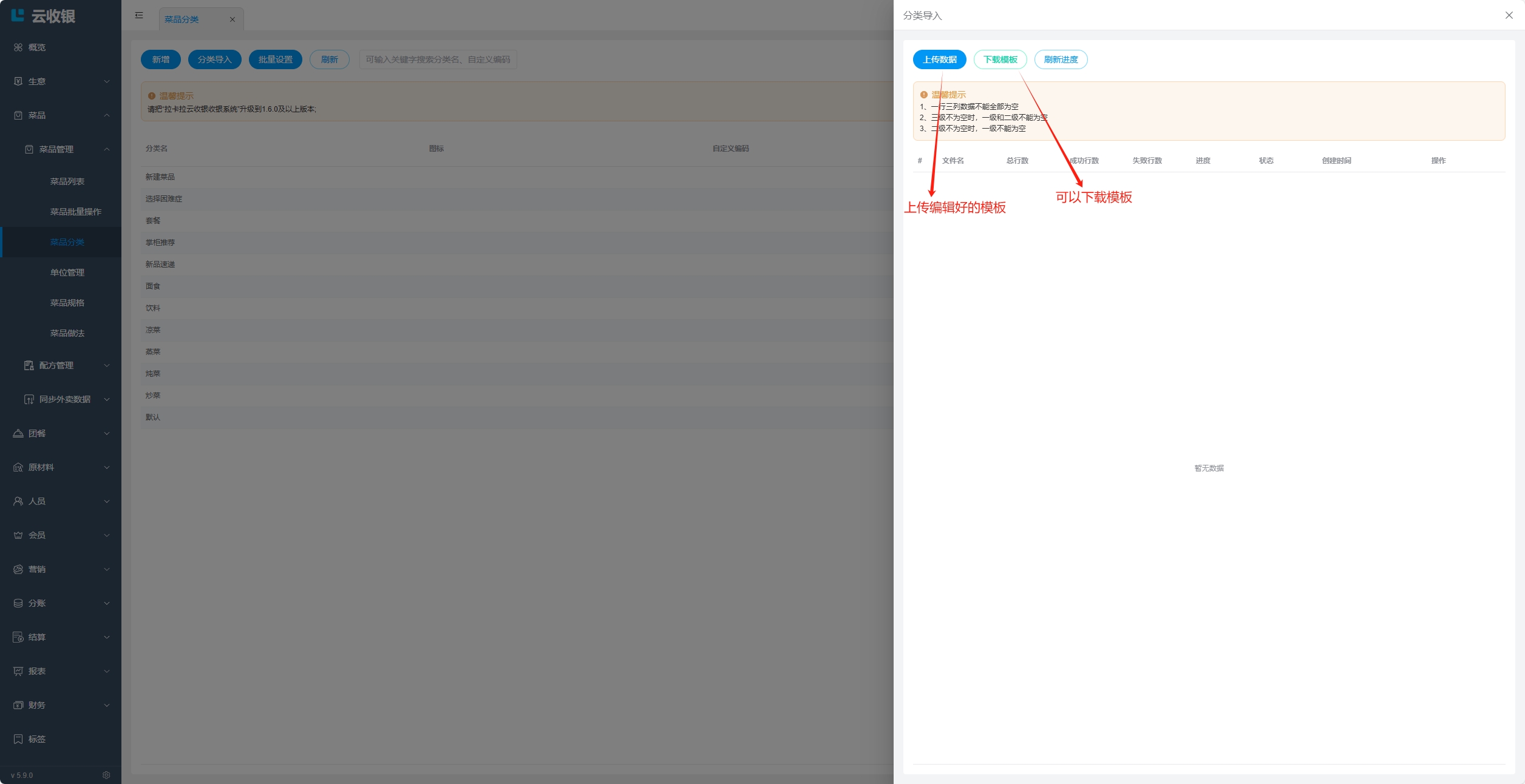 下载导入模板后,务必按照模板填写要求填写菜品资料,否则可能会导入失败,建议提前维护好分类资料,否则导入商品时会根据模板中的分类资料自动新增;