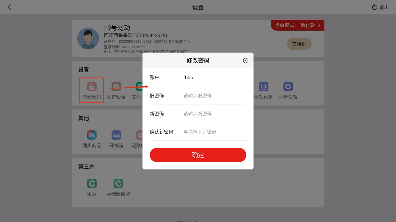 修改密码:正常登录时,可在【PC管理端】、【收银机端】修改密码;