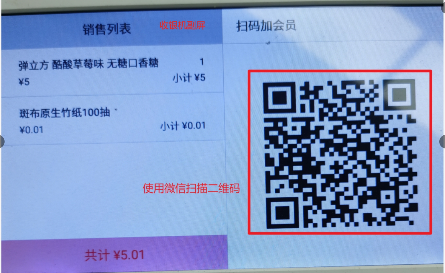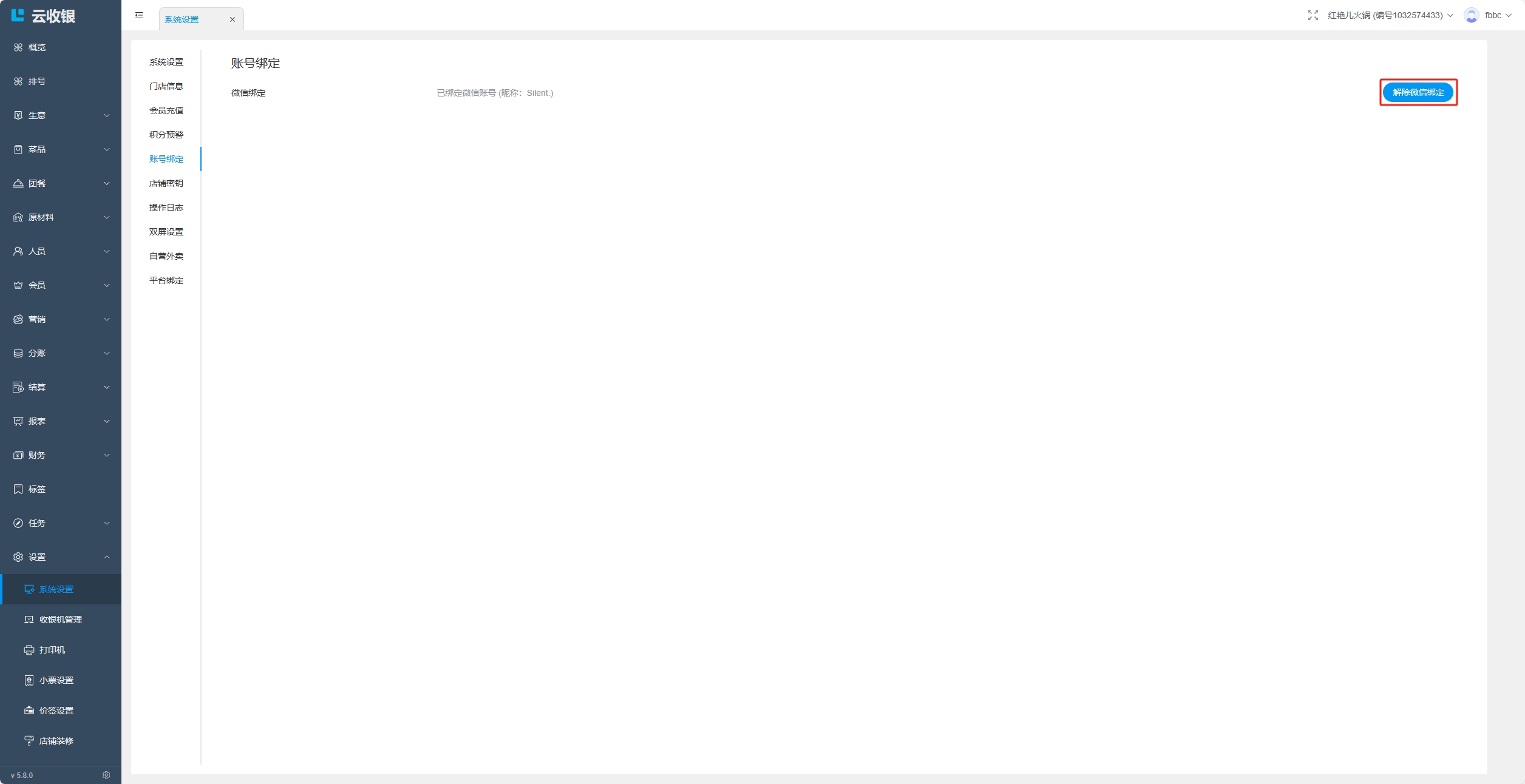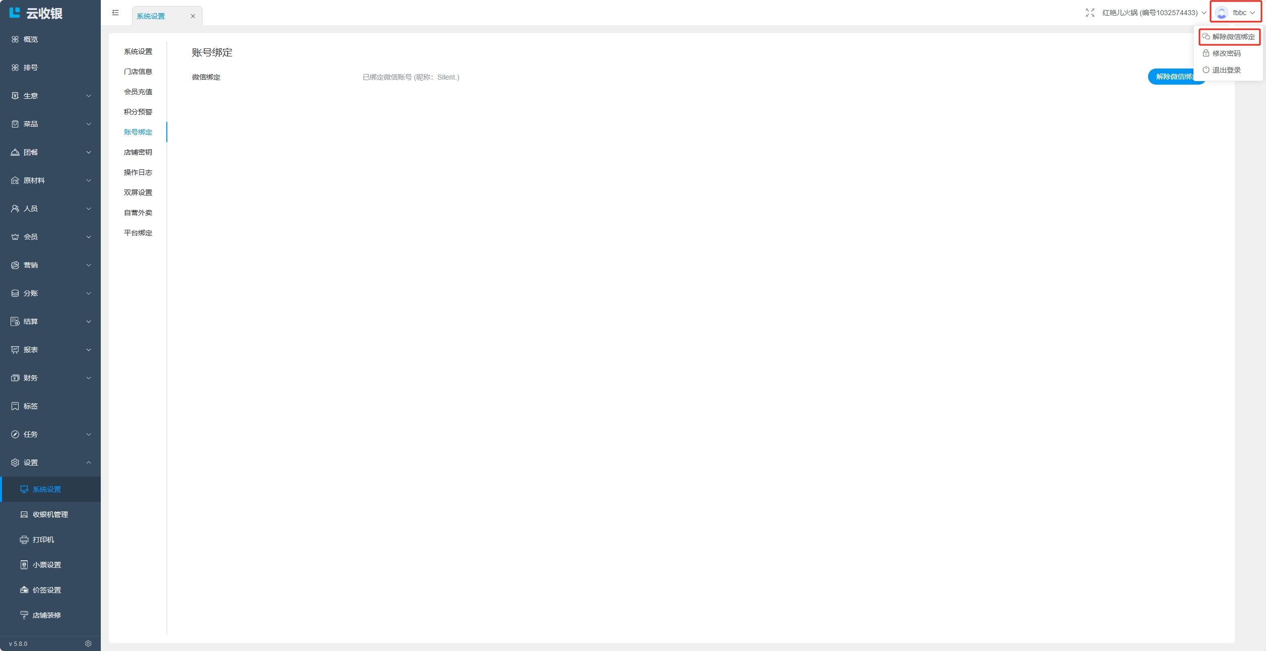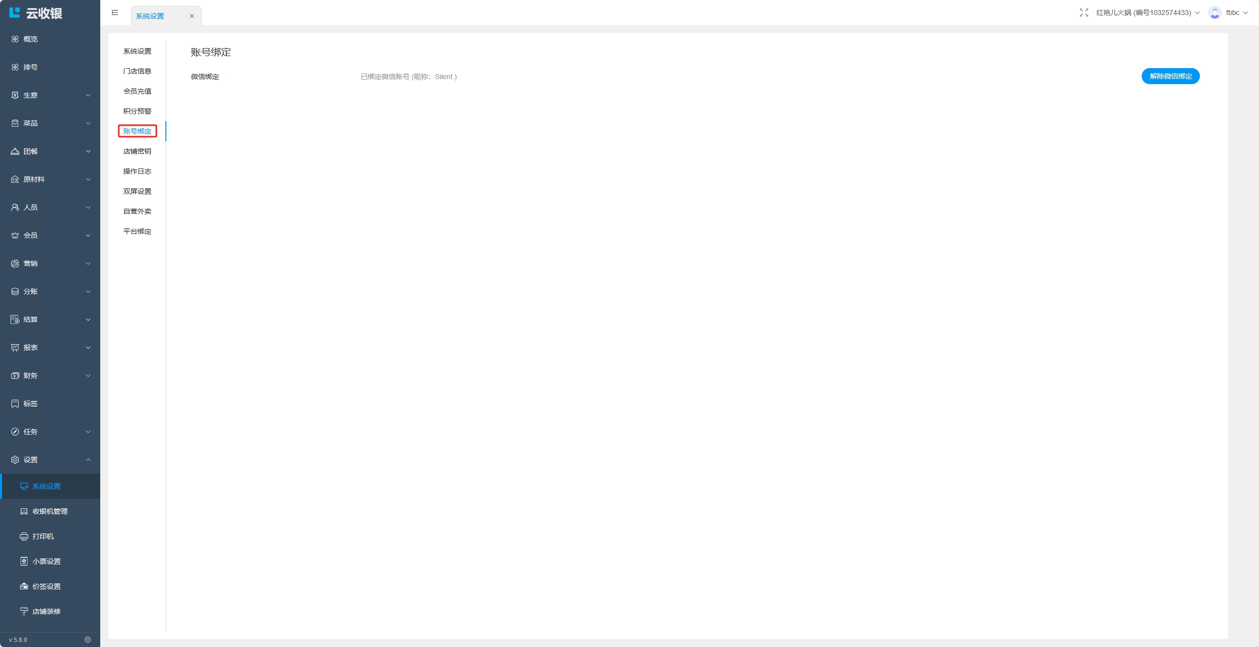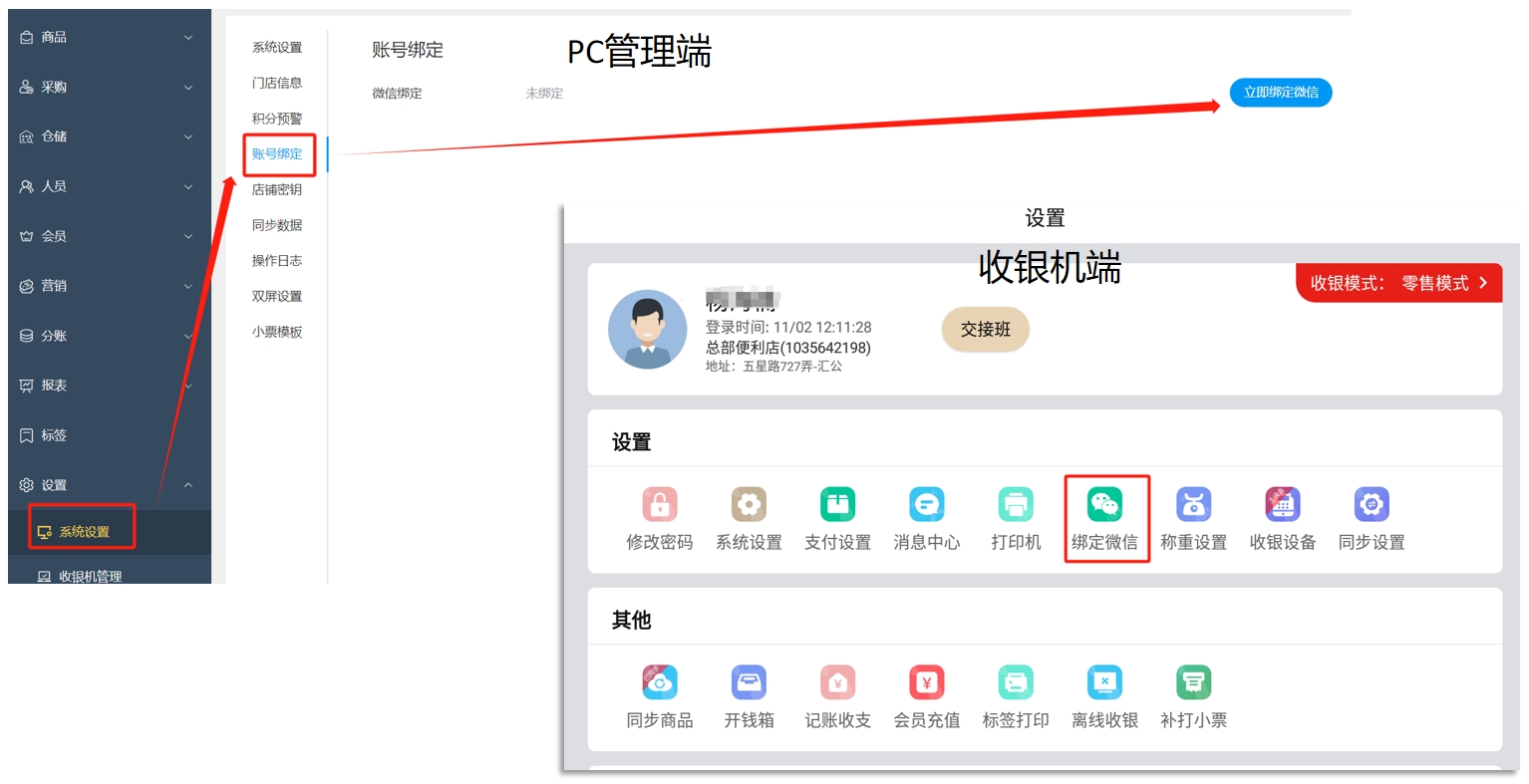 - 收银机端:设置中,选择绑定微信,扫码绑定账号;