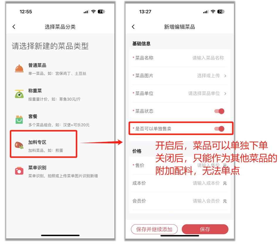 是否可以单独售卖:关闭后,下单/加菜时,不能单卖该菜品
