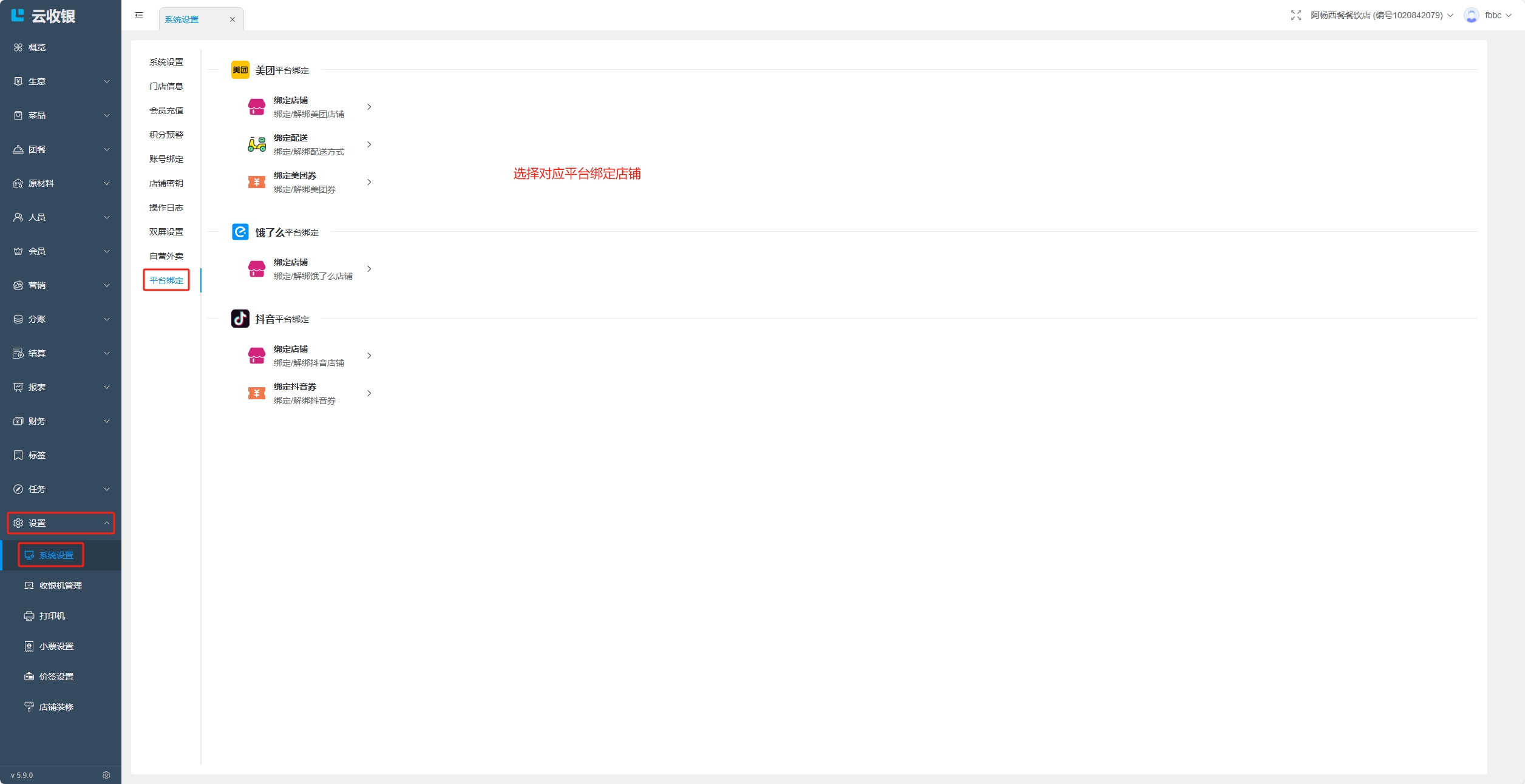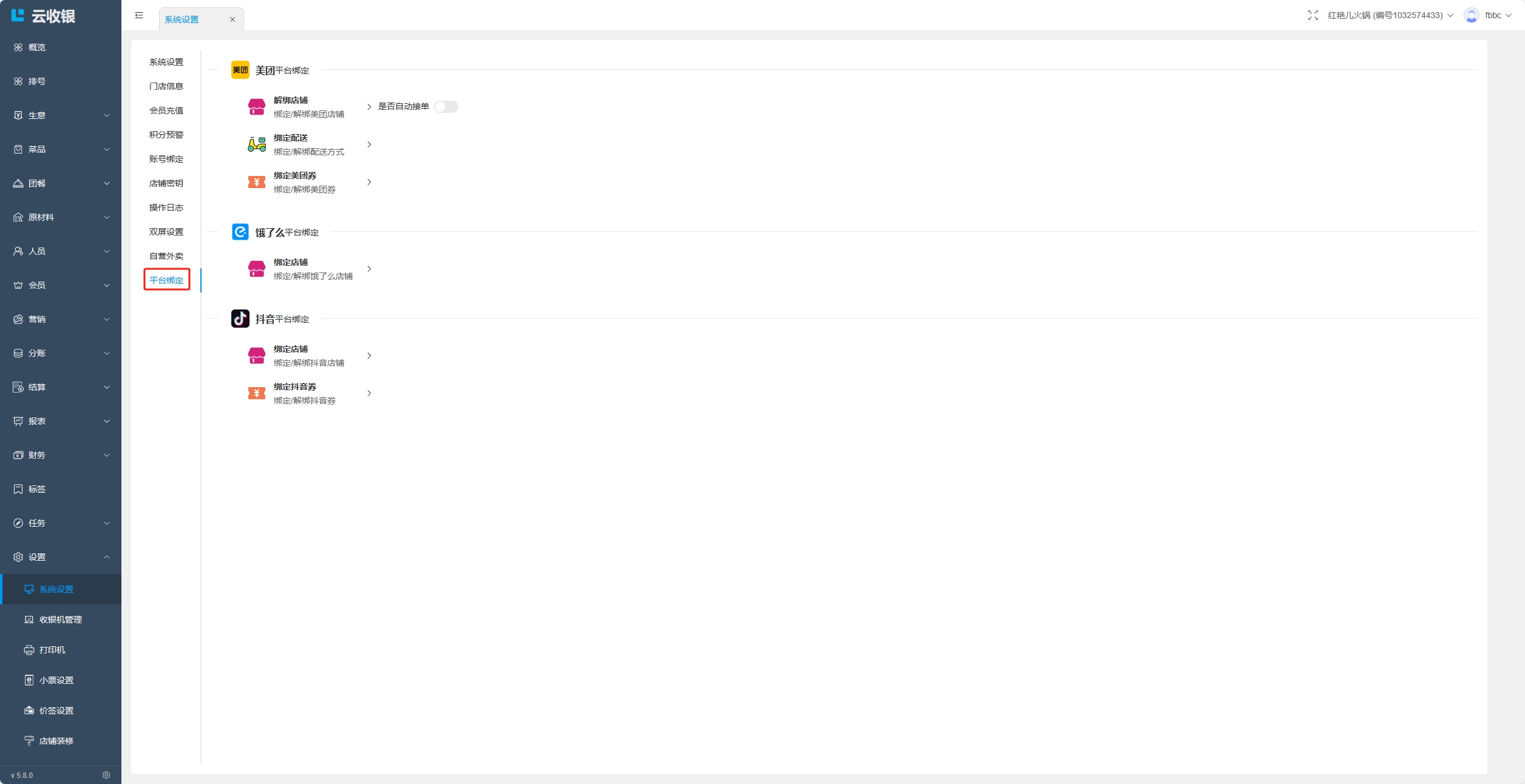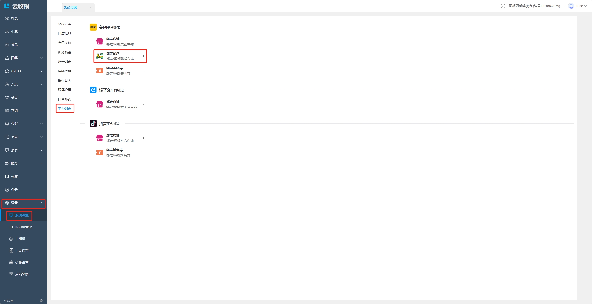 绑定美团、饿了么和抖音平台的店铺、配送、券;