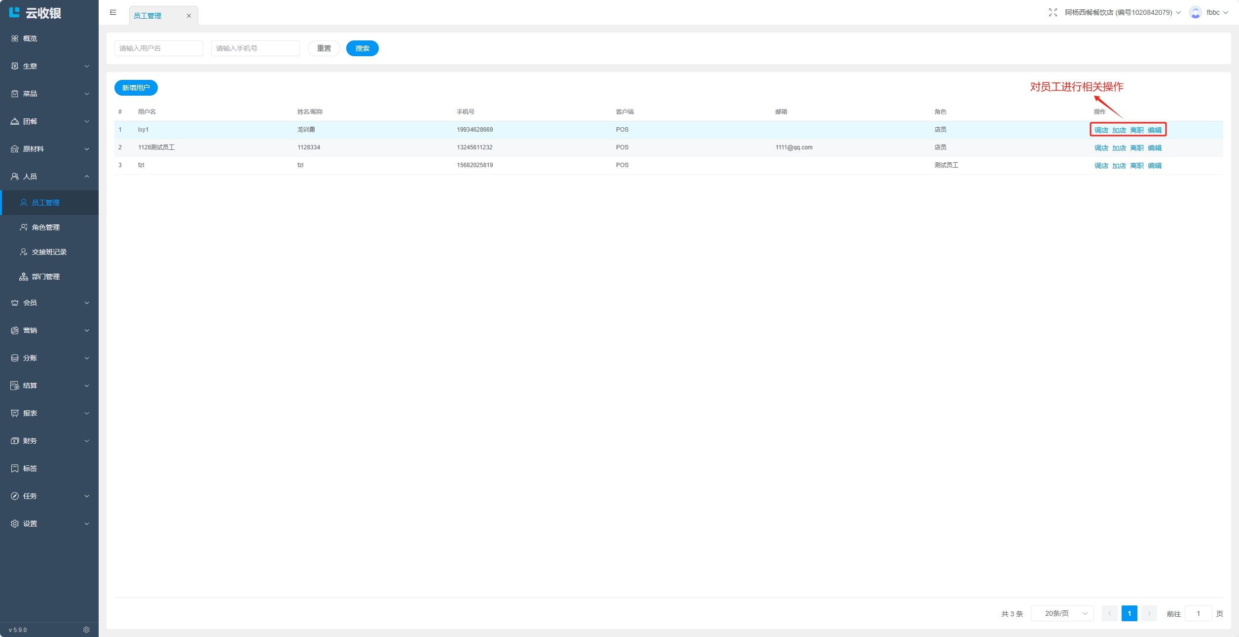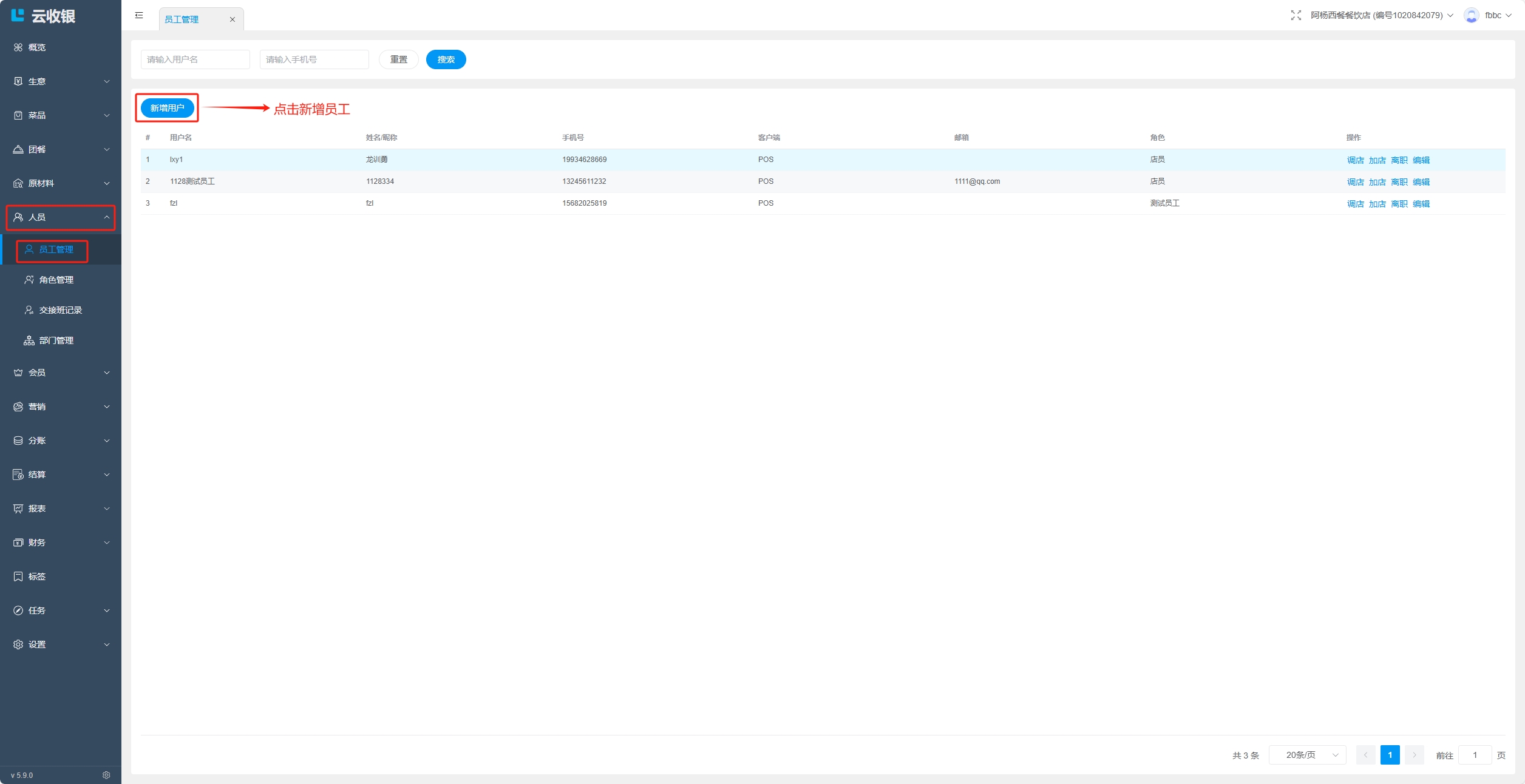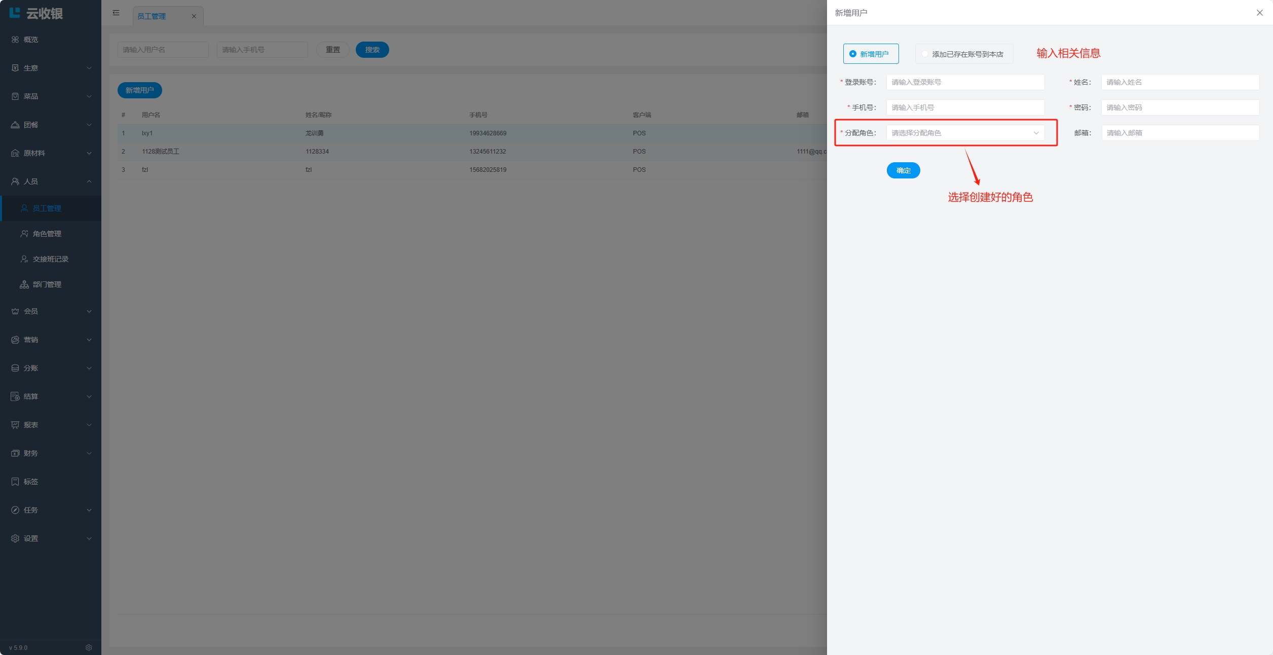 创建员工账号,指定员工角色,如果提示手机号已经注册过,则选择添加已存在账号到门店;