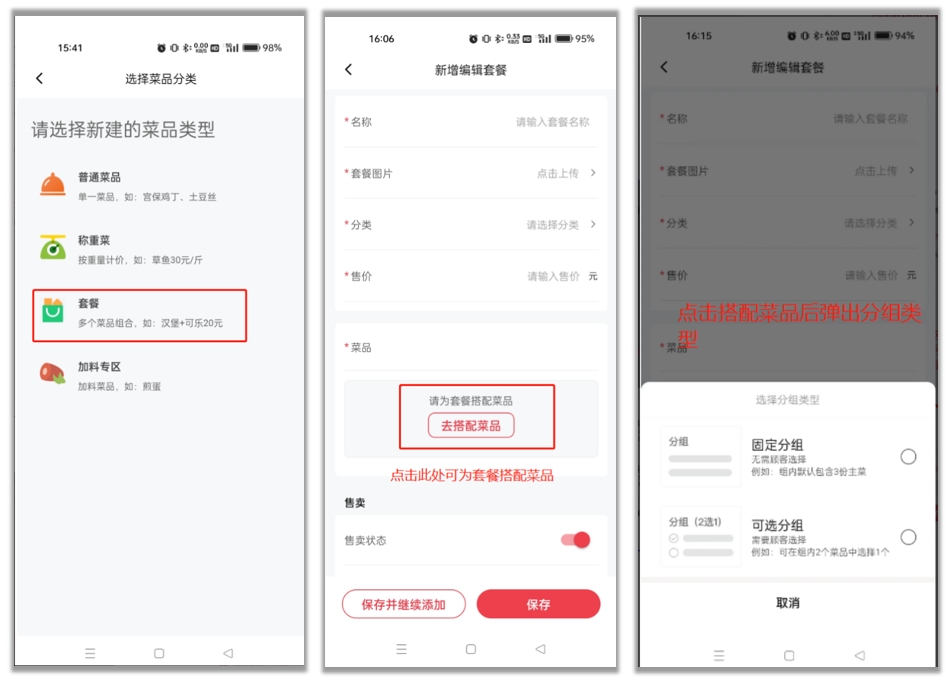 套餐支持固定搭配和可选搭配两种: