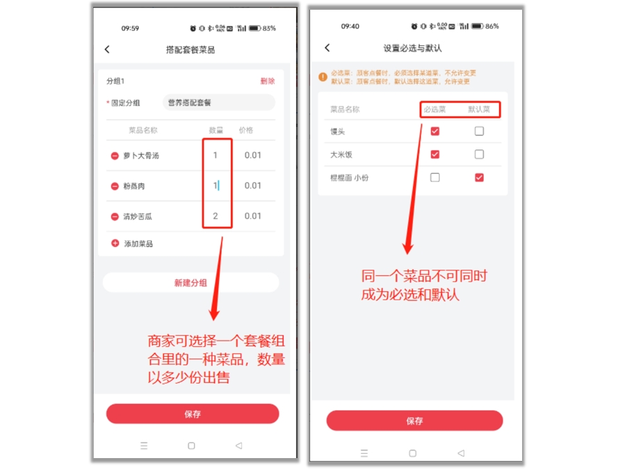 - 固定搭配:套餐包含固定数量的菜品,不可选;