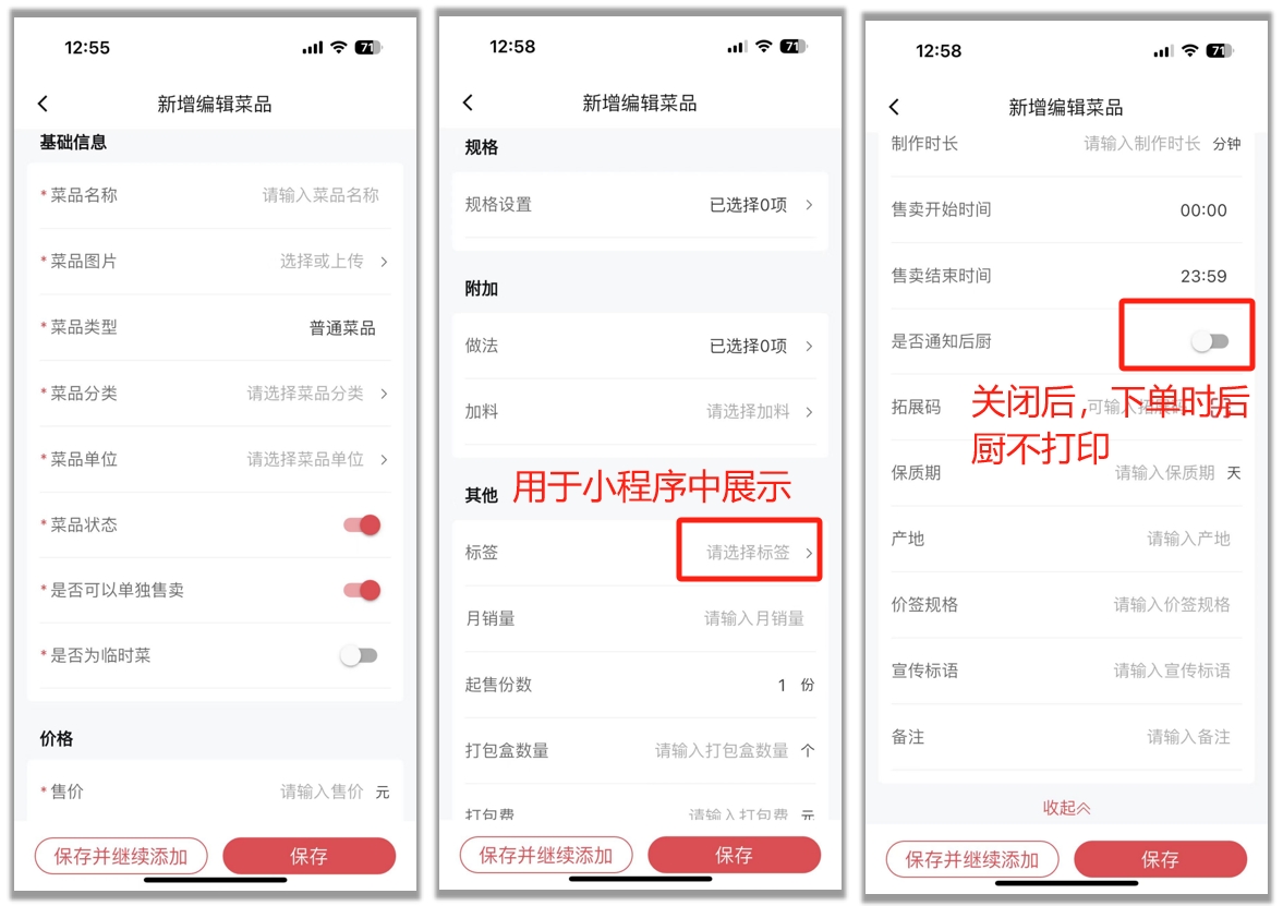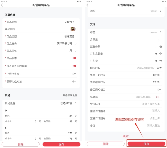 菜品配置完成后,点击【保存】返回上级页面,如果有多个菜品需要新建,点击【保存并继续添加】可保存好上一个菜品后,仍留在当前页面继续新建菜品;