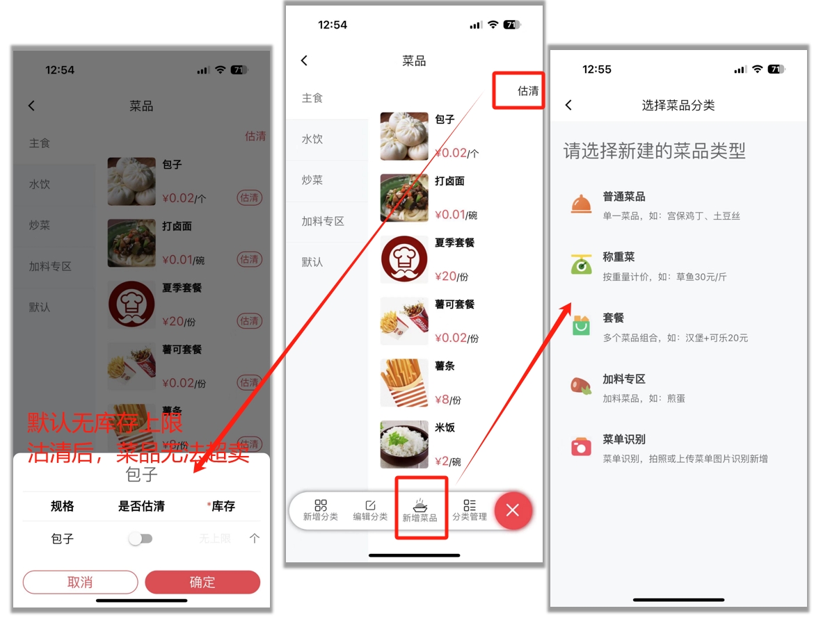 - 菜品沽清:菜品列表中,可以对菜品进行沽清操作,默认不限库存销售;