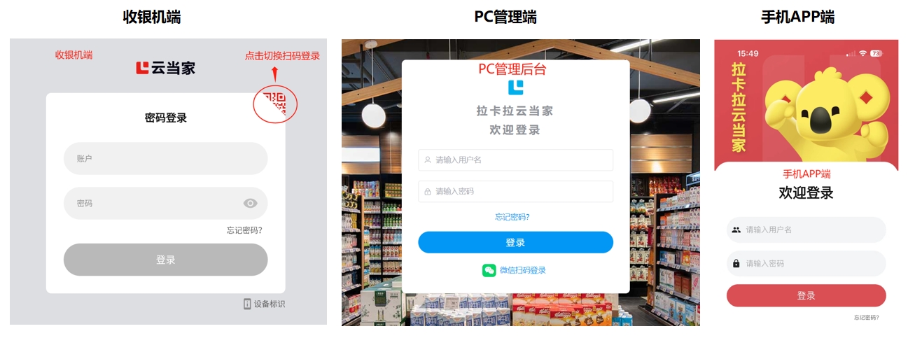 【收银机端】和【PC管理端】,支持使用账号密码登录+微信扫码登录两种方式;