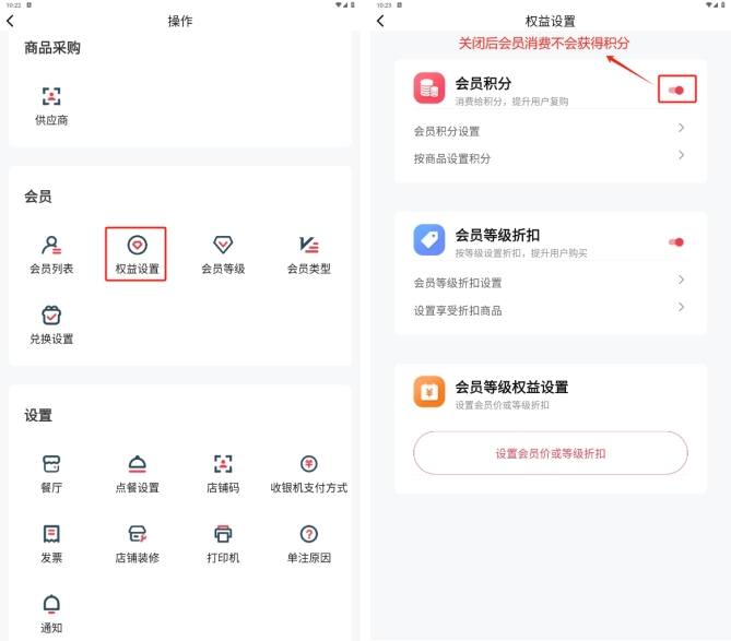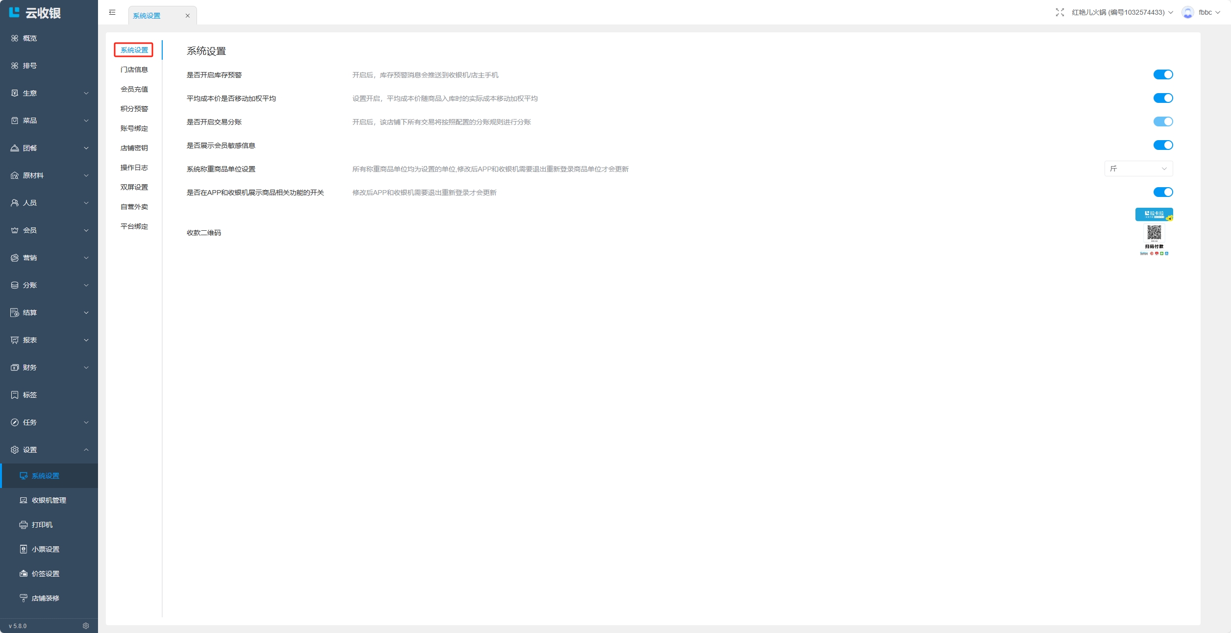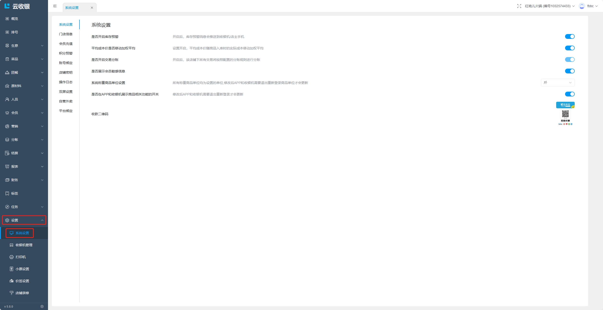 设置与系统相关的操作,如库存预警、会员敏感信息、称重商品单位等;
