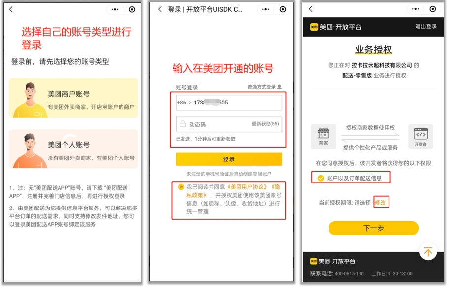 - 店主账号:店主使用申请开店时提供的手机号、密码登录;