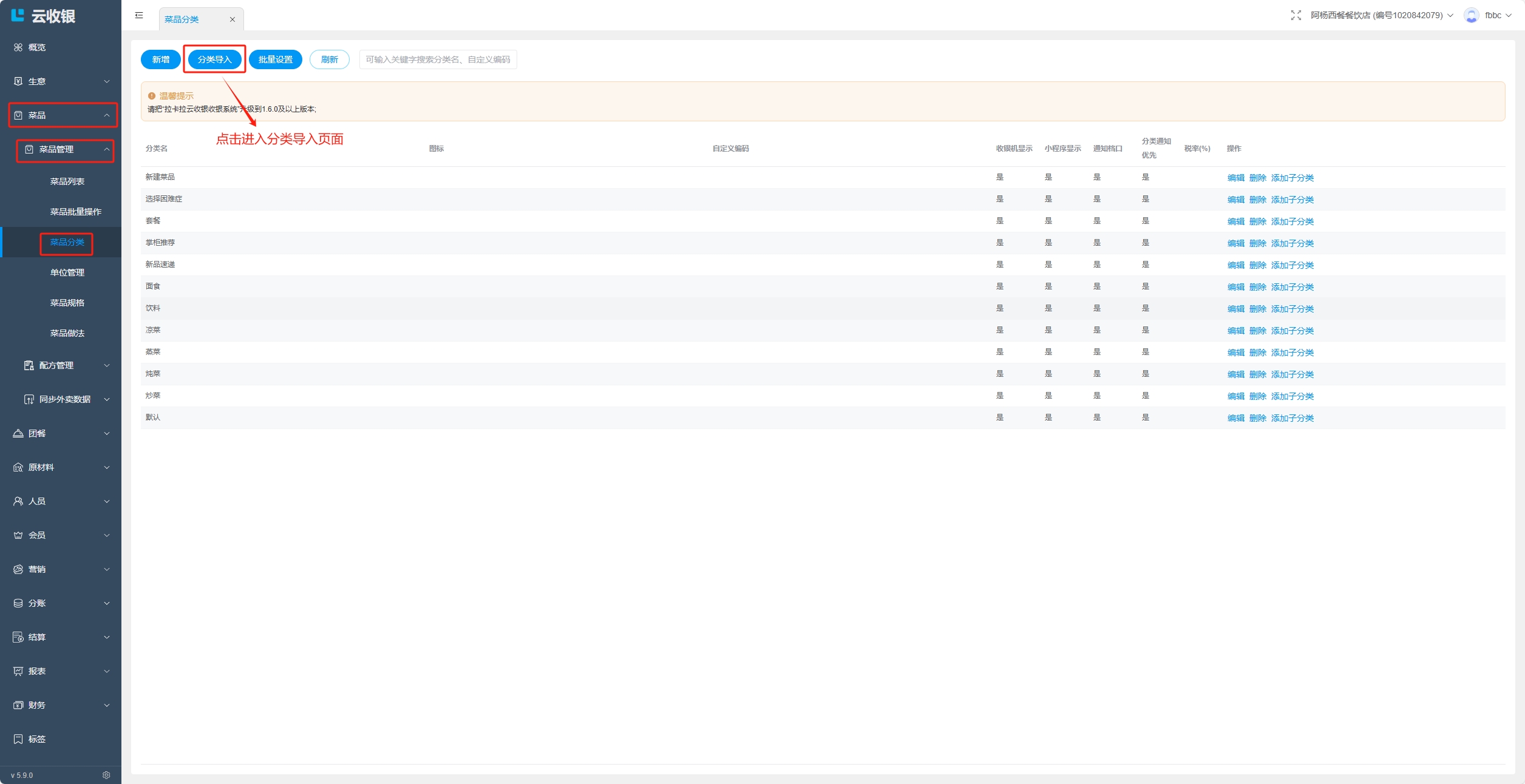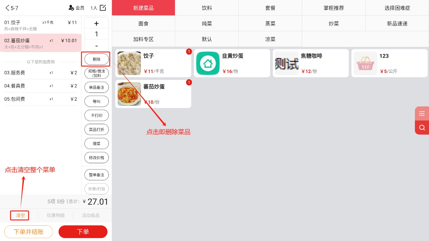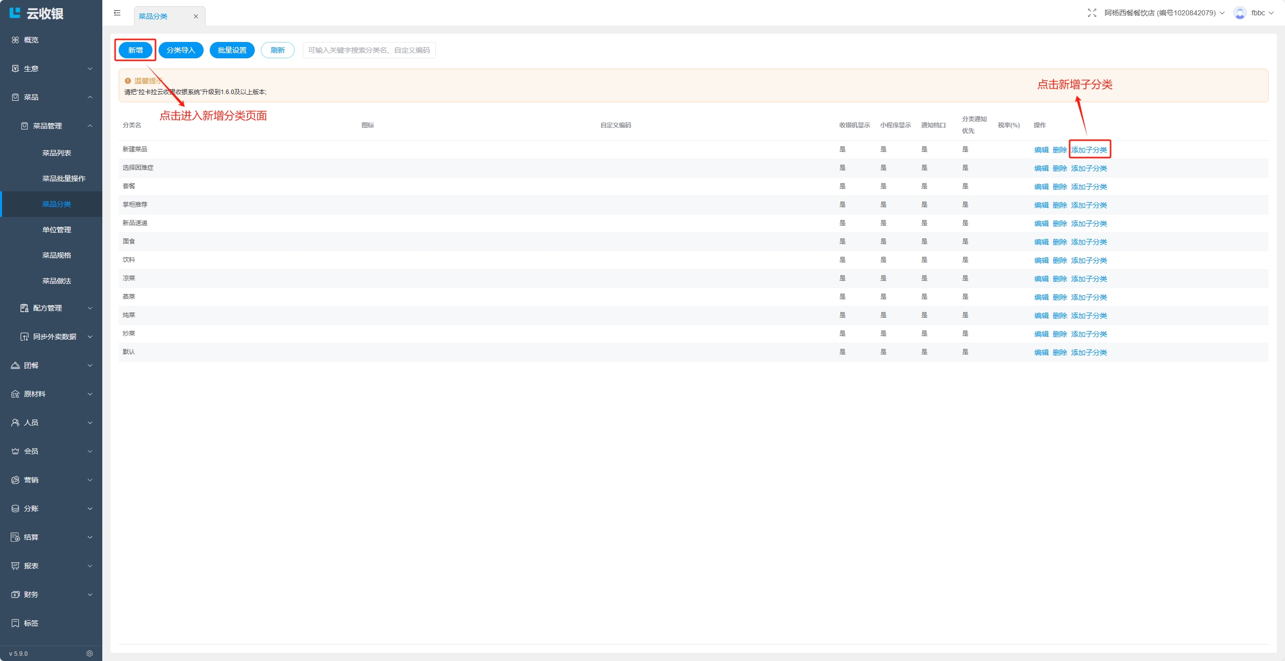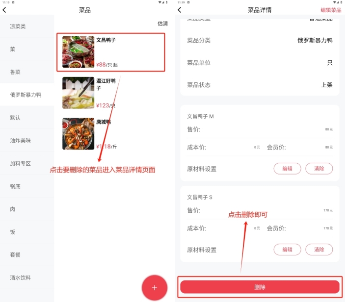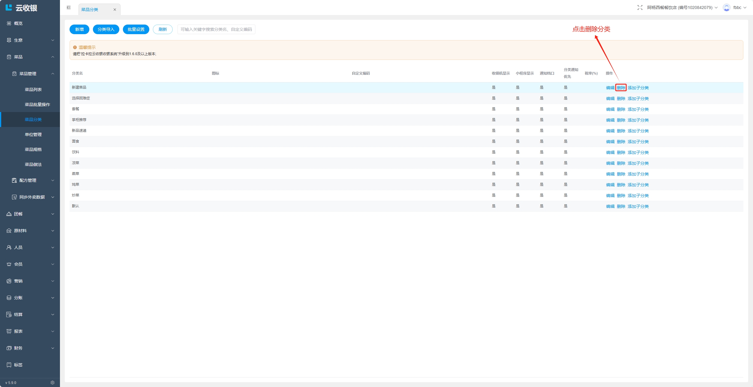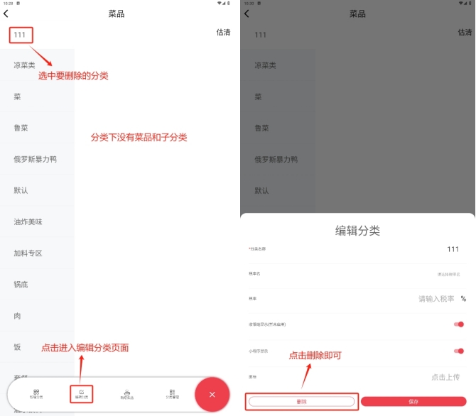 当分类存在下级分类,或者分类下存在菜品时,分类无法删除,删除需要按照如下操作处理: