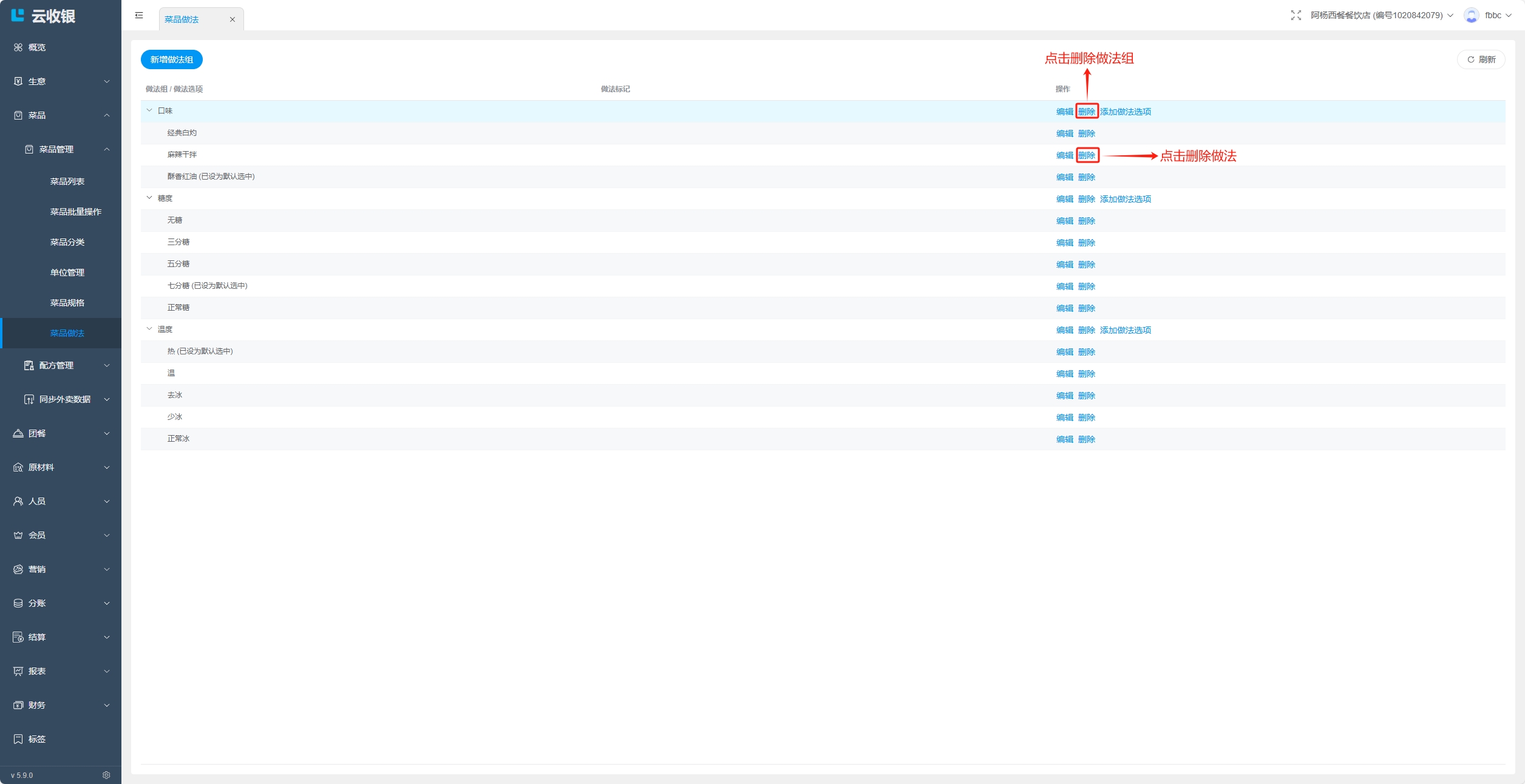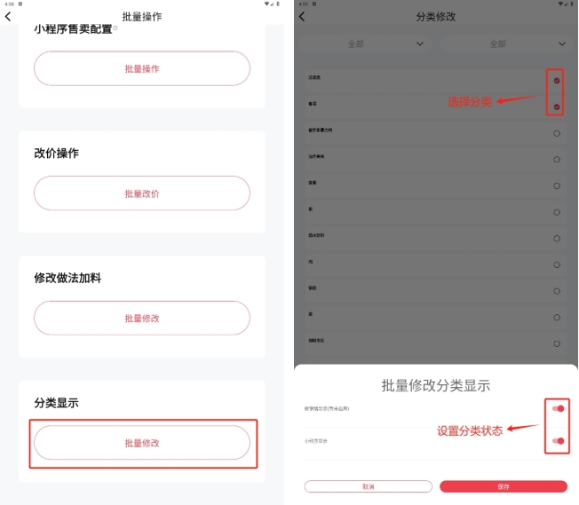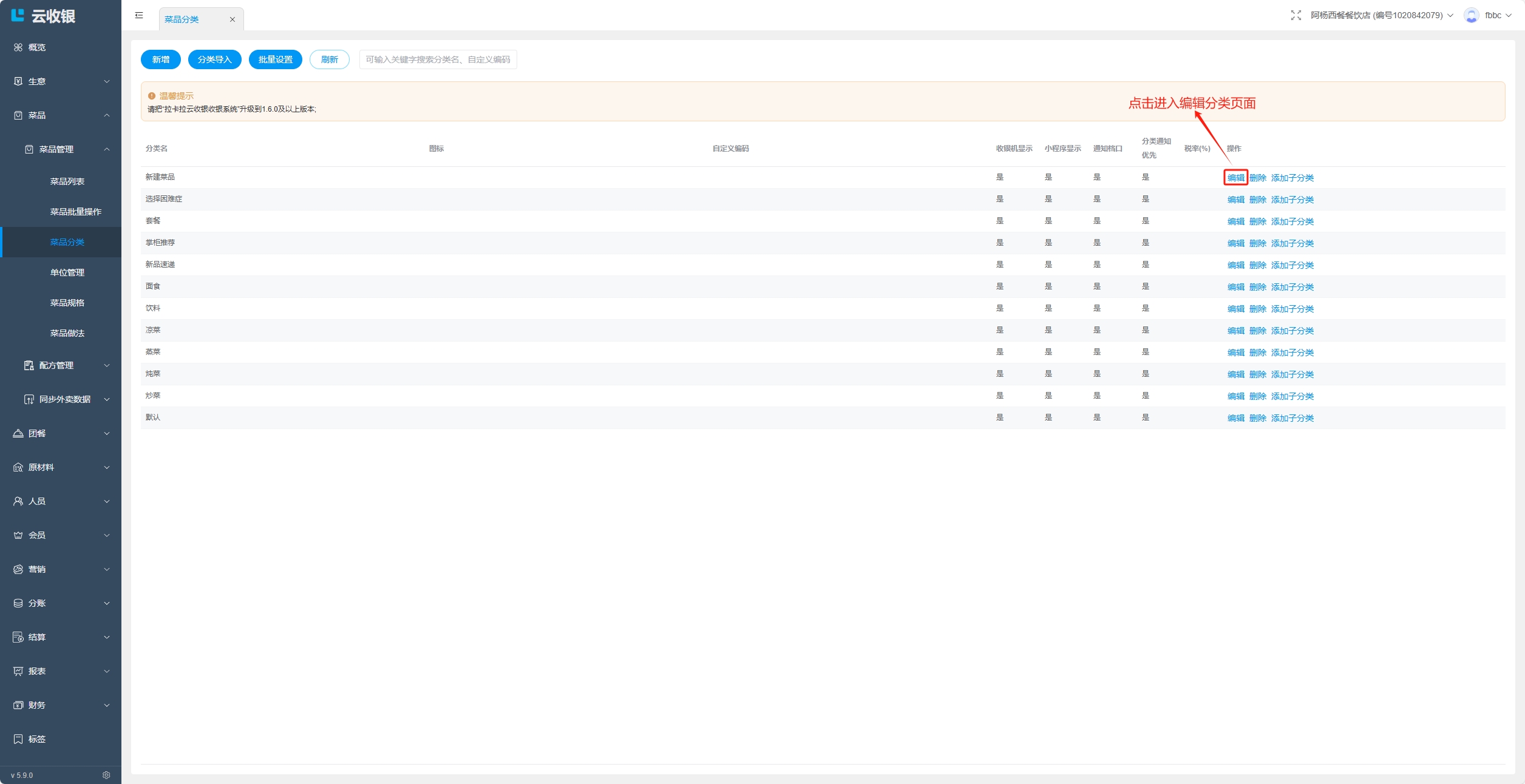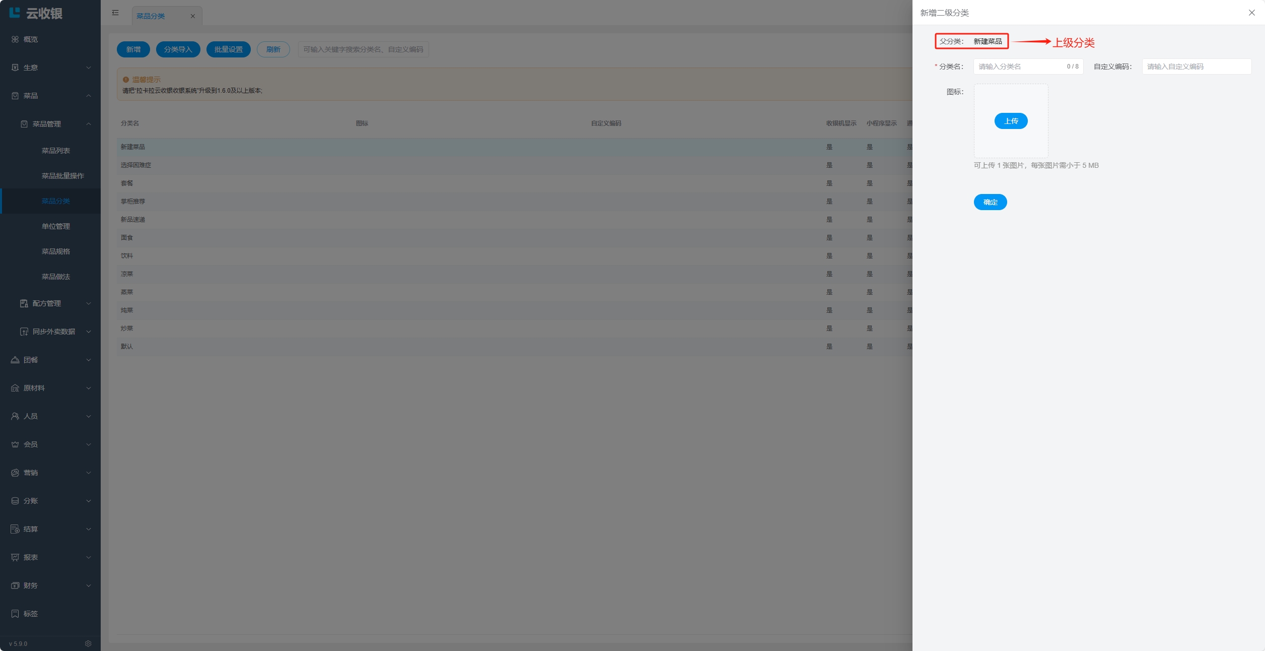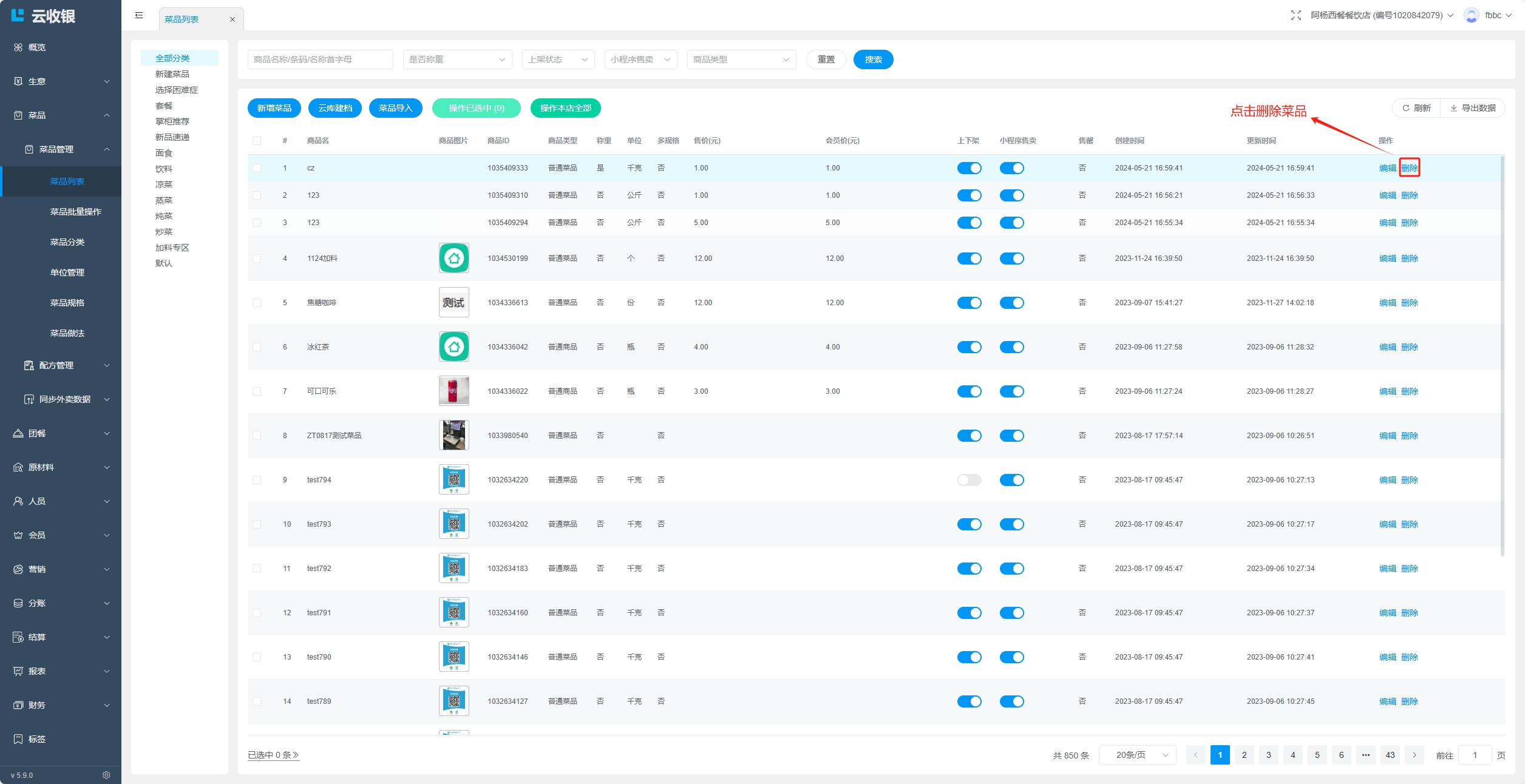 当分类存在下级分类,或者分类下存在菜品时,分类无法删除,删除需要按照如下操作处理: