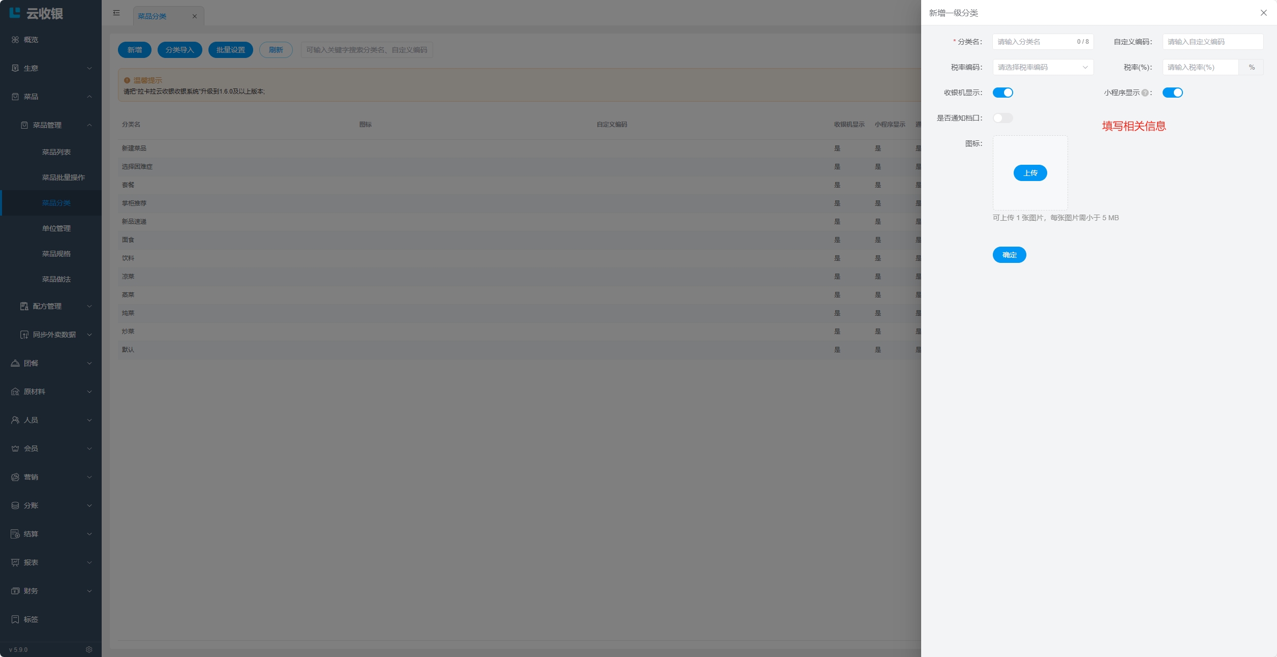 直接新增分类,需要一级一级的逐级创建,分类下无菜品时,用户的扫码点餐小程序将不展示此分类;