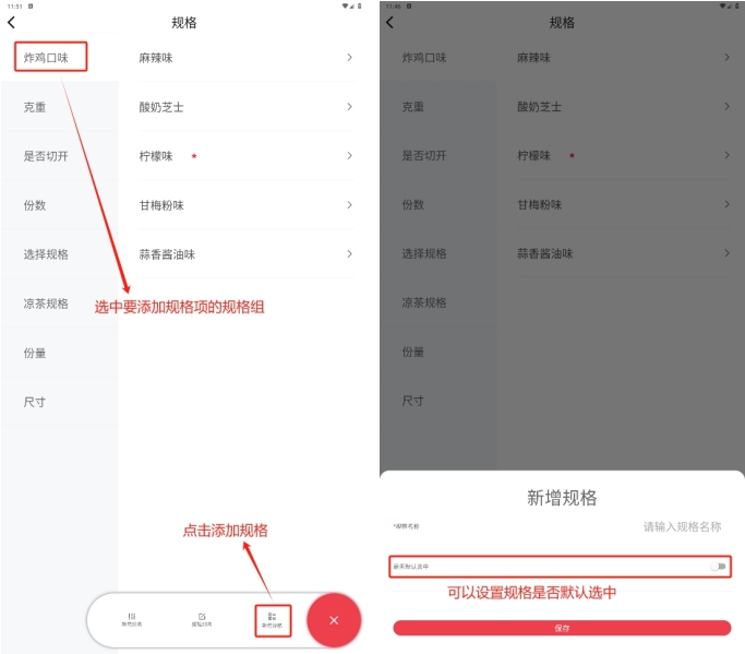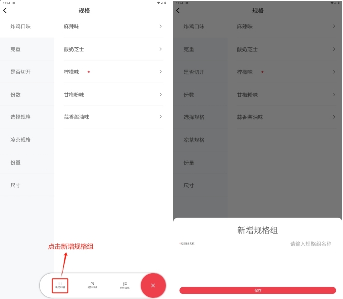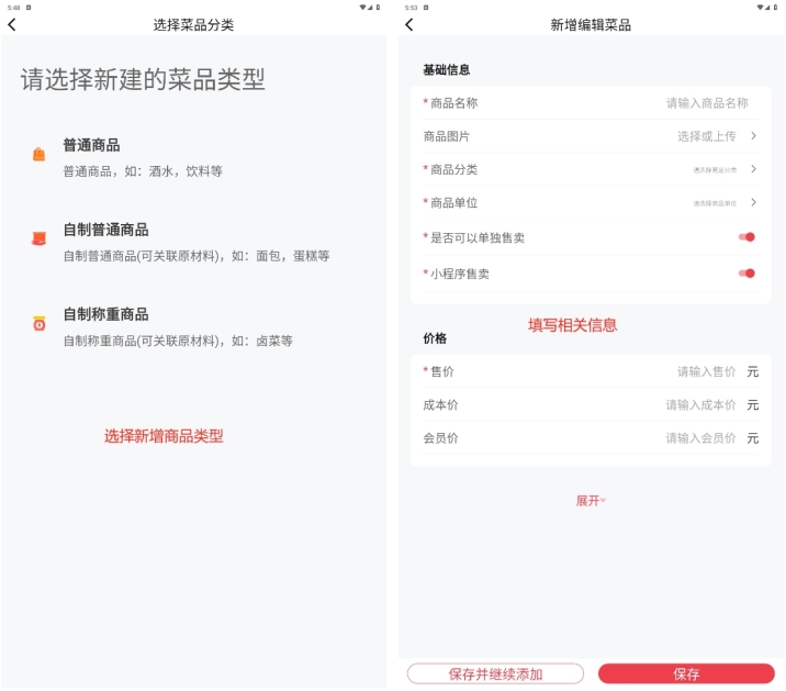 - 新增菜品:选择新增菜品类型进入创建页面:
