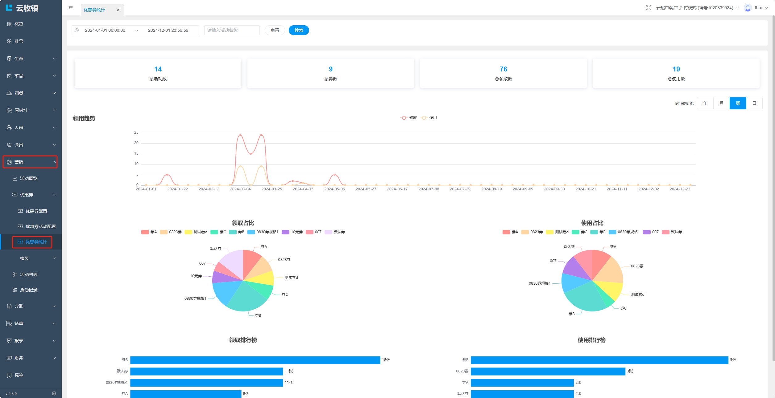 在优惠券统计中可以查看优惠券的领用趋势、领取占比等相关信息;