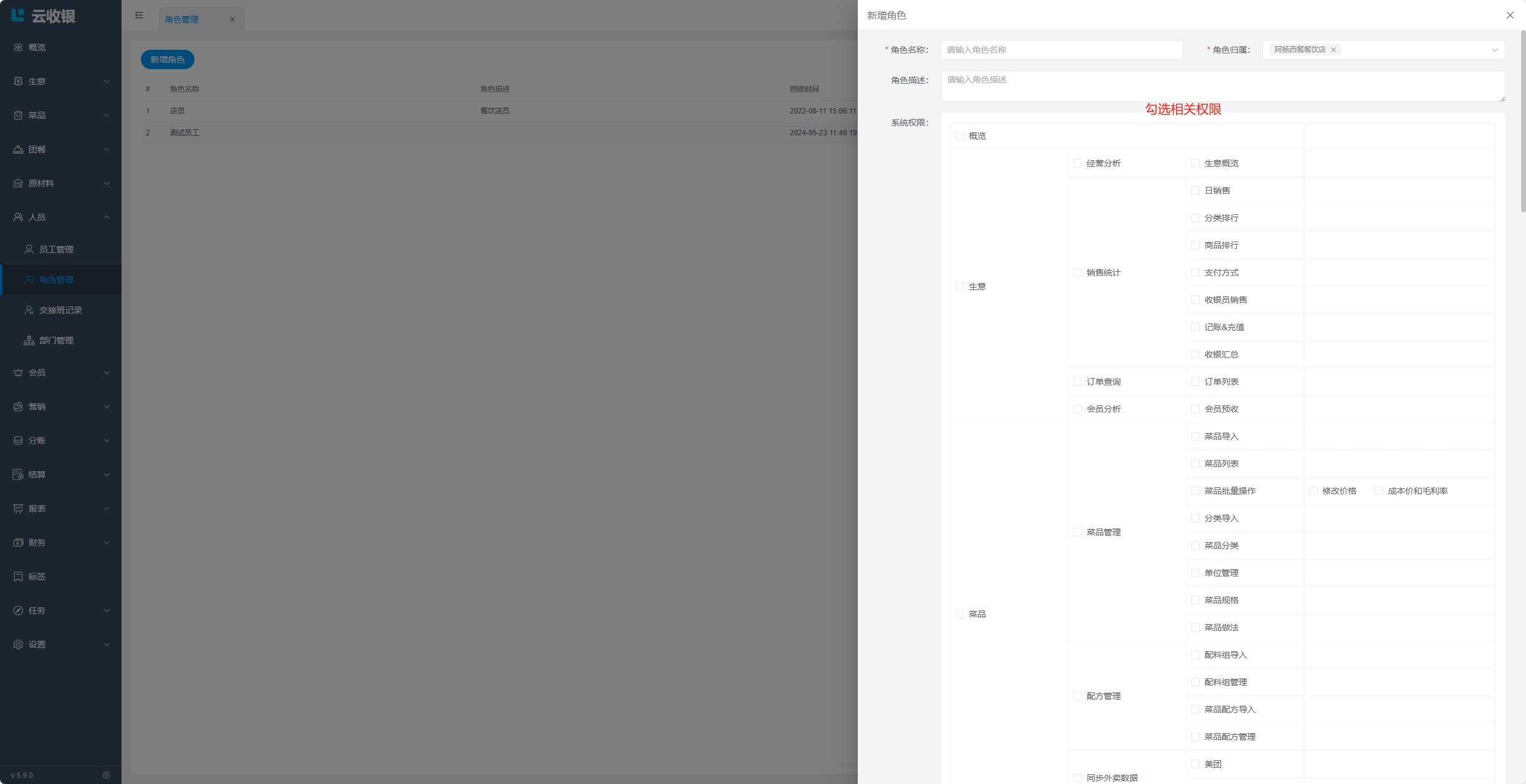 创建员工角色,并为角色分配各个端的操作权限;