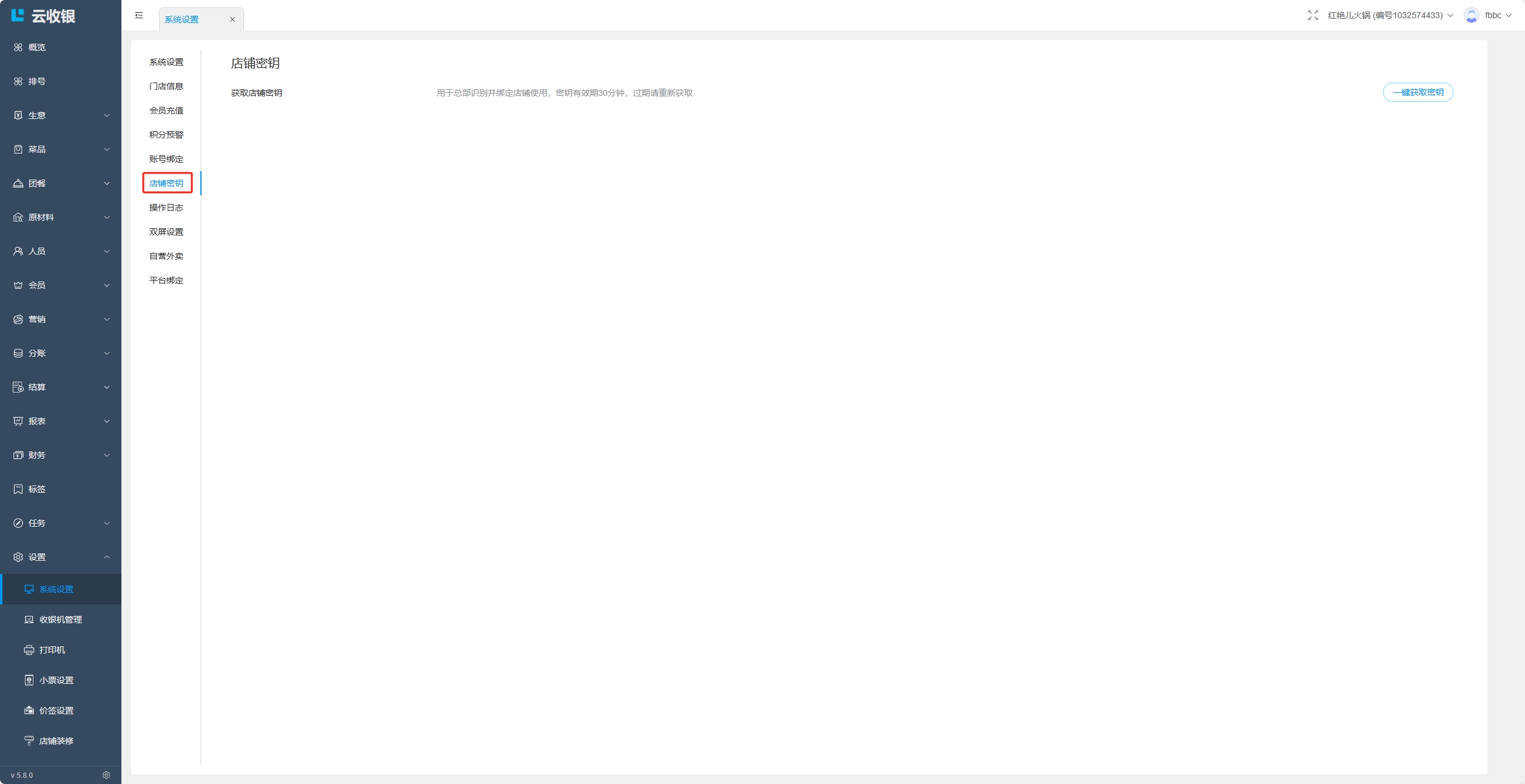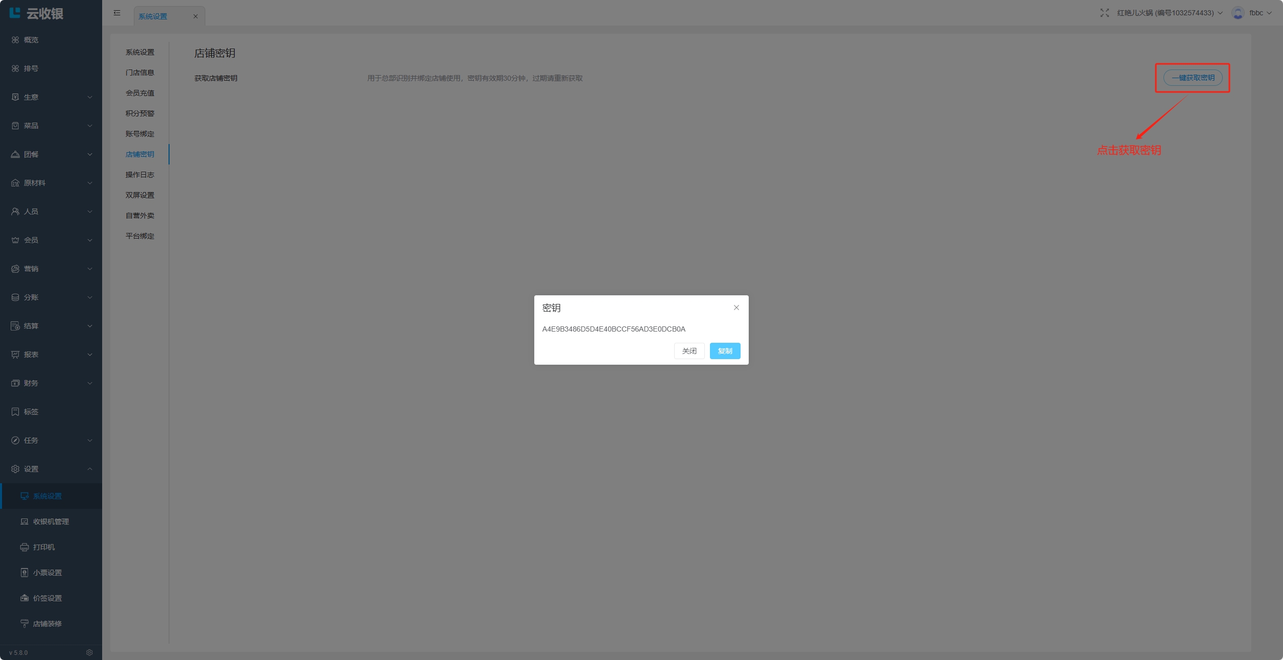 获取的密钥用于总部识别并绑定店铺使用,密钥的有效期为30分钟,过期需要重新获取;