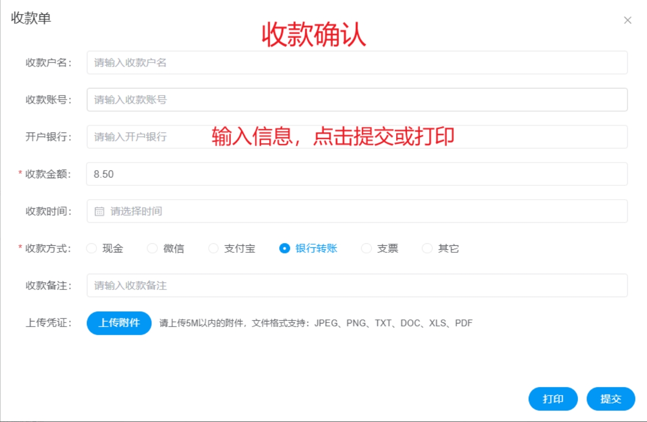 收款确认记录实收金额,结束收款记录免收金额;