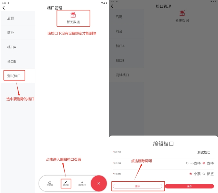 当前档口下绑定了设备时,不可删除,需要先解绑设备再进行删除;