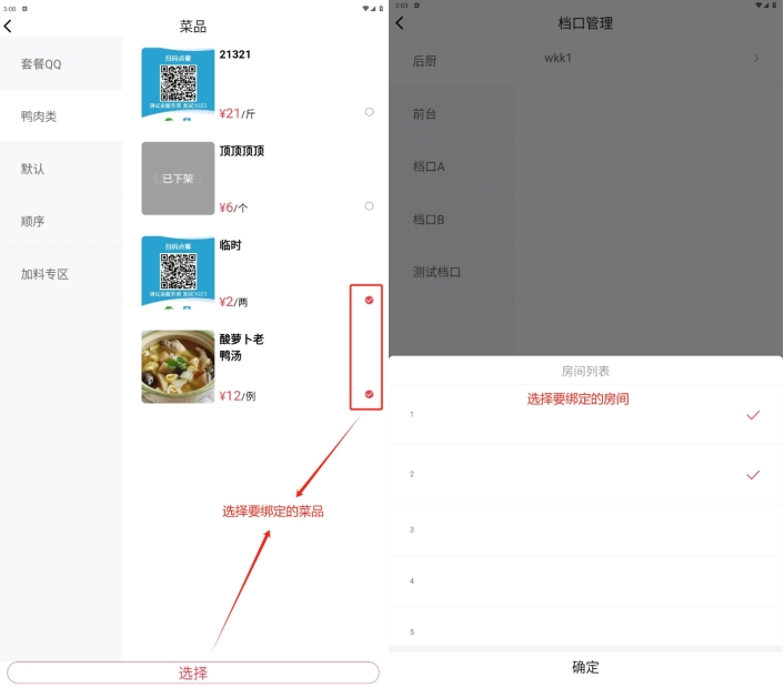 - 绑定菜品:选择菜品完成绑定,绑定后,该菜品的订单通过当前打印机打印